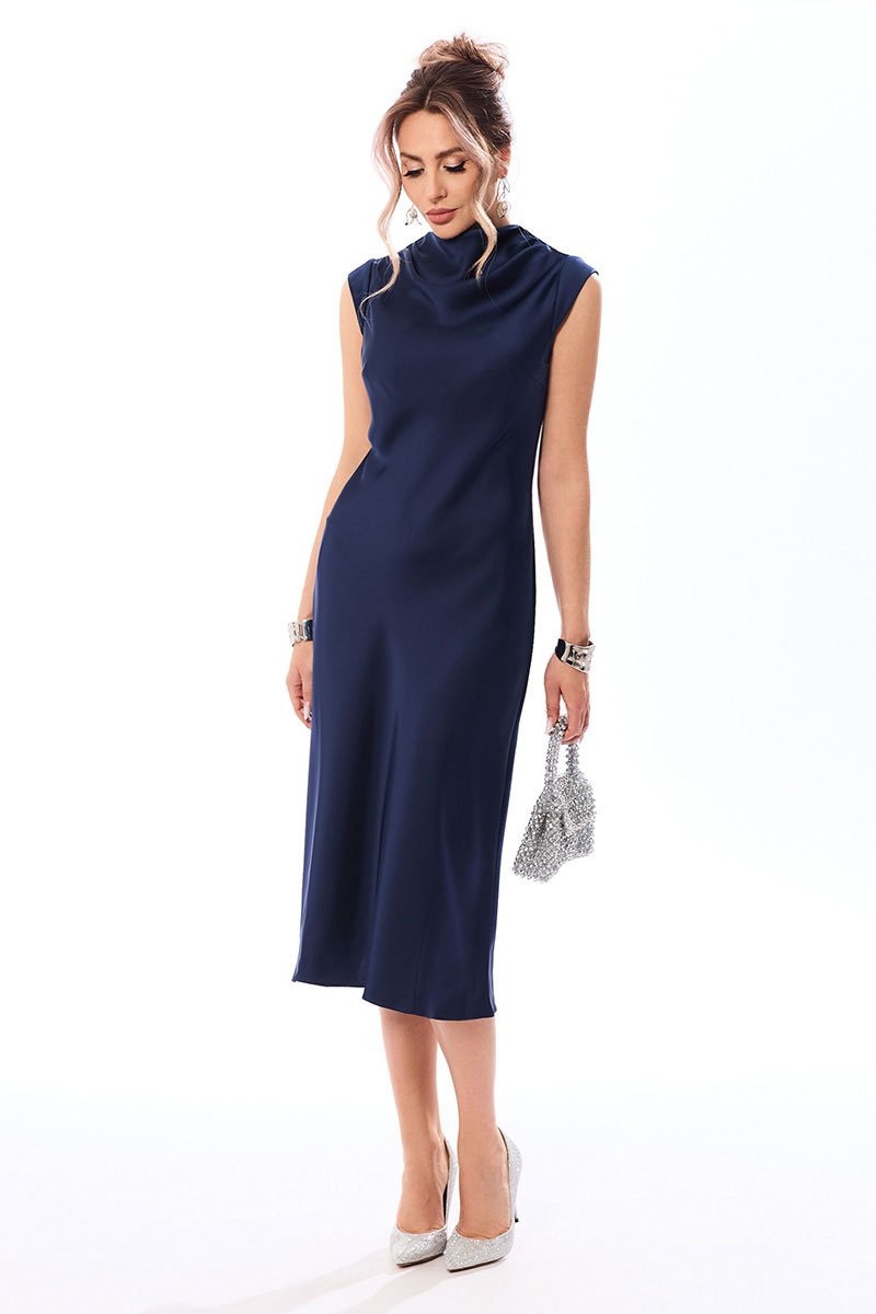 Платье без воротника,с фигурной драпировкой по горловине переда, застежкой на навесную петлю и пуговицу в среднем шве спинки. По переду с нагрудными вытачками. Спинка со средним швом, талиевыми вытачками. Рукав -крылышко.