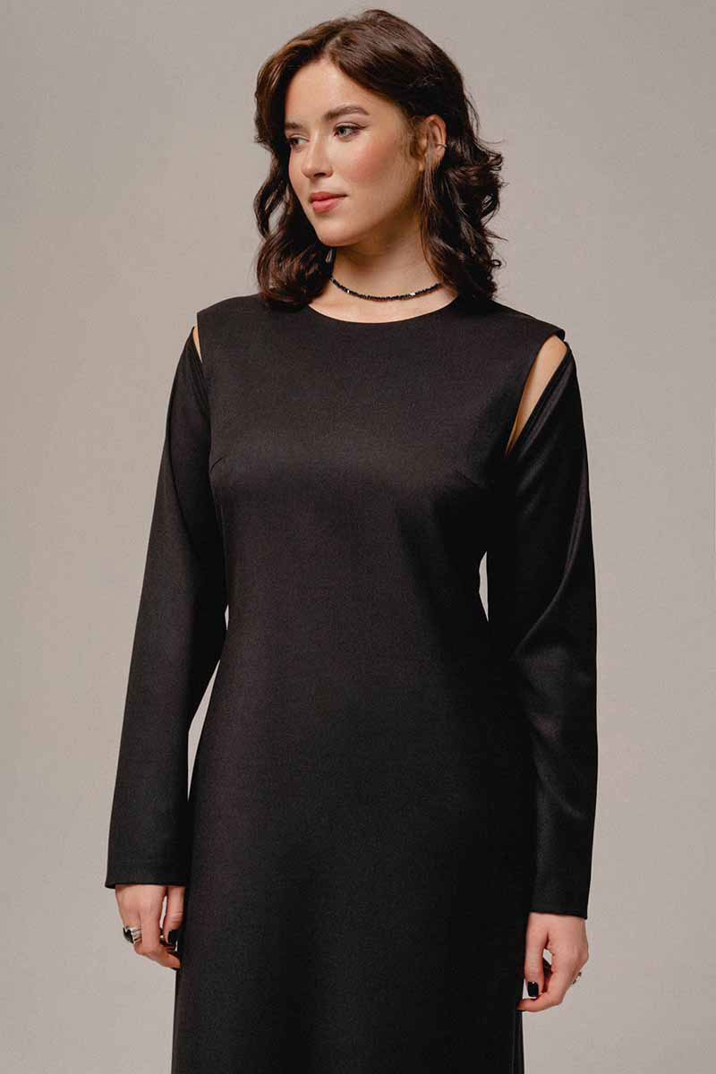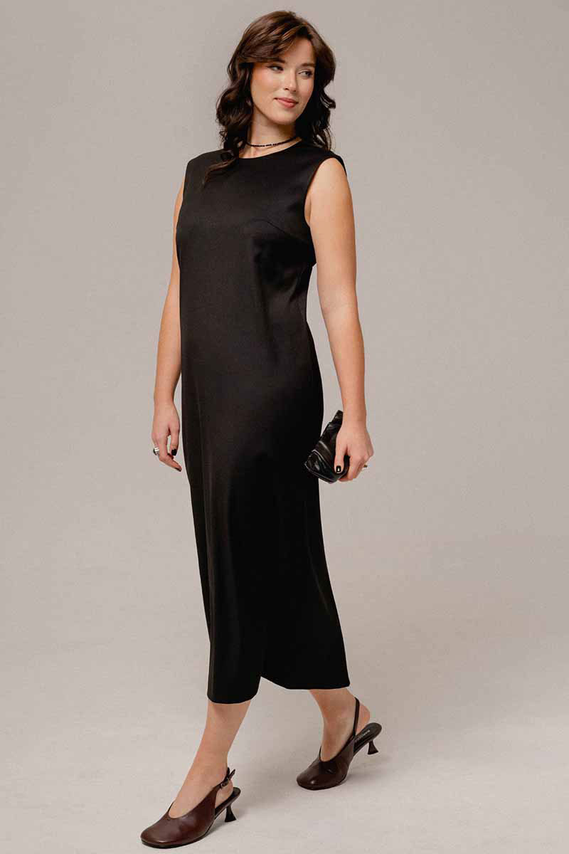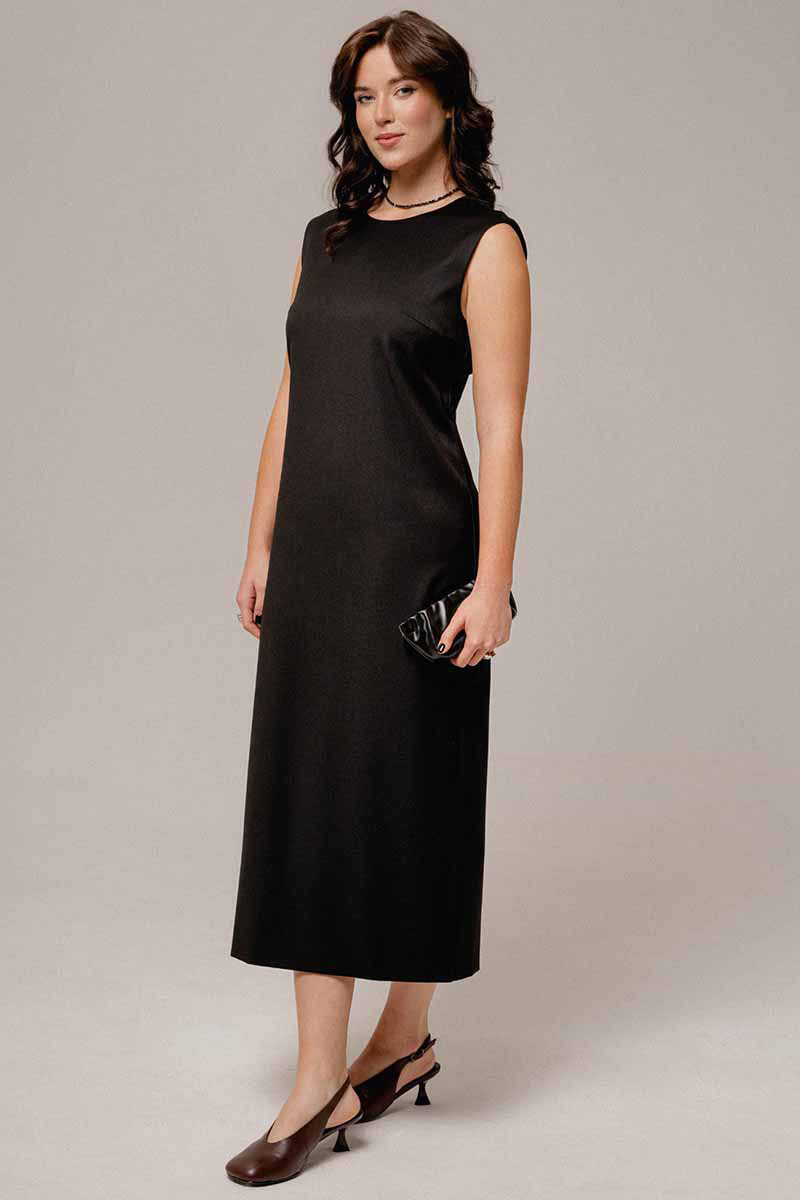 Платье женское полуприлегающего силуэта, с застежкой молнией в среднем шве спинки, с рукавами рубашечеого типа, пристегиваются к изделию на навесную пуговицу и петлю. Спинка изделия с талиевыми вытачками. Длина миди.