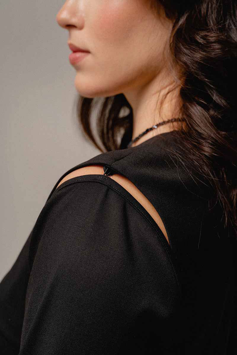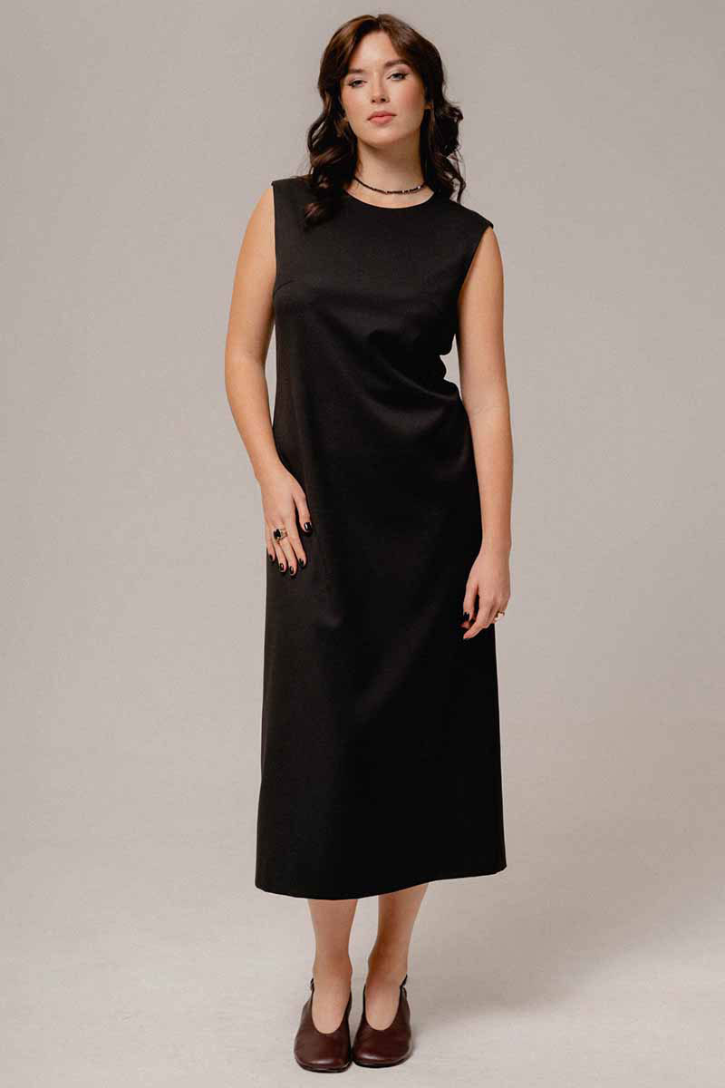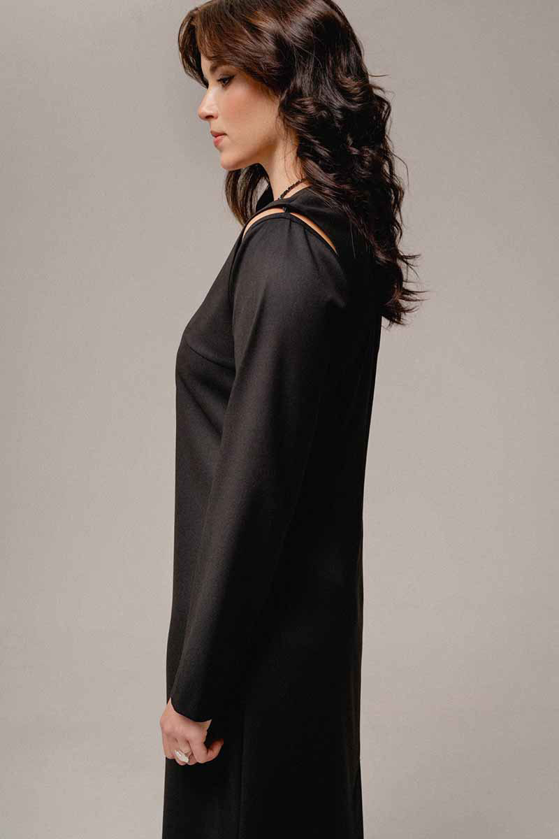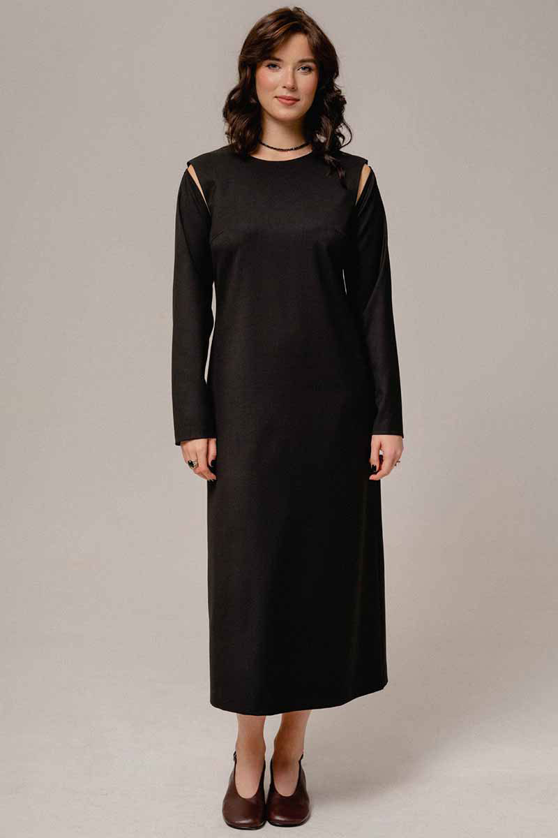 Платье женское полуприлегающего силуэта, с застежкой молнией в среднем шве спинки, с рукавами рубашечеого типа, пристегиваются к изделию на навесную пуговицу и петлю. Спинка изделия с талиевыми вытачками. Длина миди.