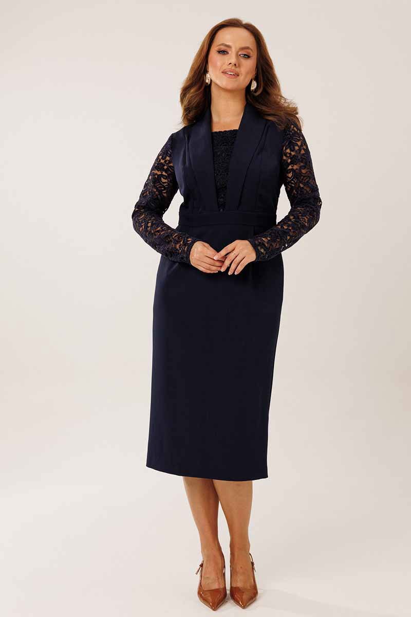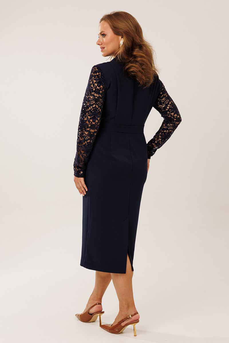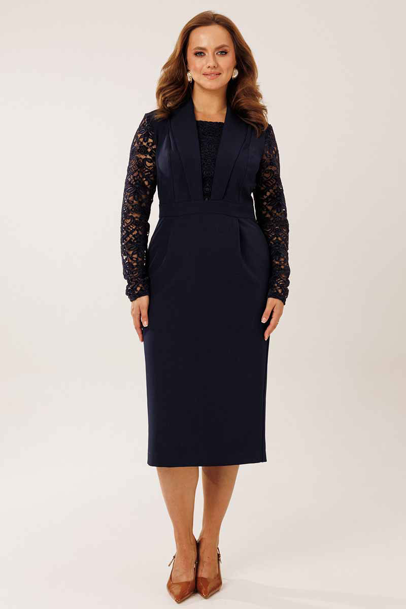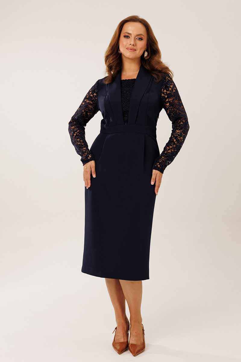 Платье женское нарядное полуприлегающего силуэта. Платье отрезное по линии талии. На полочке располагаются отрезные рельефные швы и центральная вставки из гипюровой ткани. Спинка платья со средним и рельефными швами. По переду отрезной юбки заложены 2 складки. По спинке отрезной юбки средний шов со шлицей и 2 вытачками. Горловина платья обработана отрезным воротником шалевого типа.