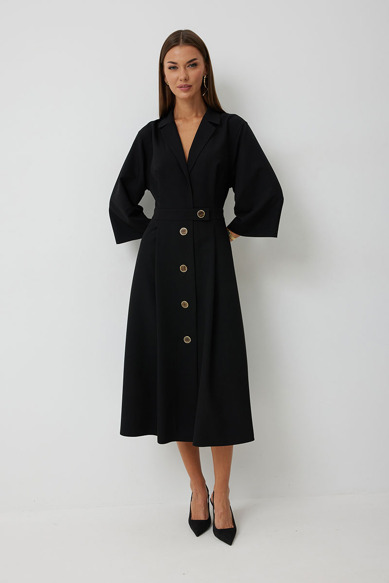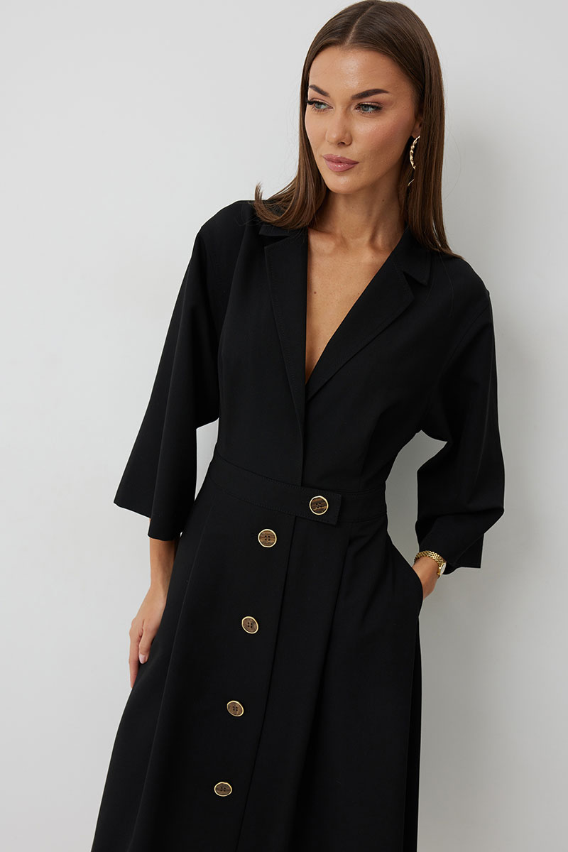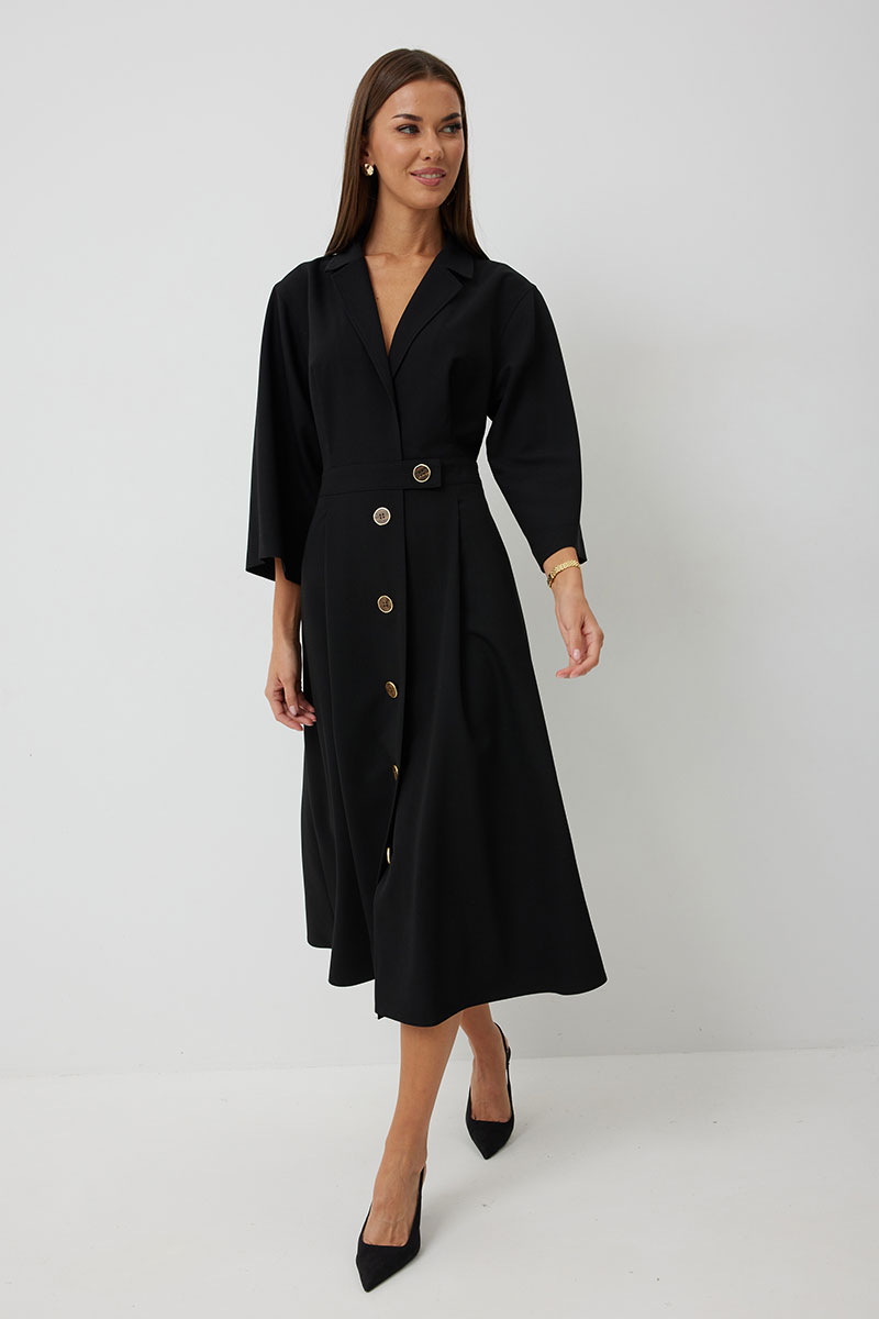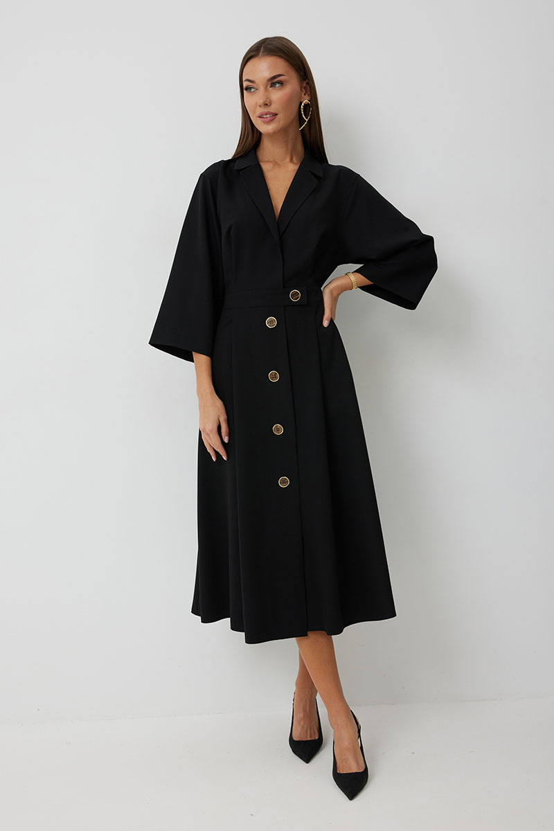 Платье женское полуприлегающего силуэта, отрезное по линии талии с застежкой по центральной части переда на декоративные пуговицы. Платье длиной до середины икры. По отрезному лифу с юбке полочки и спинки заложены складки. Лиф с юбкой соединены втачным поясом, по которому прострочена отделочная строчка. Рукав втачной прямой до середины локтя. По пройме прострочена отделочная строчка. Горловина платья обработана втачным воротником с отложными лацканами.