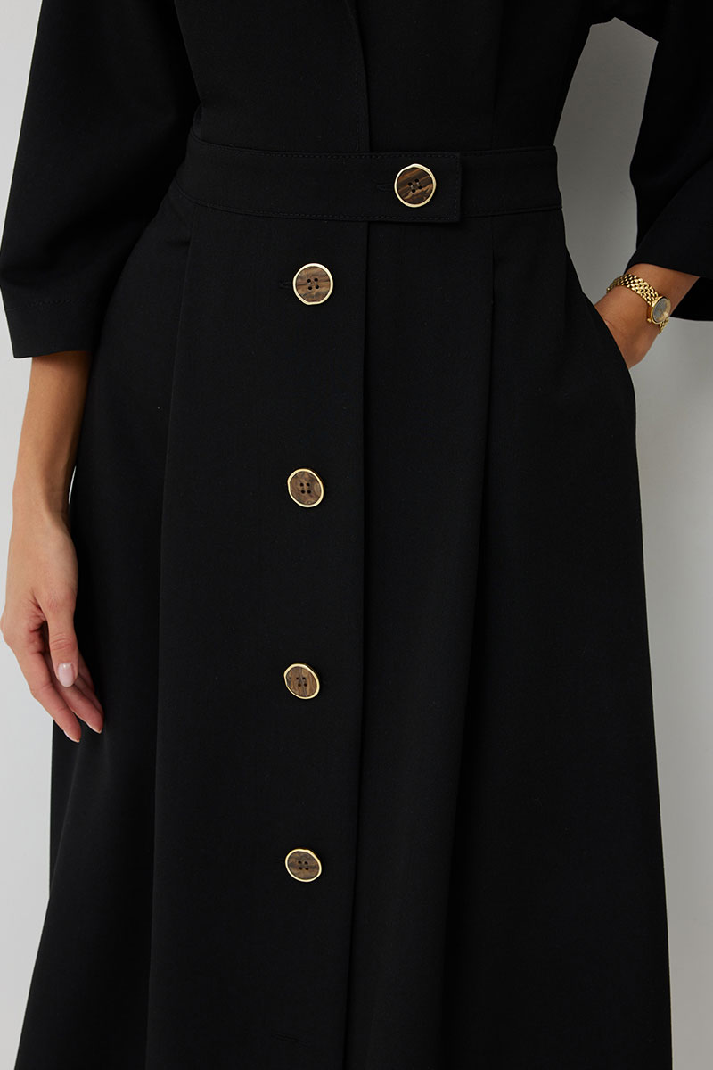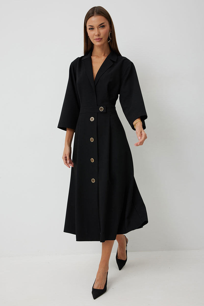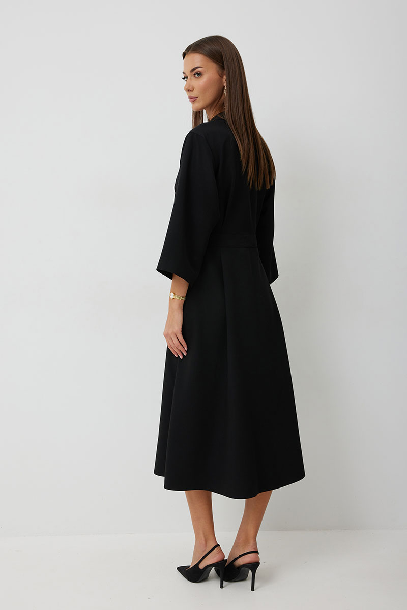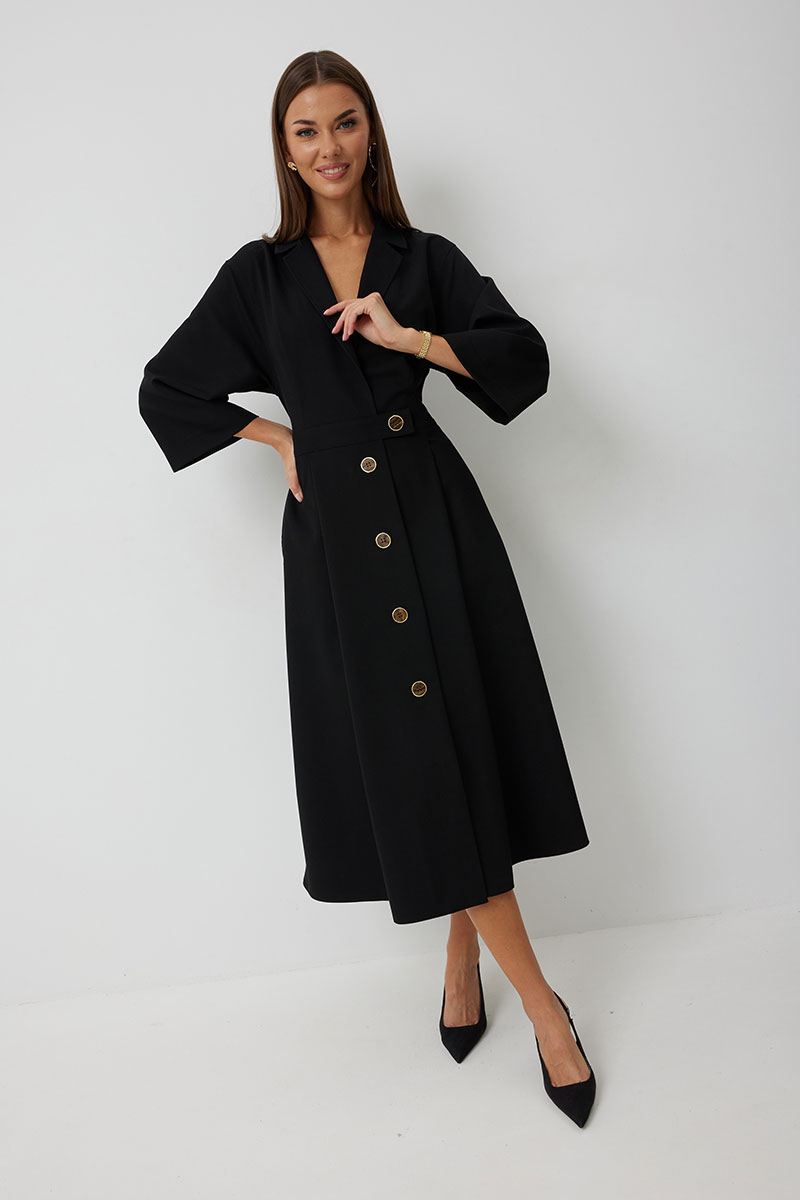 Платье женское полуприлегающего силуэта, отрезное по линии талии с застежкой по центральной части переда на декоративные пуговицы. Платье длиной до середины икры. По отрезному лифу с юбке полочки и спинки заложены складки. Лиф с юбкой соединены втачным поясом, по которому прострочена отделочная строчка. Рукав втачной прямой до середины локтя. По пройме прострочена отделочная строчка. Горловина платья обработана втачным воротником с отложными лацканами.