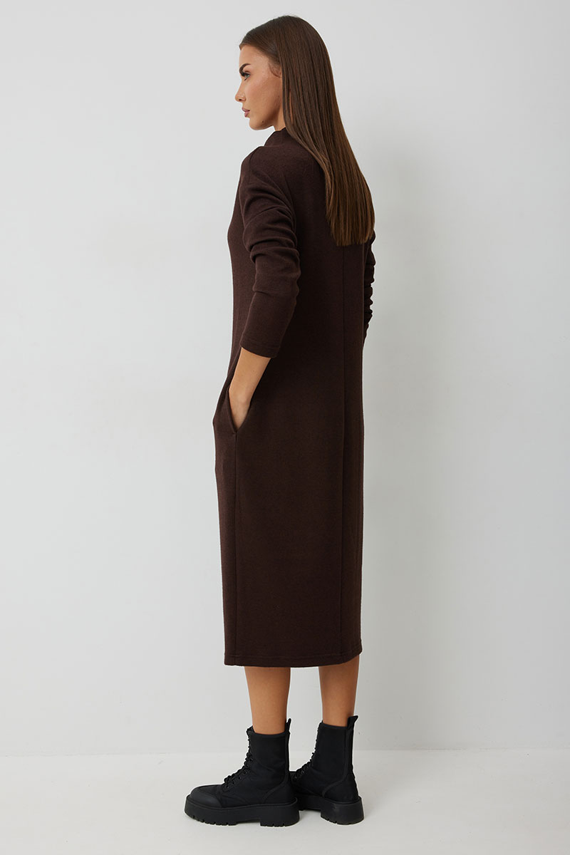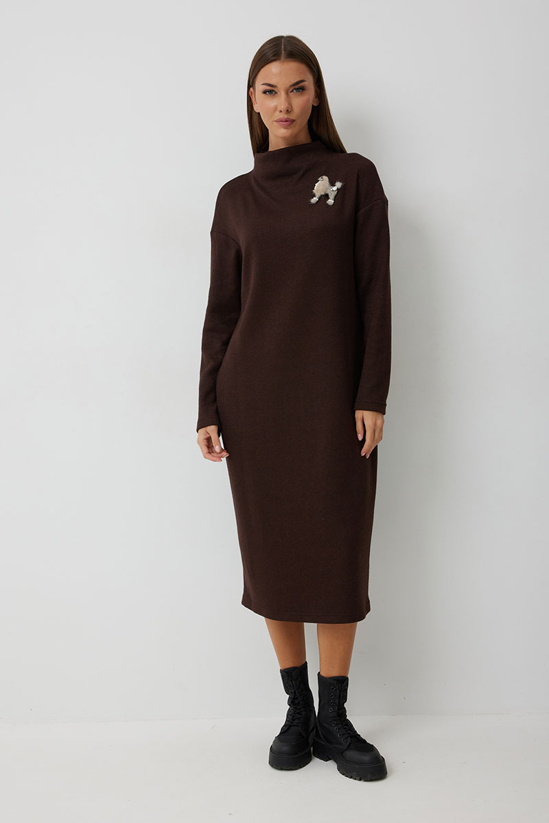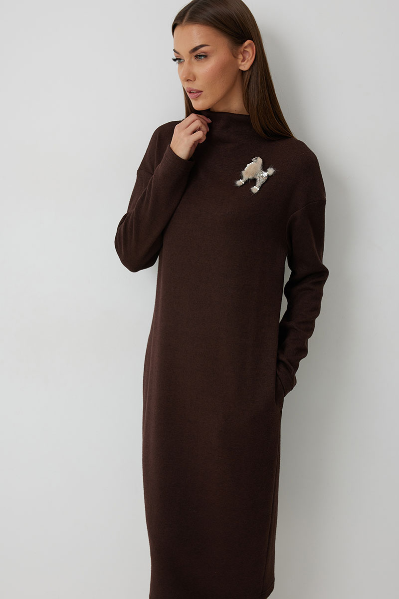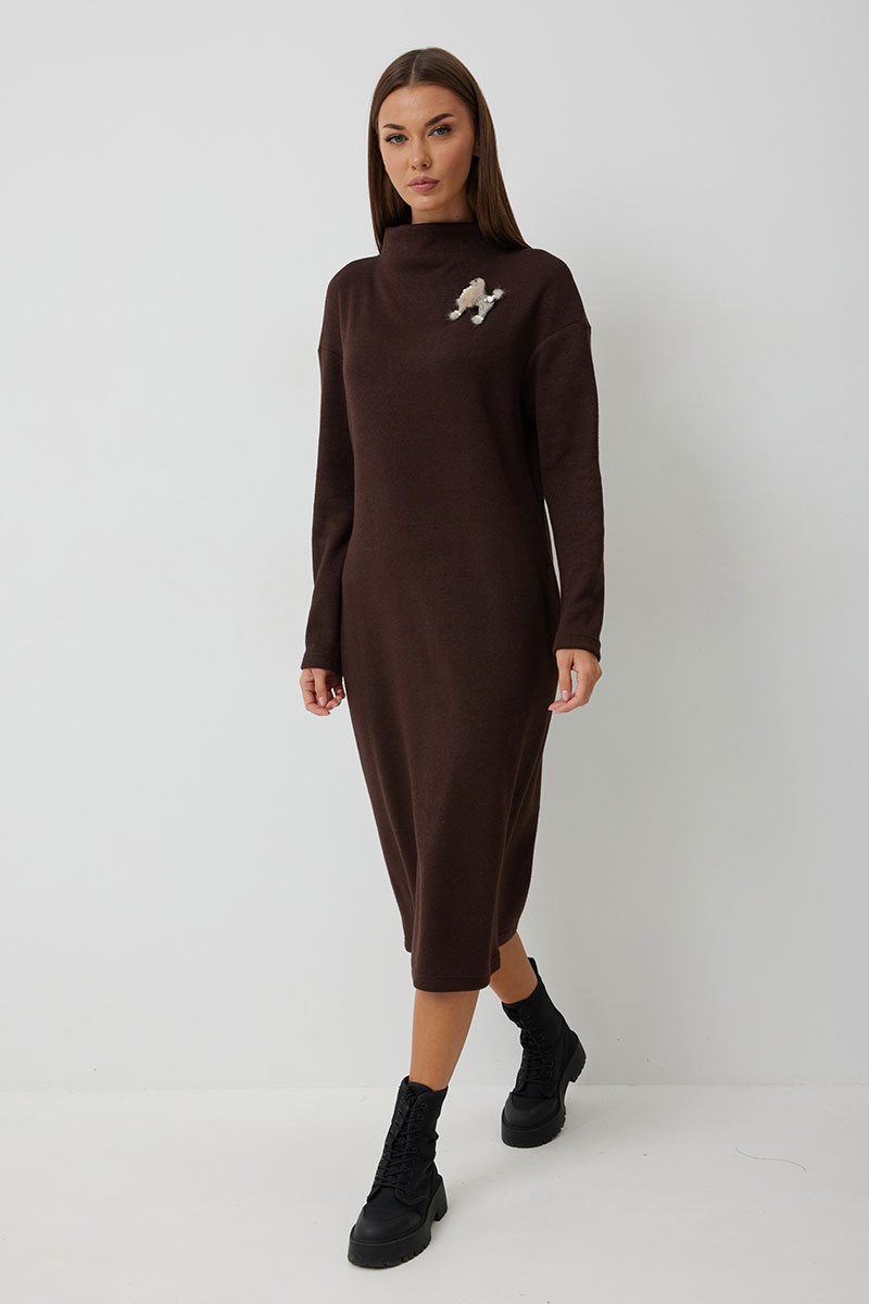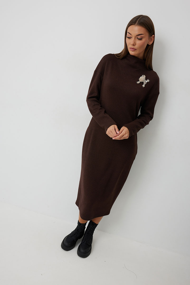 Платье трикотажное полуприлегающего силуэта с карманами в боковом шве. Длина платья до середины икры. Платье с цельнокроеной горловиной и спущенной линией плеча. Спинка со средним швом. Платье дополнено съемным авторским декором.