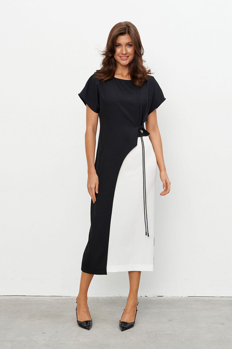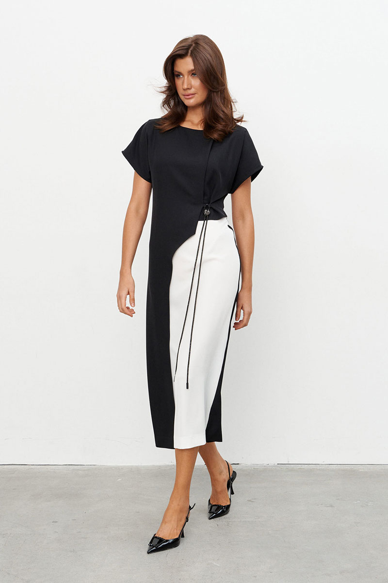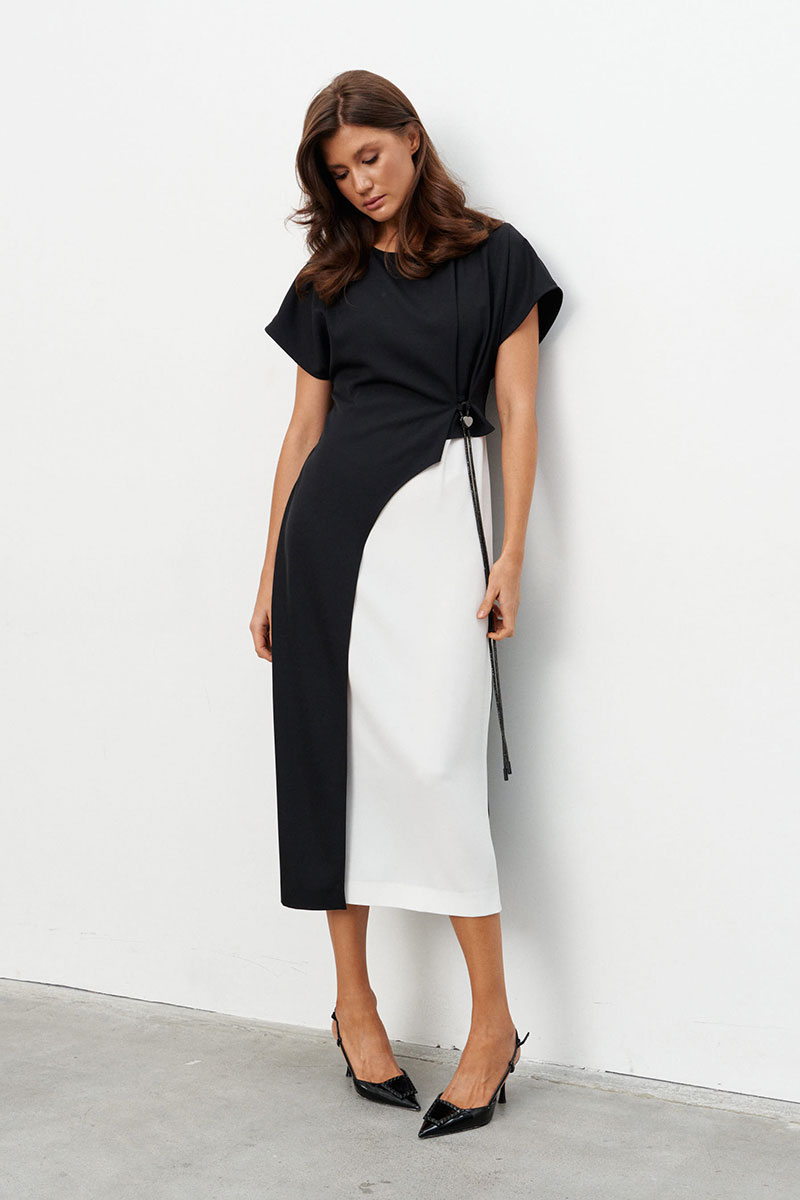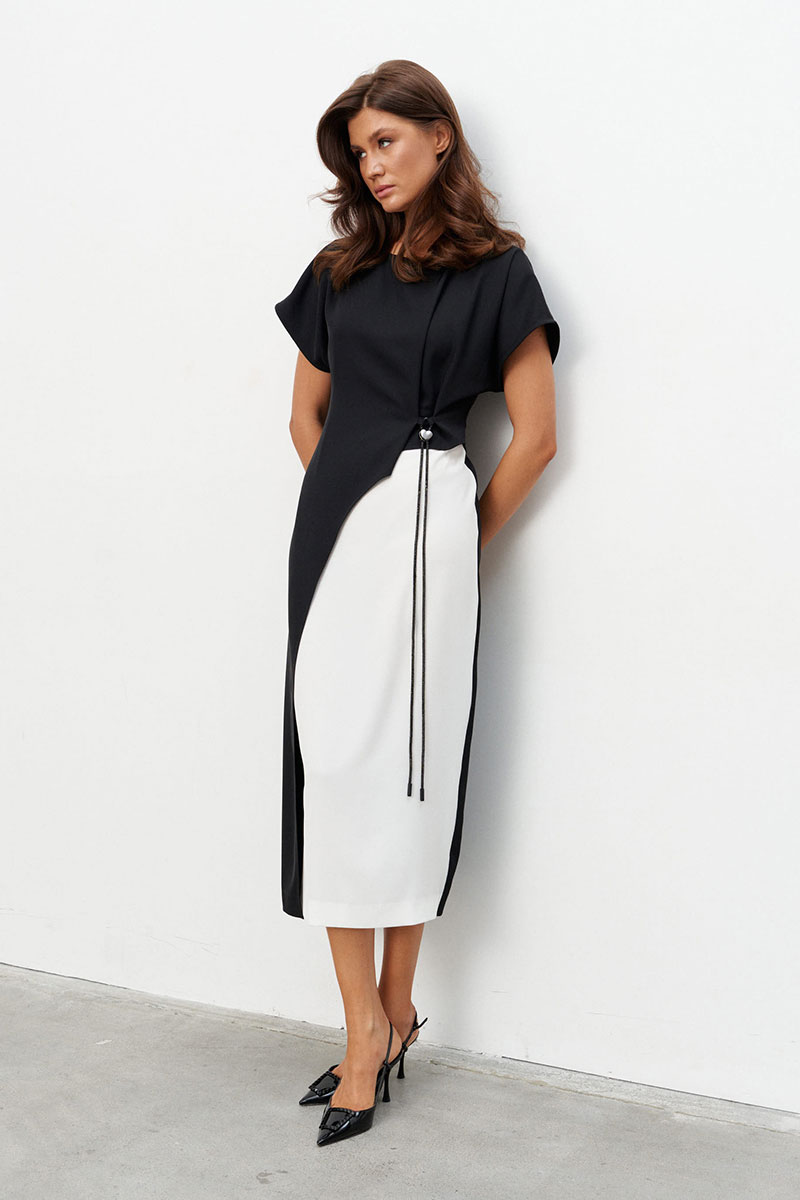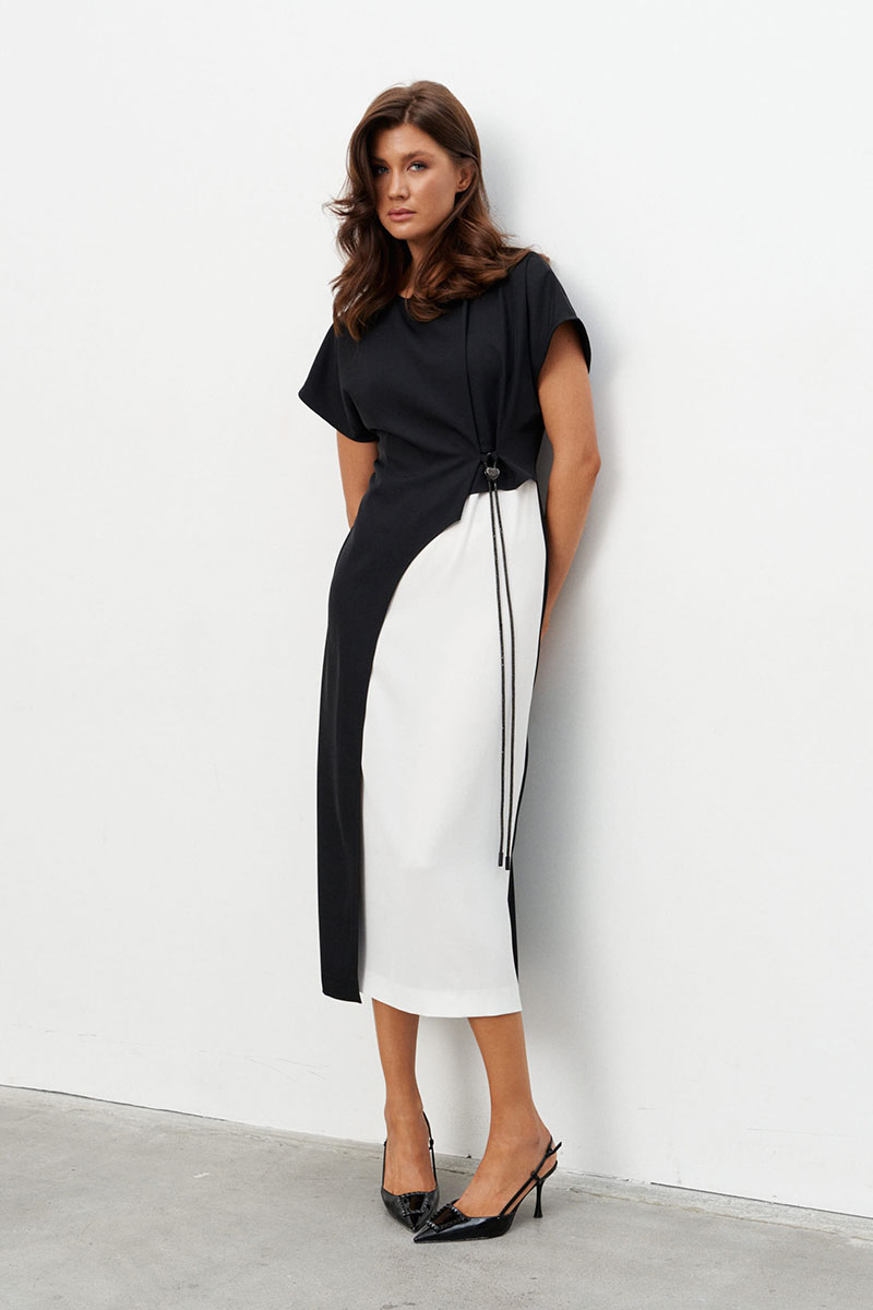 Платье длиной миди из струящейся ткани. Перед выполнен из двух контрастных деталей: Верхняя - чёрного цвета асимметричного кроя с декоративной завязкой на блестящий шнур в стразы и нижняя молочного цвета. Линия плеча спущена. Сзади разрез и застёжка на потайную молнию.
