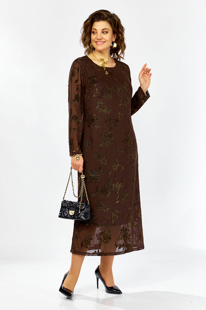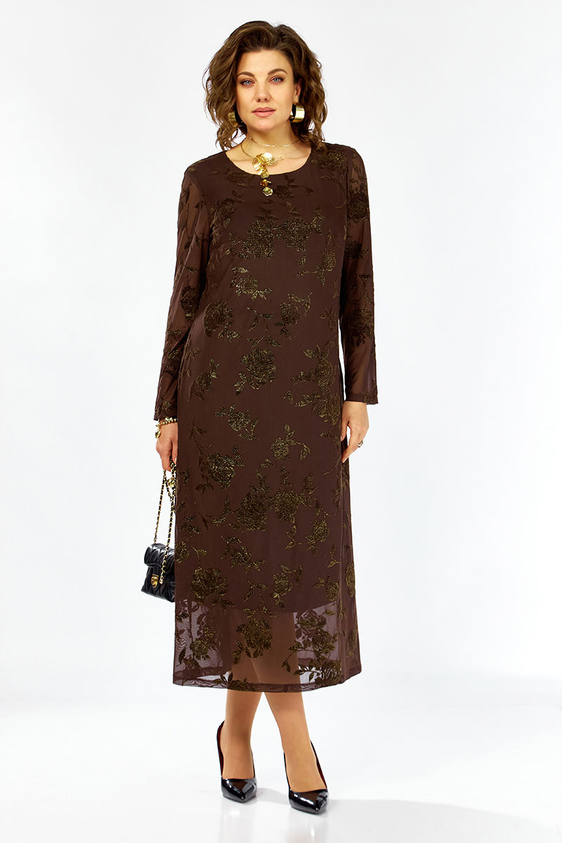 Роскошное платье на трикотажной подкладке полуприлегающего силуэта из мягкой стретч-сетки, украшенной флоковым напылением с позолотой, создает эффект дорогого кружевного орнамента.