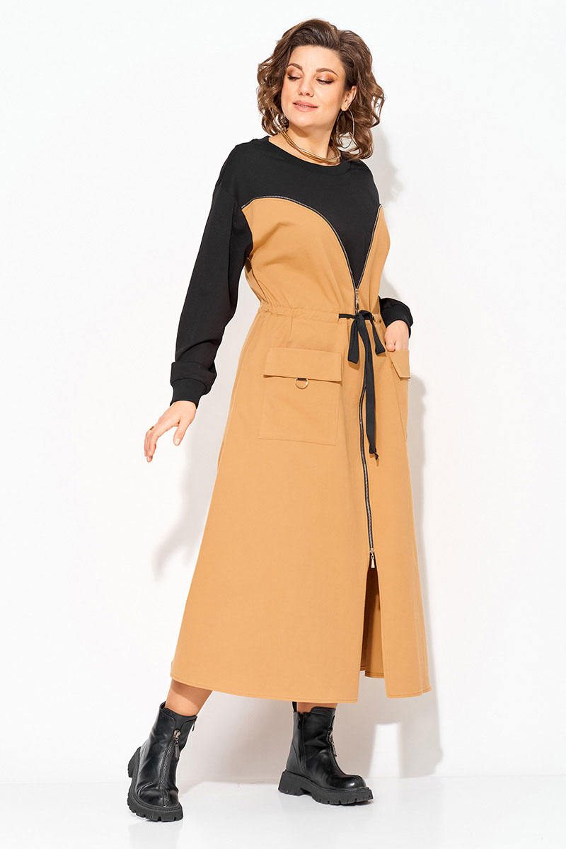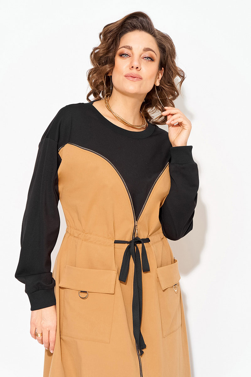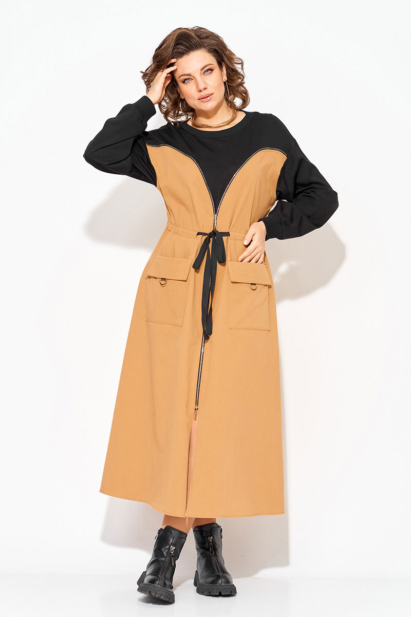 Эффектное, комбинированное женское платье, выполнено из сочетания хлопкового джинса и мягкого трикотажа. Модель трапециевидного силуэта, с эффектным подрезом в виде корсета переходящий в разрез по центру на металлическую молнию. Горловина округлой формы на мягкой планке. Рукав длинный, на спущенные плечевые пояса; низ оформлен манжетам. По полочке расположены накладные карманы с цельнокроеным клапаном. Талию можно подчеркнуть поясом на кулиске.