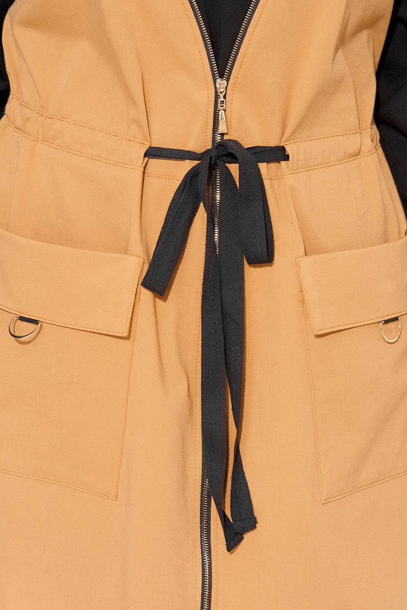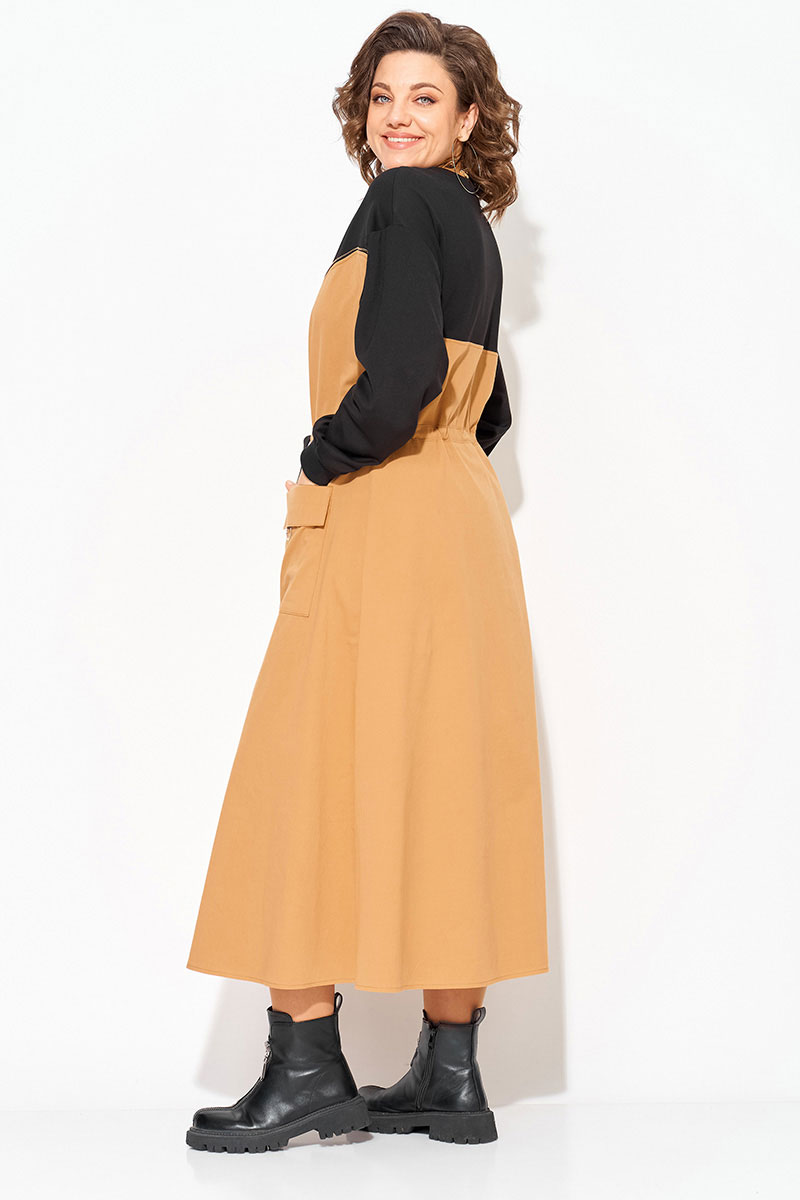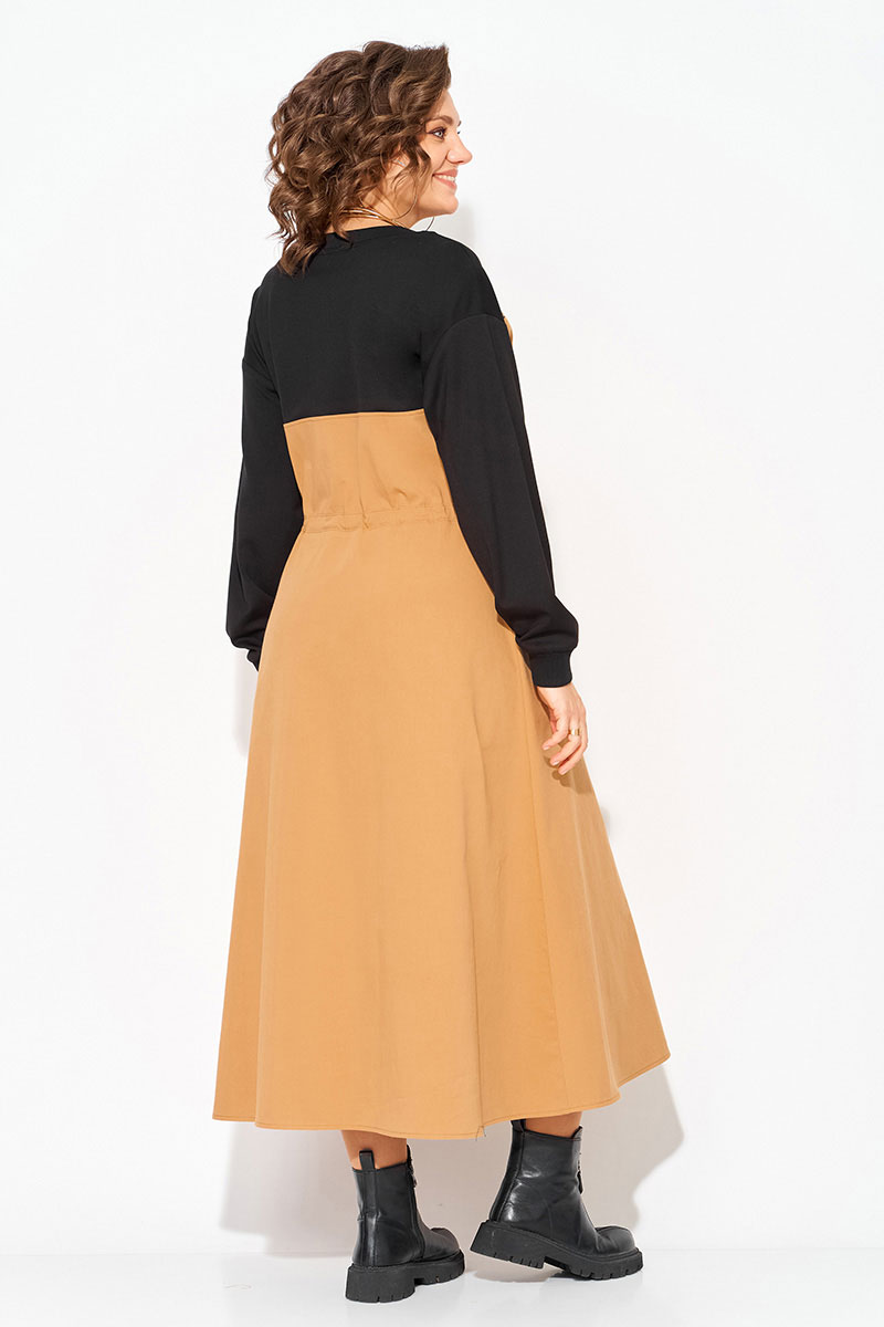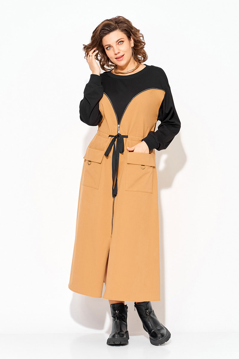 Эффектное, комбинированное женское платье, выполнено из сочетания хлопкового джинса и мягкого трикотажа. Модель трапециевидного силуэта, с эффектным подрезом в виде корсета переходящий в разрез по центру на металлическую молнию. Горловина округлой формы на мягкой планке. Рукав длинный, на спущенные плечевые пояса; низ оформлен манжетам. По полочке расположены накладные карманы с цельнокроеным клапаном. Талию можно подчеркнуть поясом на кулиске.