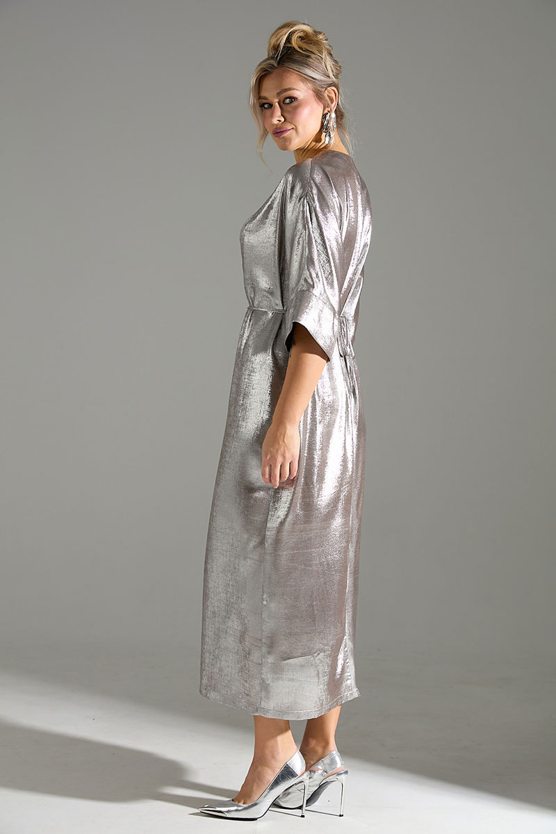 Платье большого объёма с цельнокроеными рукавами. По переду расположены 2 тесьмы из основной ткани, который завязываются на запах, что позволяет регулировать обхват талии.