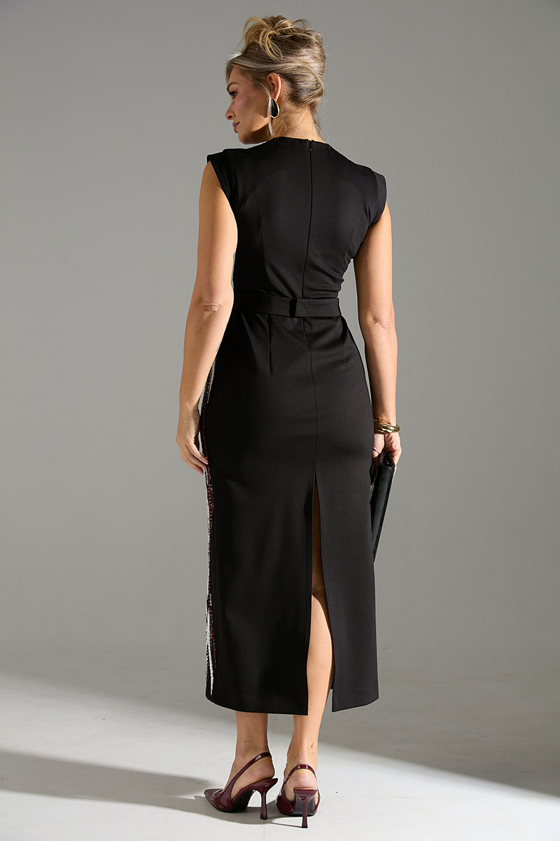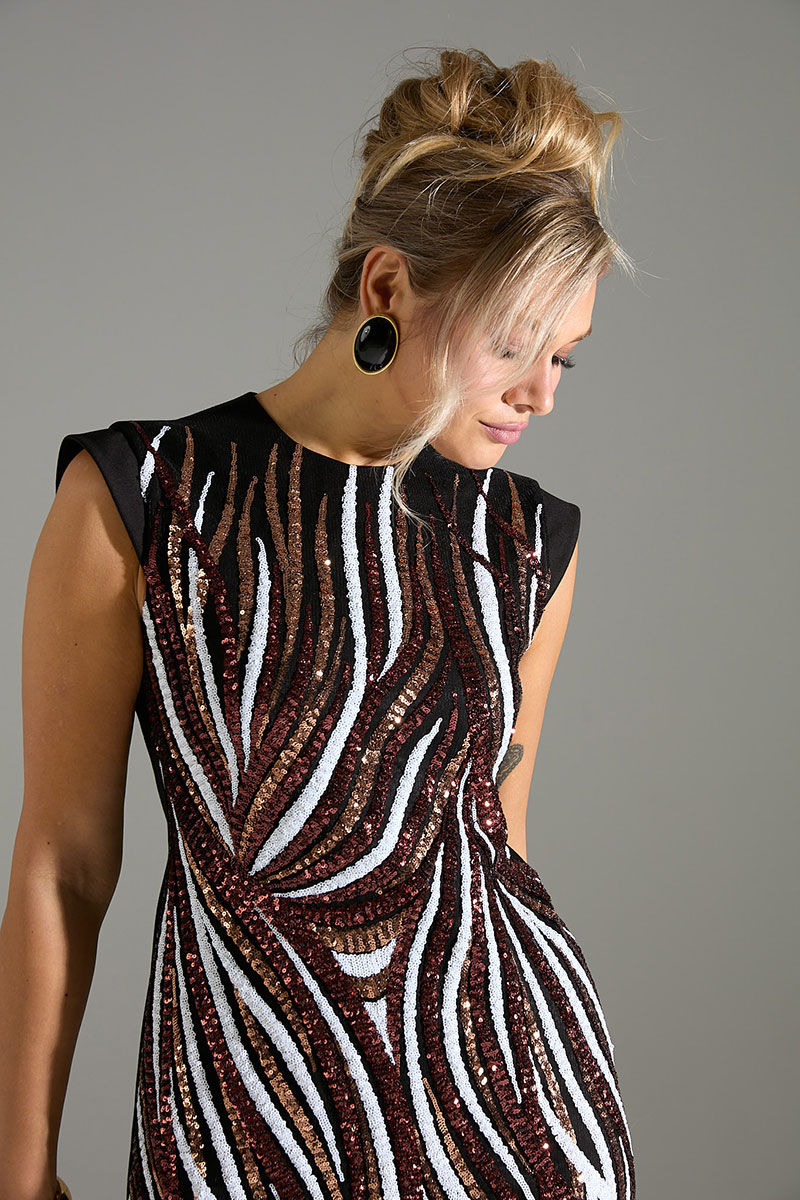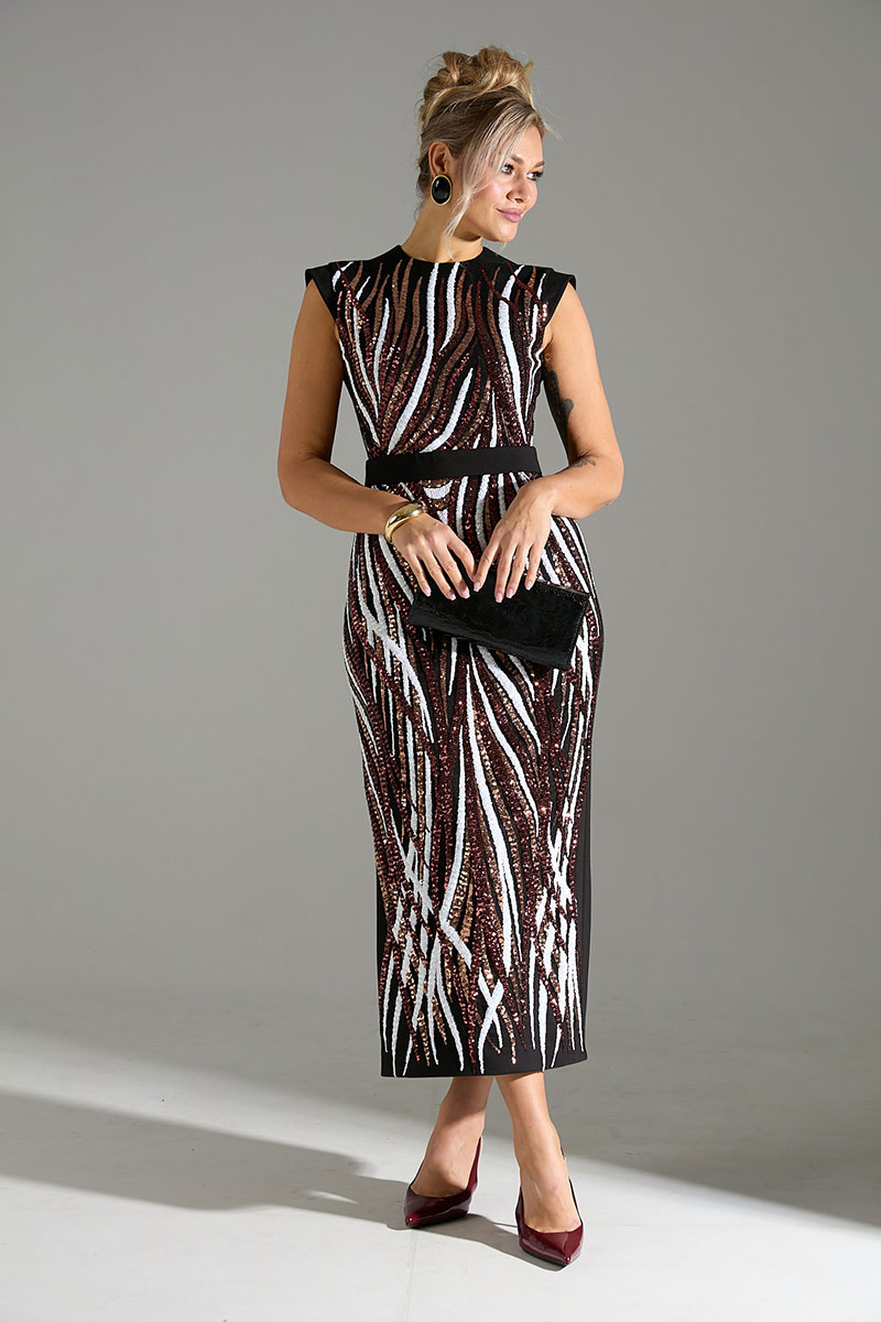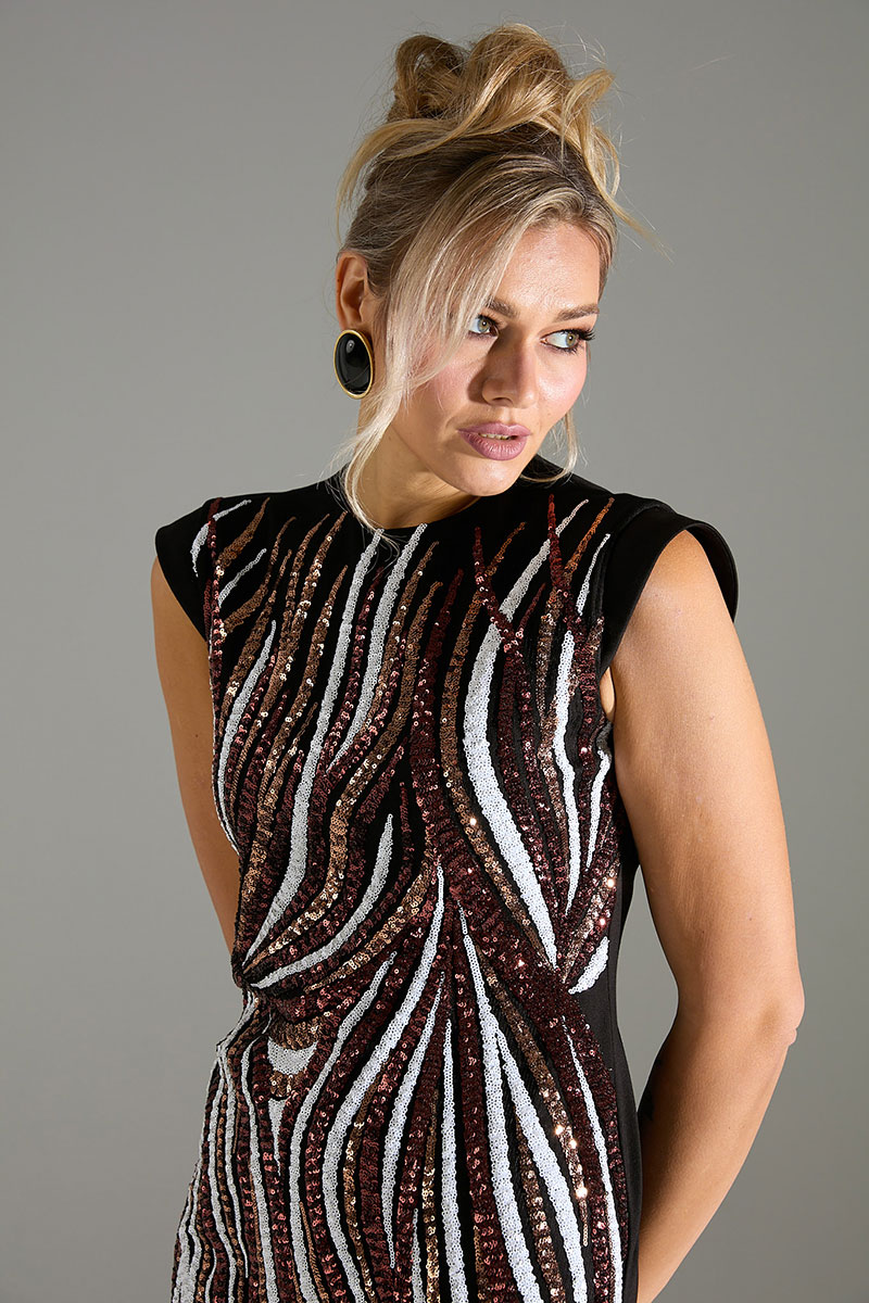 Платье приталенного силуэта выполнено из плотного трикотажного полотна. Перед платья декорирован сеткой с вышивкой из пайеток. По спинке расположены талиевые вытачки. По среднему шву спинки разрез длинной 56 см и застежка на потайную молнию. Горловина и пройма обтачные, рукав выполнен в виде небольшого "крылышка".