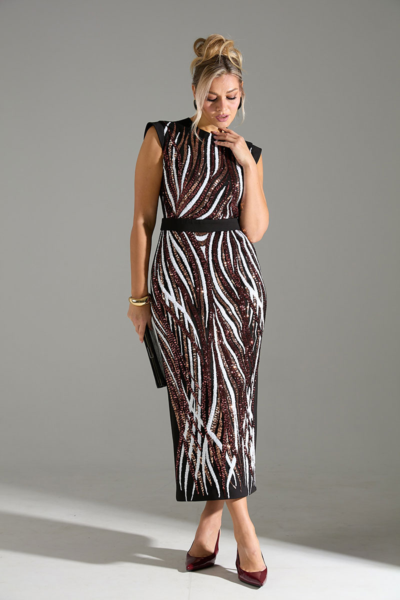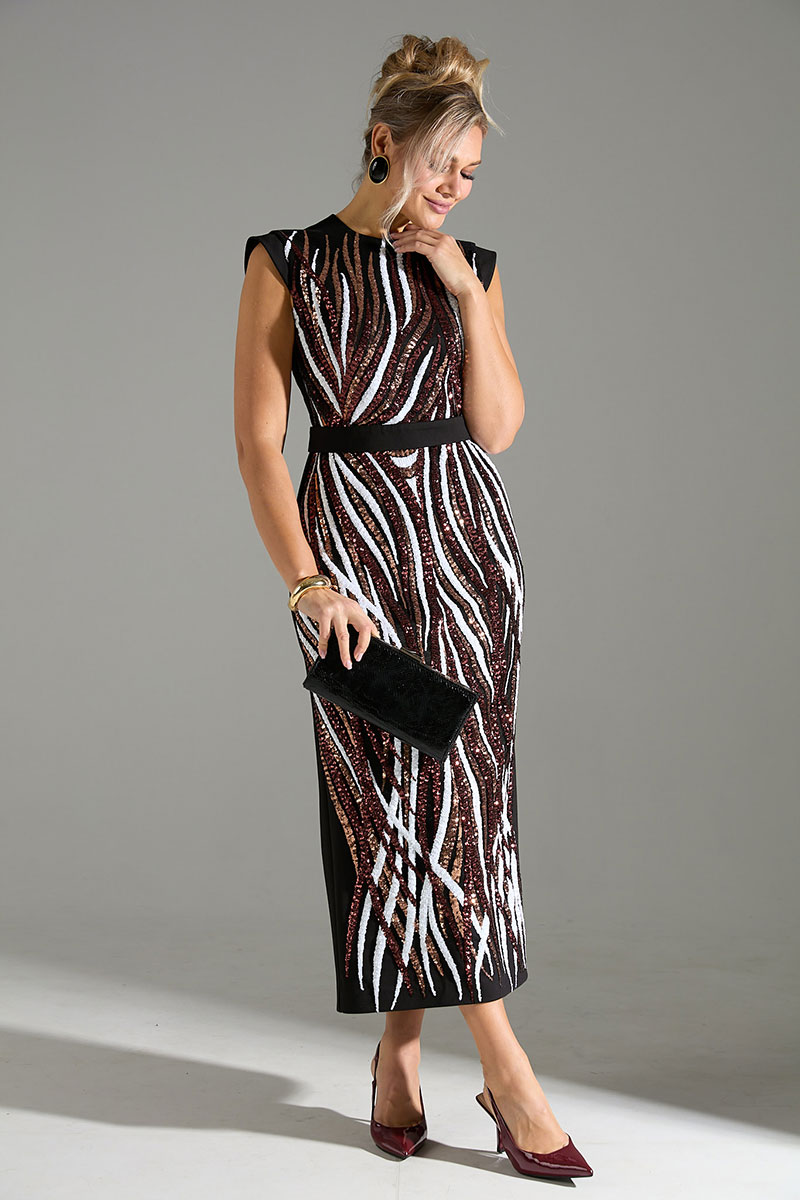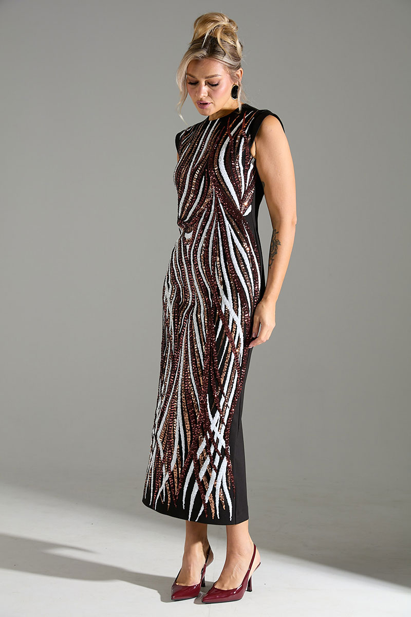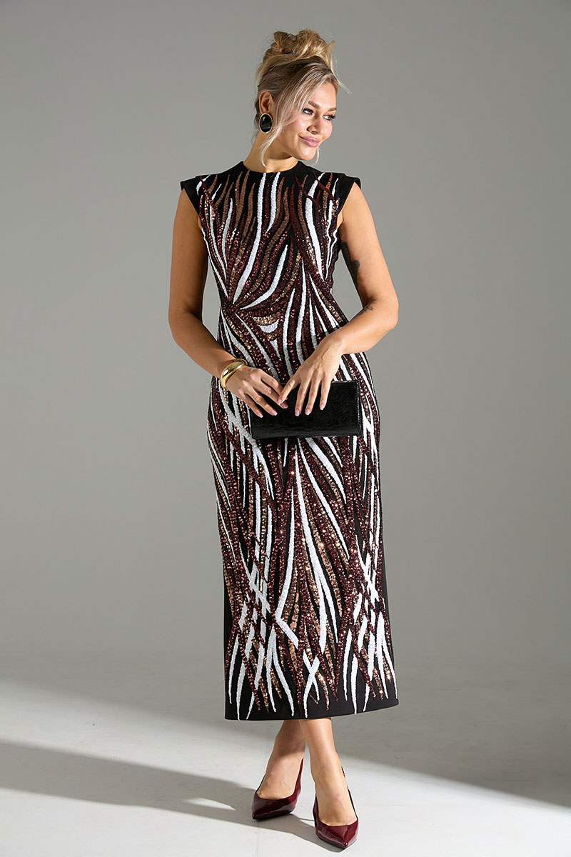 Платье приталенного силуэта выполнено из плотного трикотажного полотна. Перед платья декорирован сеткой с вышивкой из пайеток. По спинке расположены талиевые вытачки. По среднему шву спинки разрез длинной 56 см и застежка на потайную молнию. Горловина и пройма обтачные, рукав выполнен в виде небольшого "крылышка".