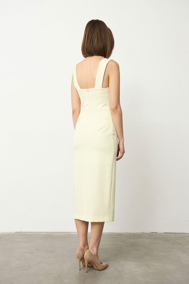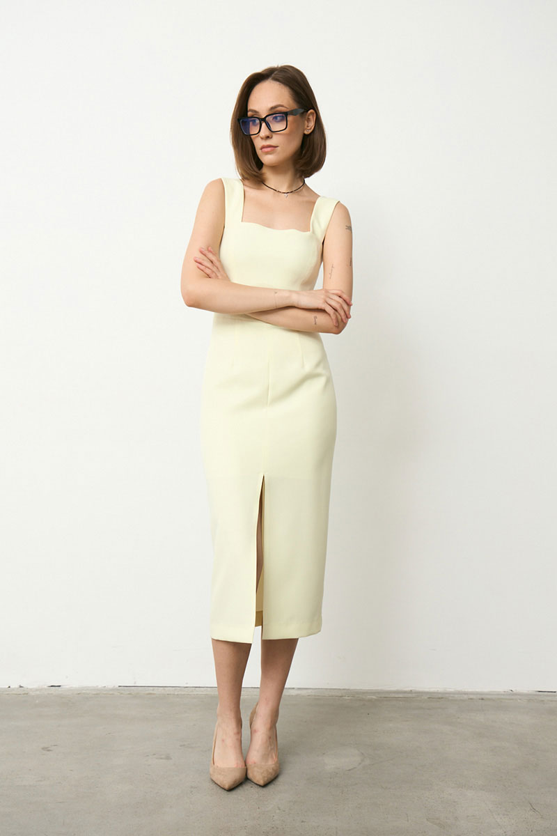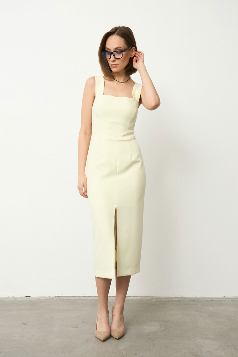Платье миди прилегающего силуэта, отрезное по линии талии с глубоким разрезом по переду. Изделие выполнено из плательного крепа на подкладке. Застежка в среднем шве спинки на потайную молнию.