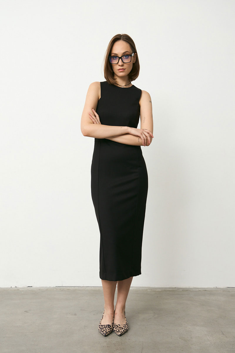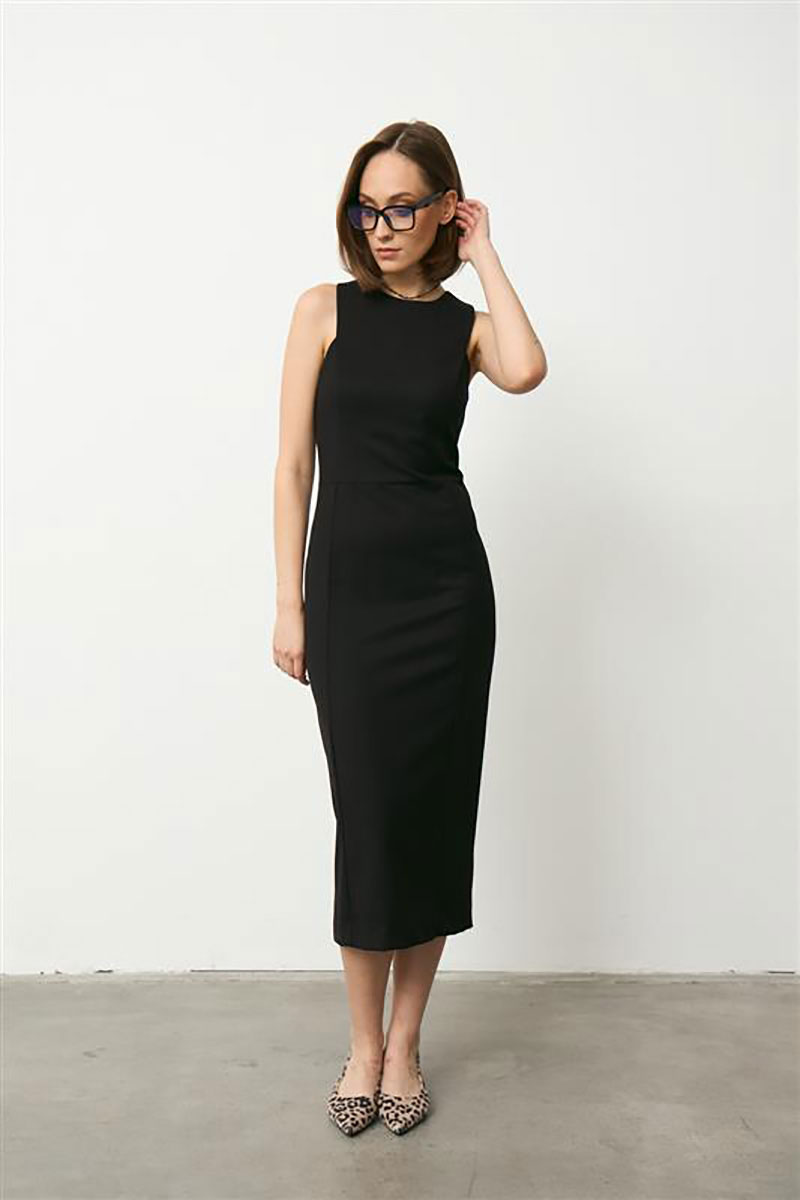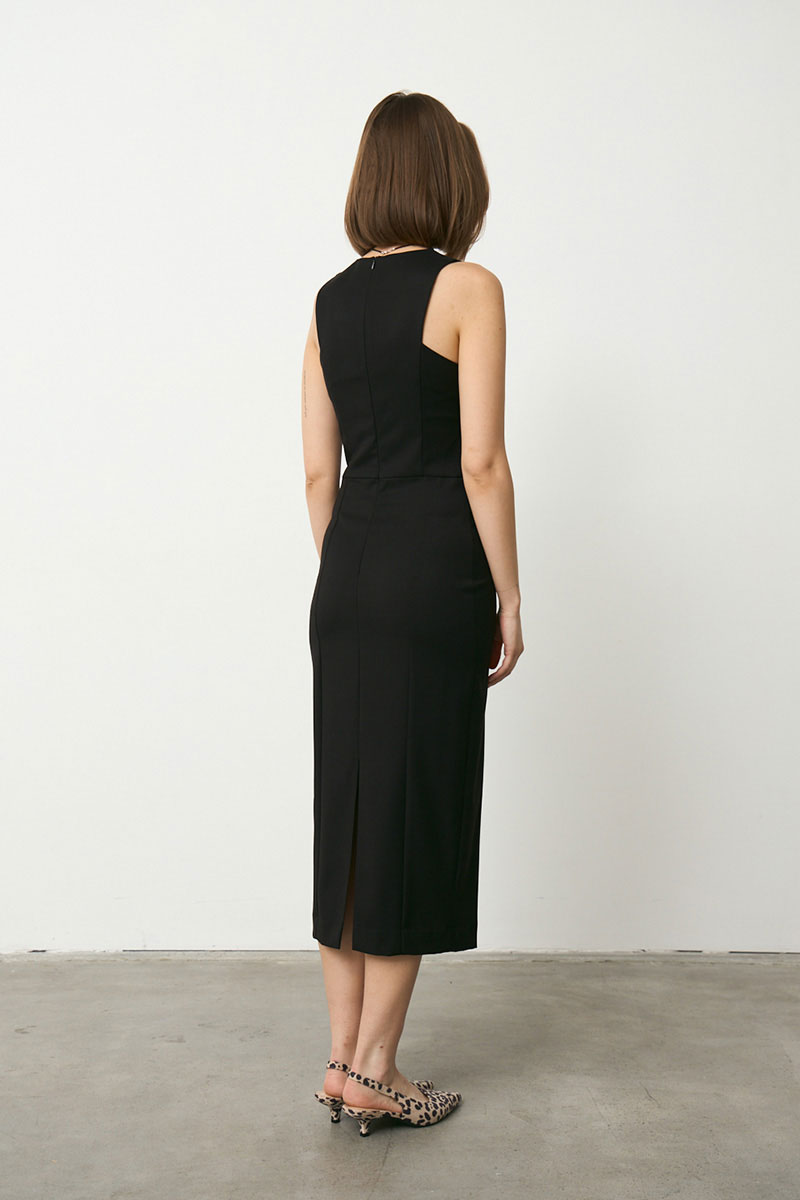 Платье миди прилегающего силуэта из гладкой костюмной ткани.