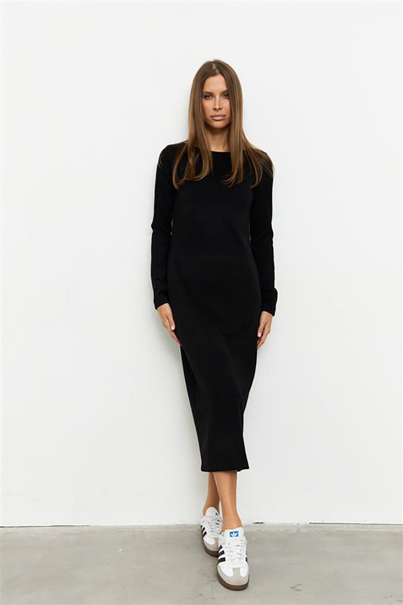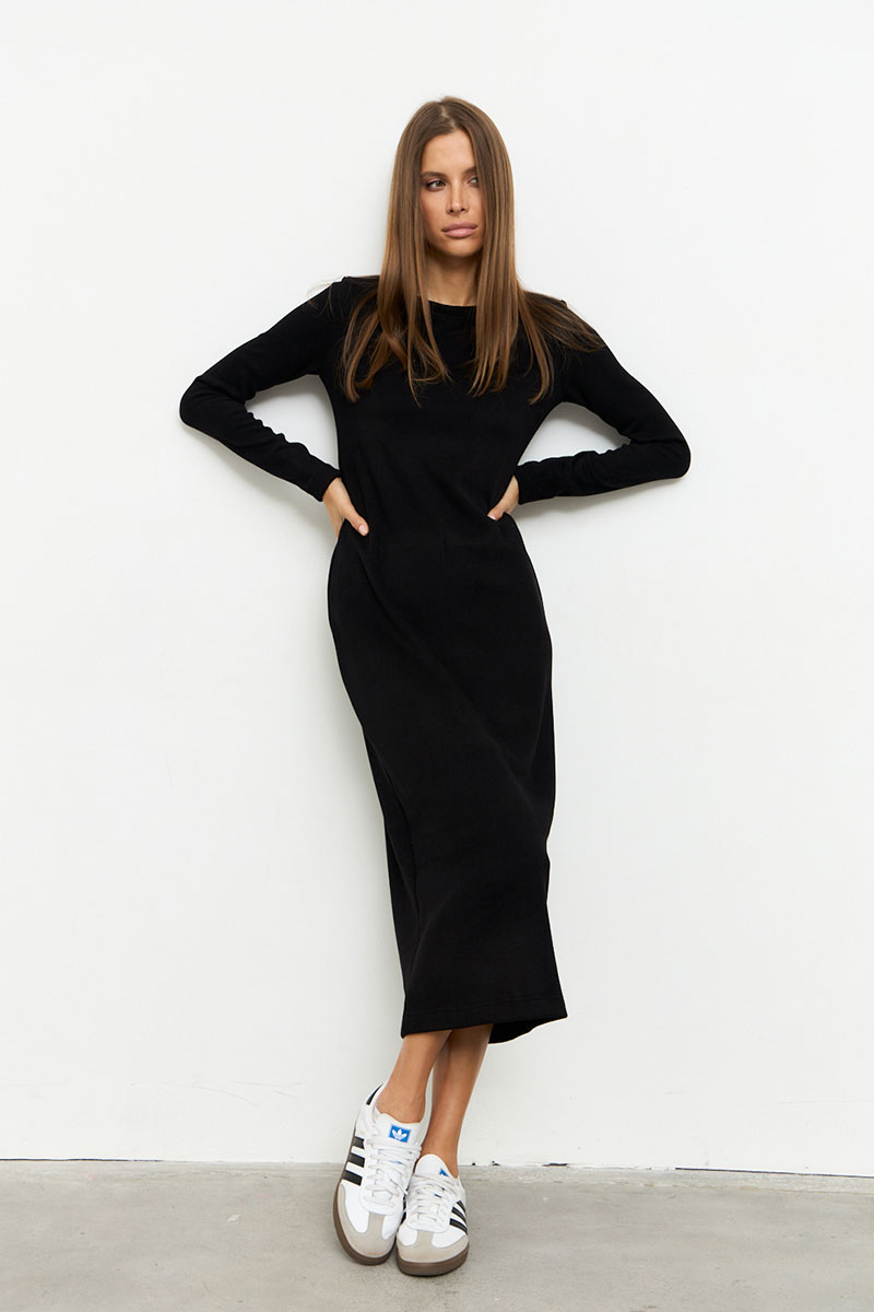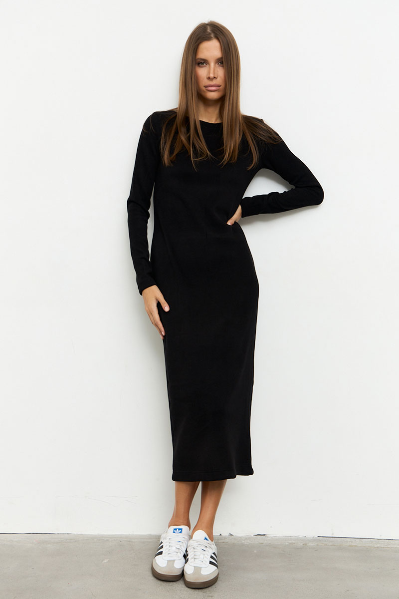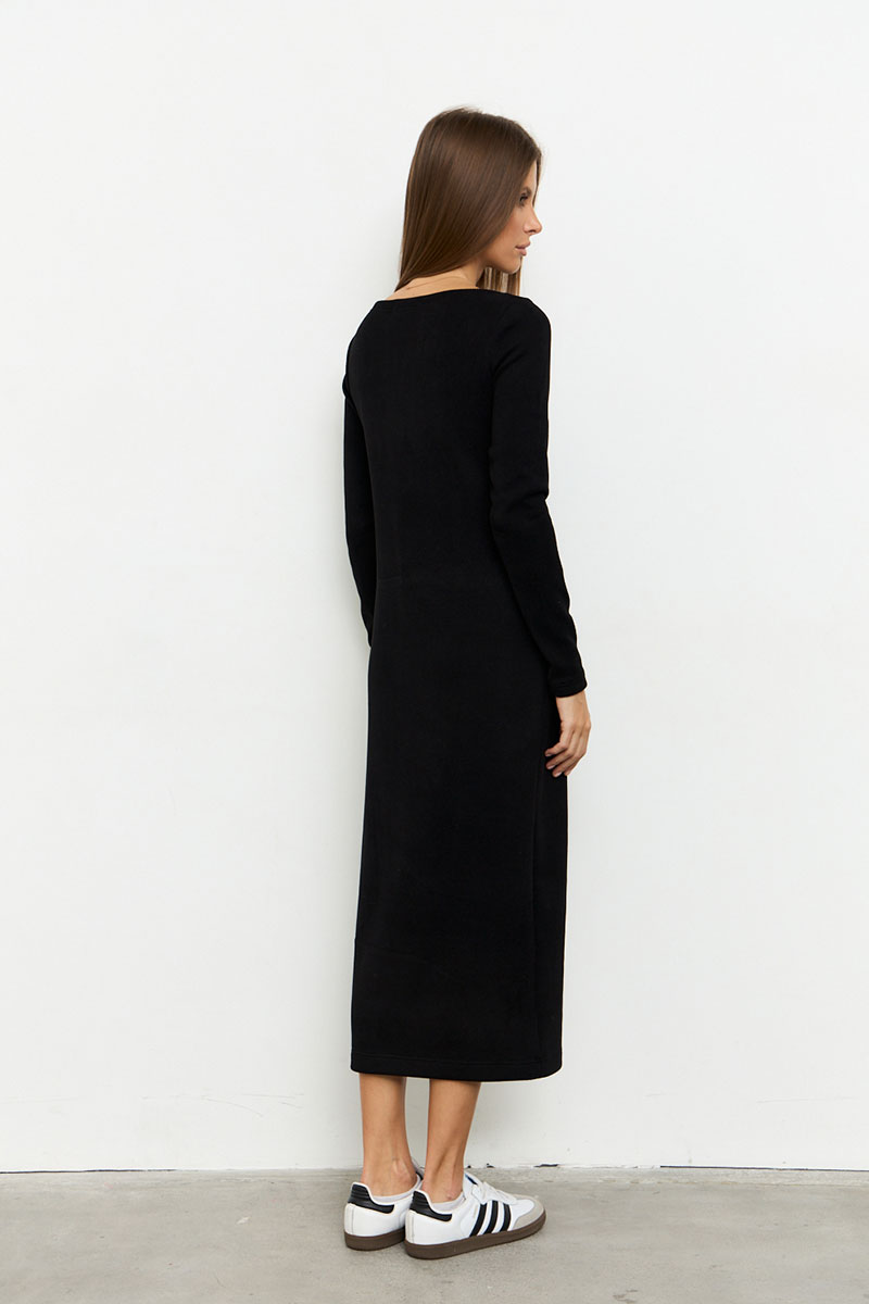 Платье полуприлегающего силуэта из мягкого трикотажного полотна в рубчик с вырезом горловины "лодочка".