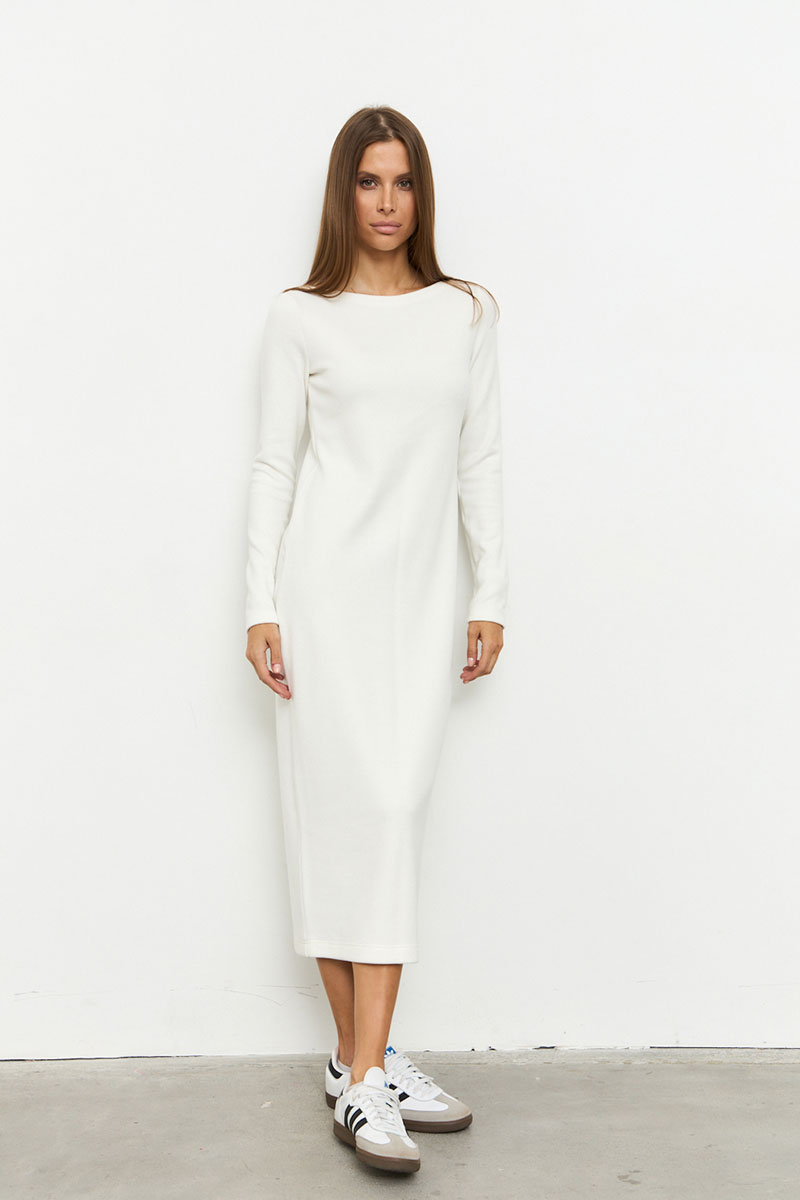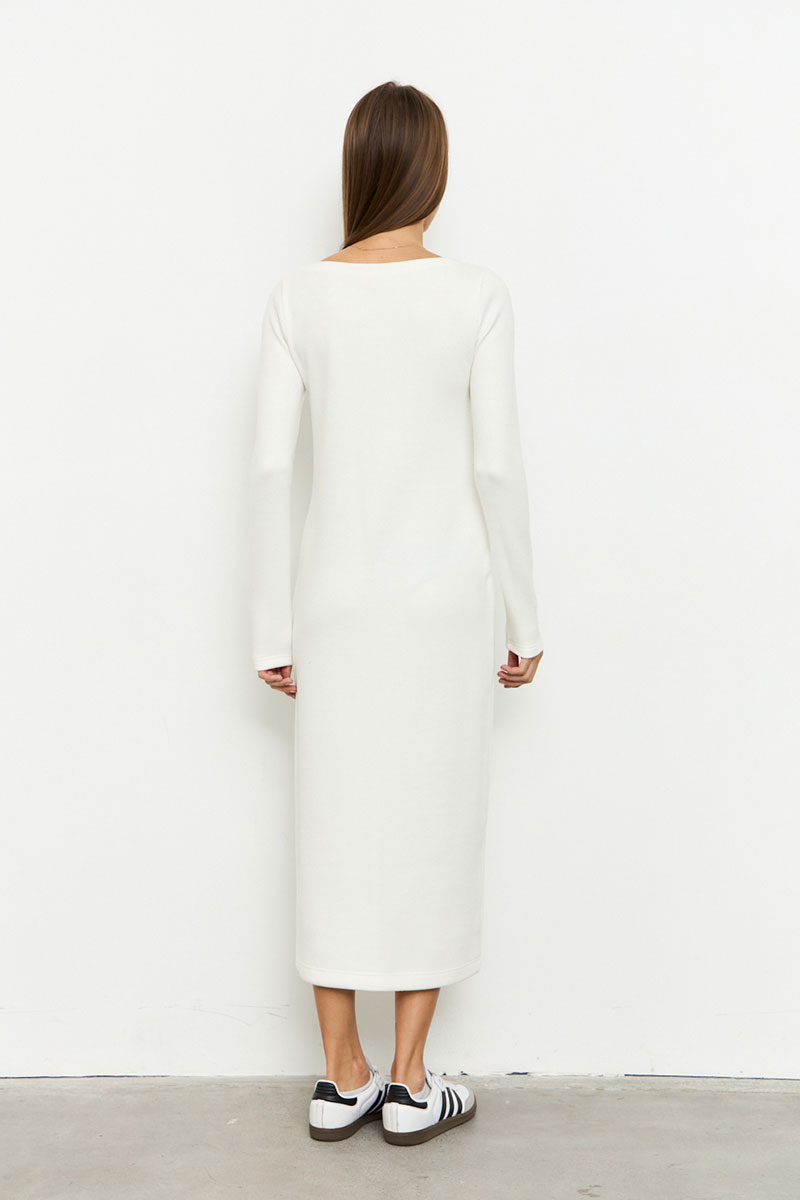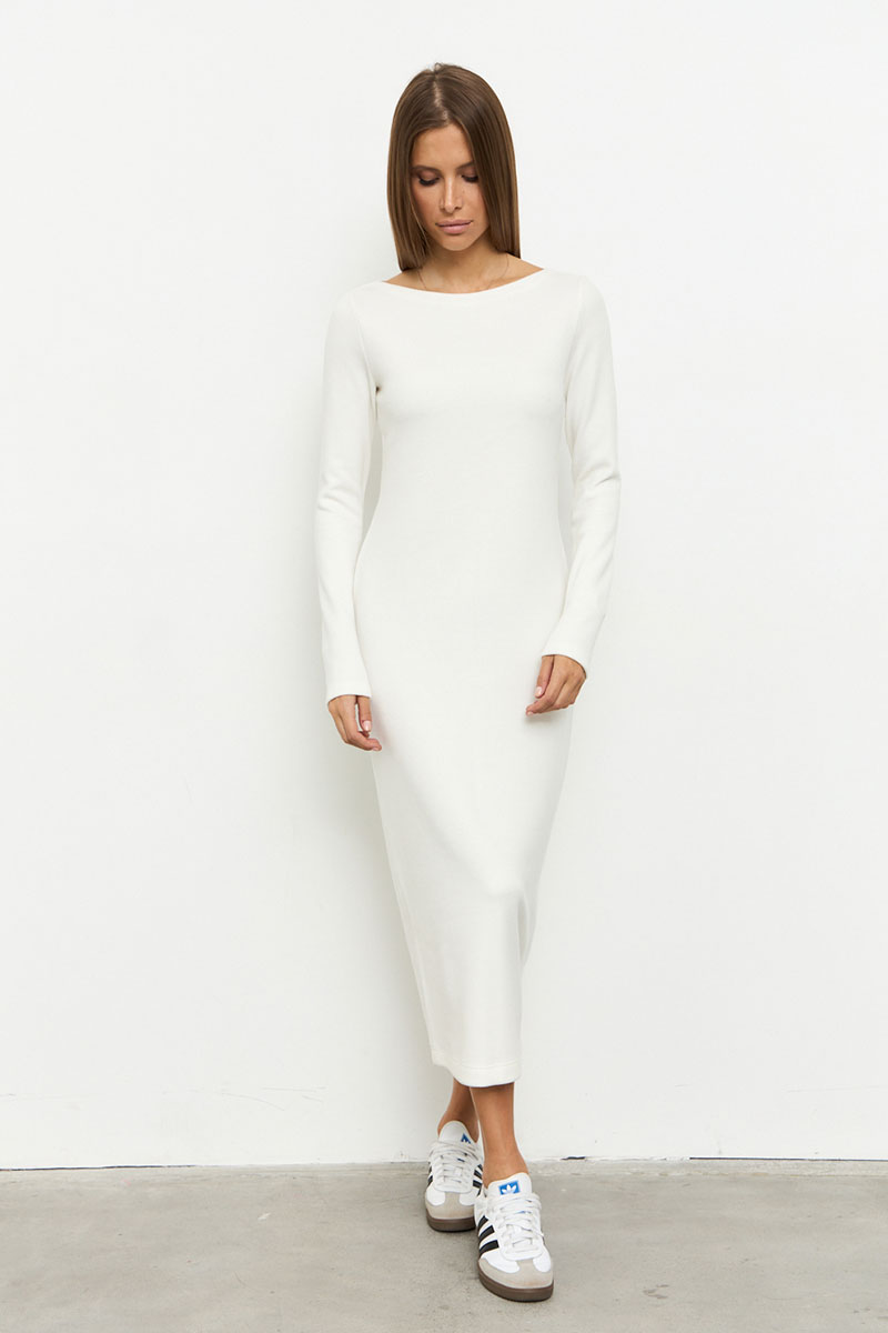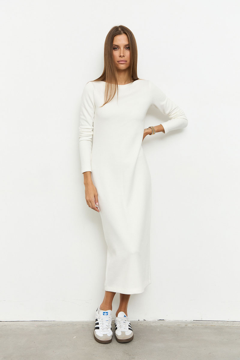 Платье полуприлегающего силуэта из мягкого трикотажного полотна в рубчик с вырезом горловины "лодочка".
