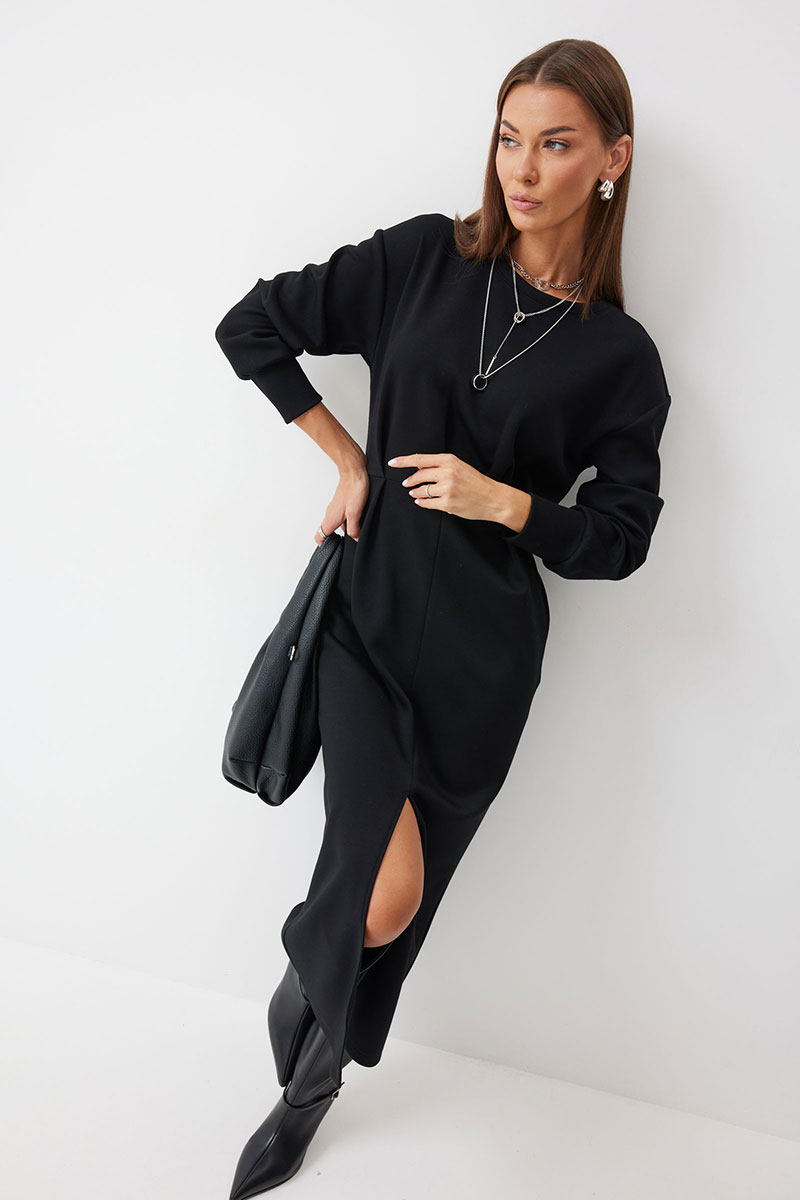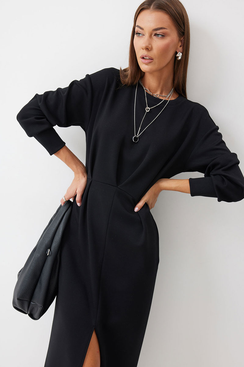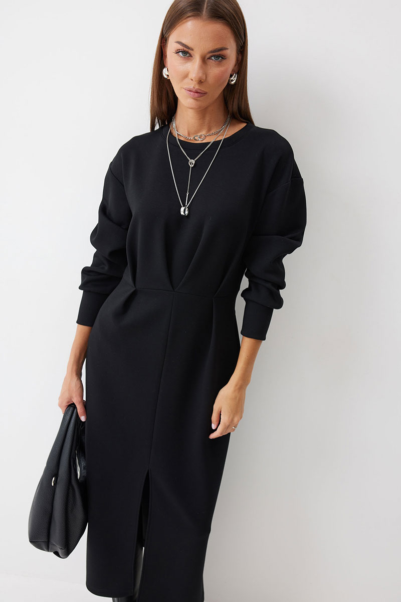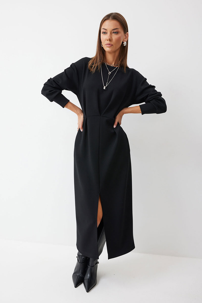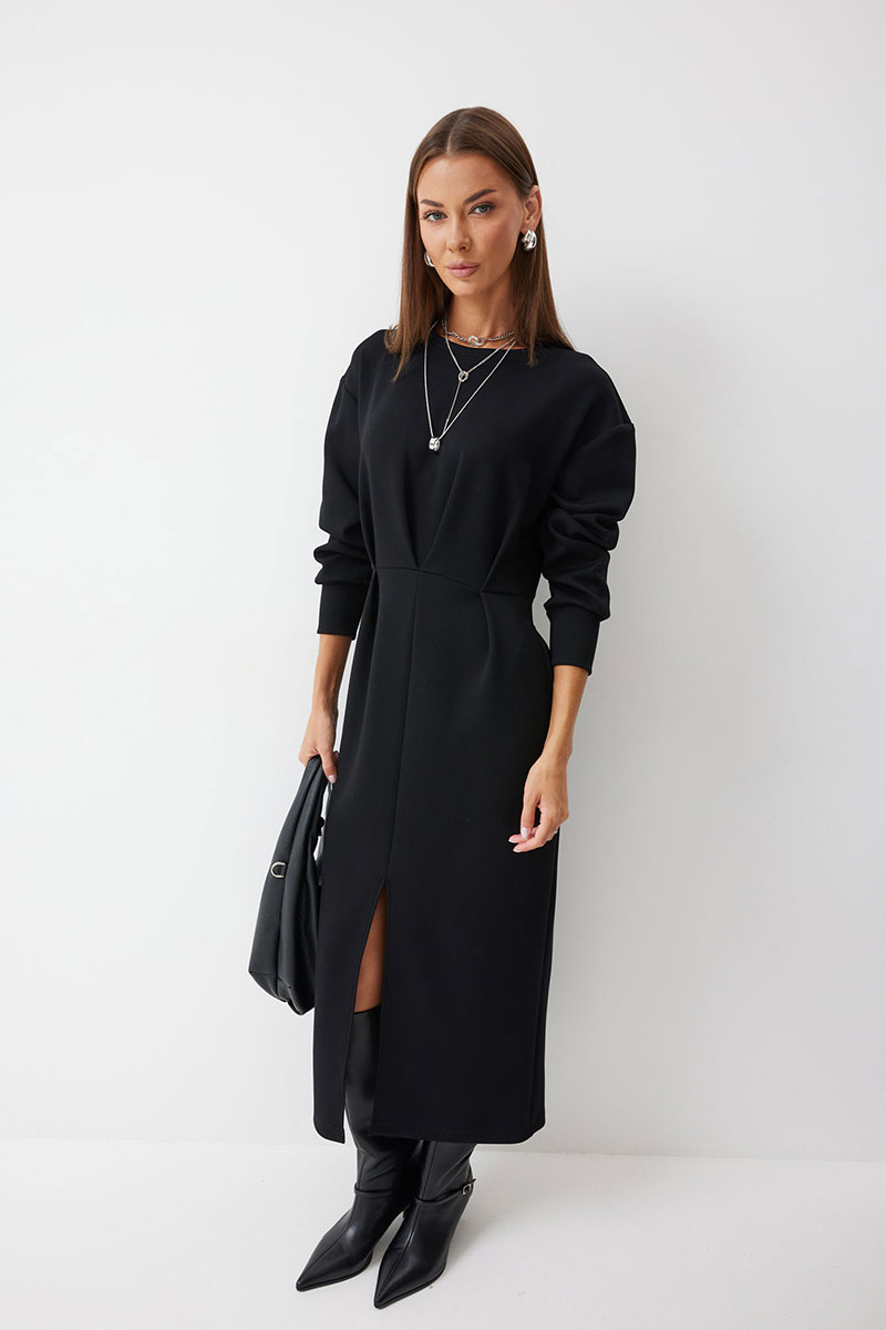 Платье полуприлегающего силуэта из трикотажного полотна. Горловина округлая. Рукав со спущенной линией плеча по низу манжета. Платье отрезное по линии талии. По переду на талии складки. В боковом шве функциональные карманы. В центральном шве юбки разрез.