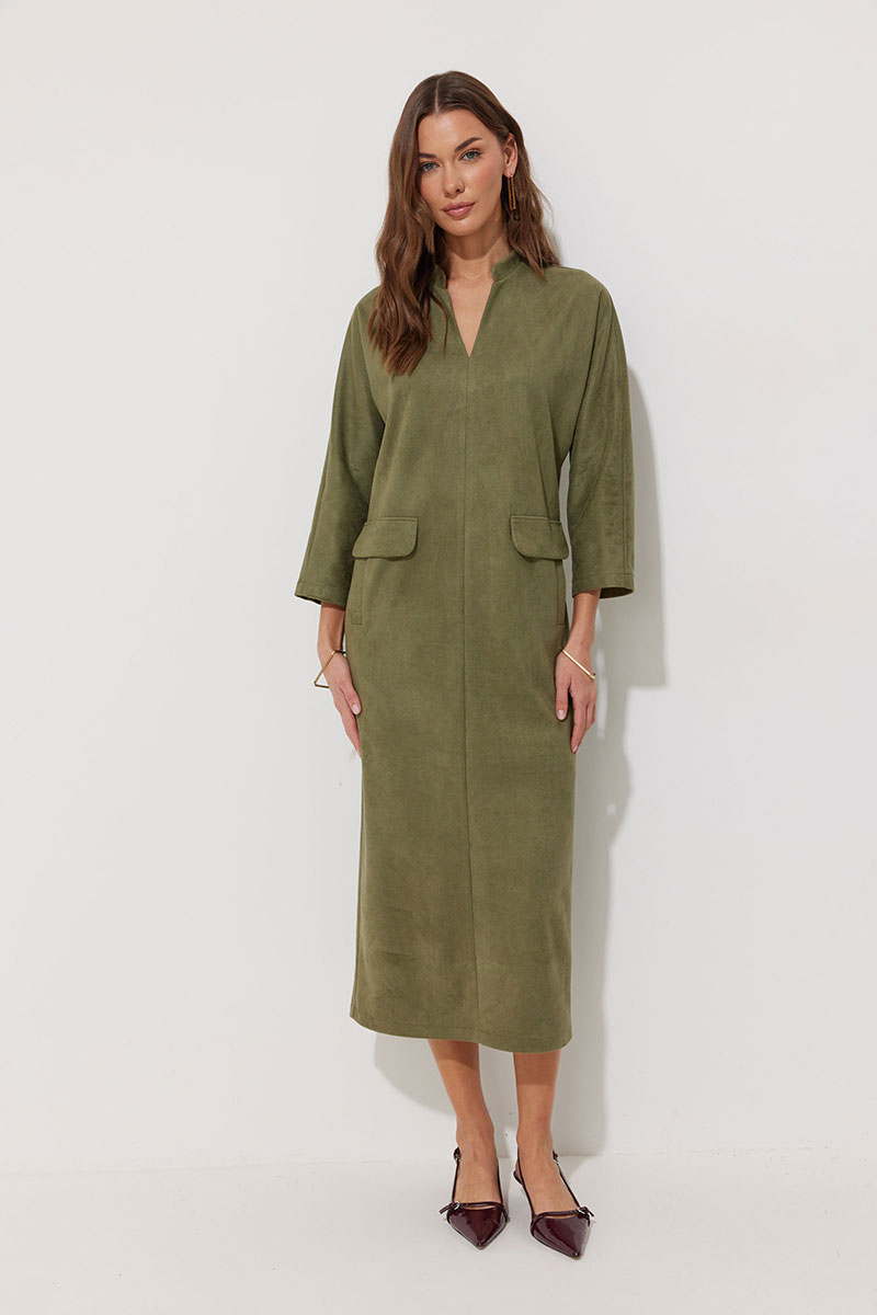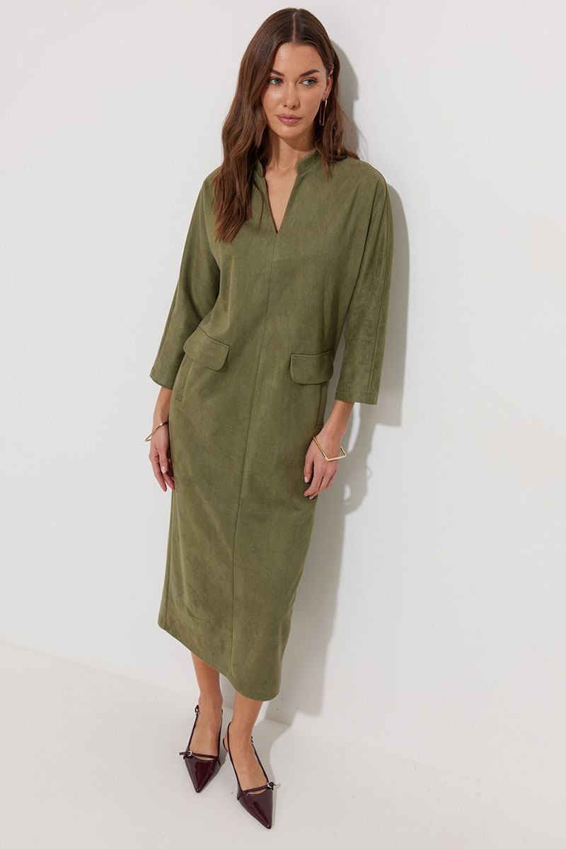 Платье прямого силуэта из трикотажного полотна длины миди. Рукав цельнокроеный, длиной ¾. Воротник-стойка. На передних половинках обработаны прорезные карманы с втачной листочкой и декоративным клапаном. По спинке расположен центральный шов с шлицей по низу.