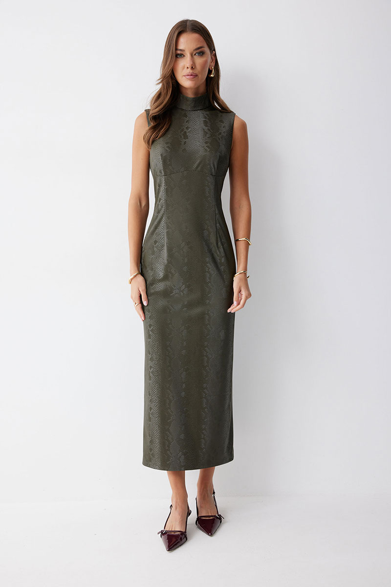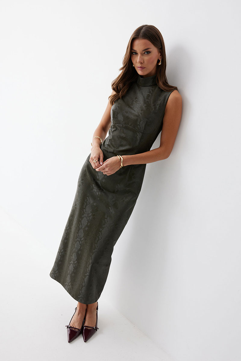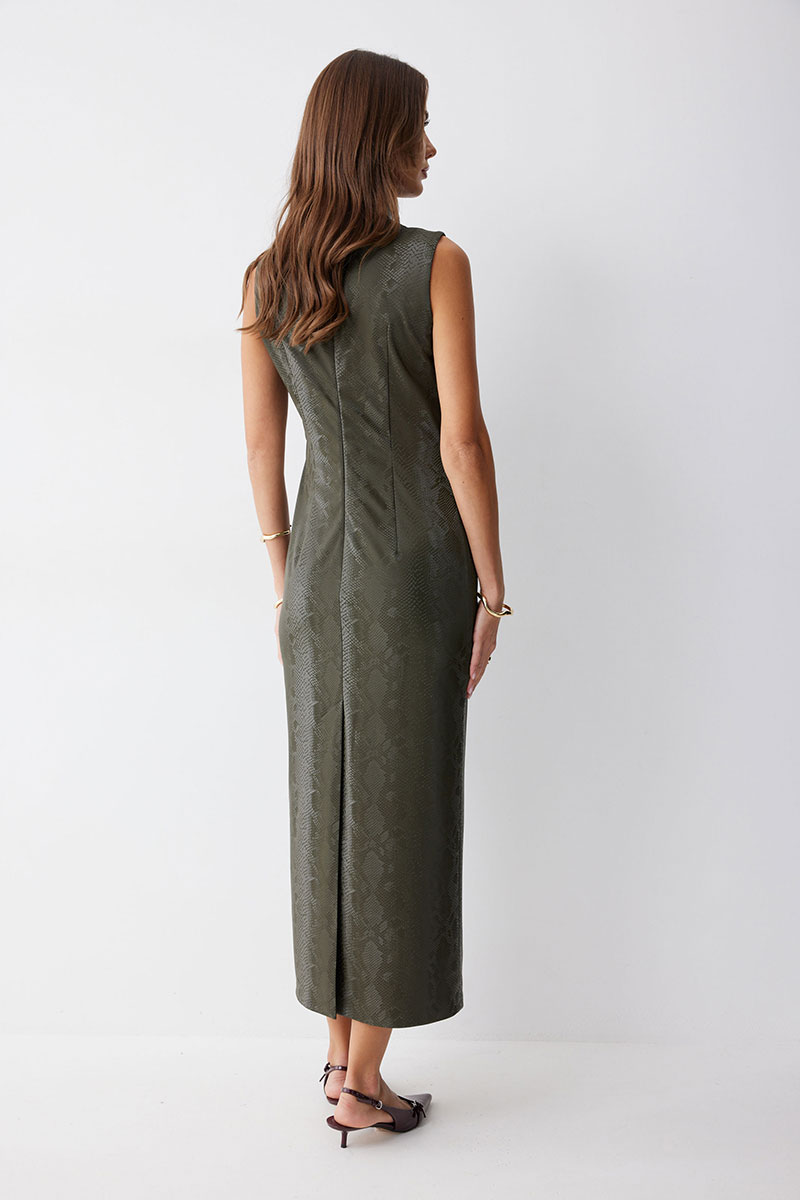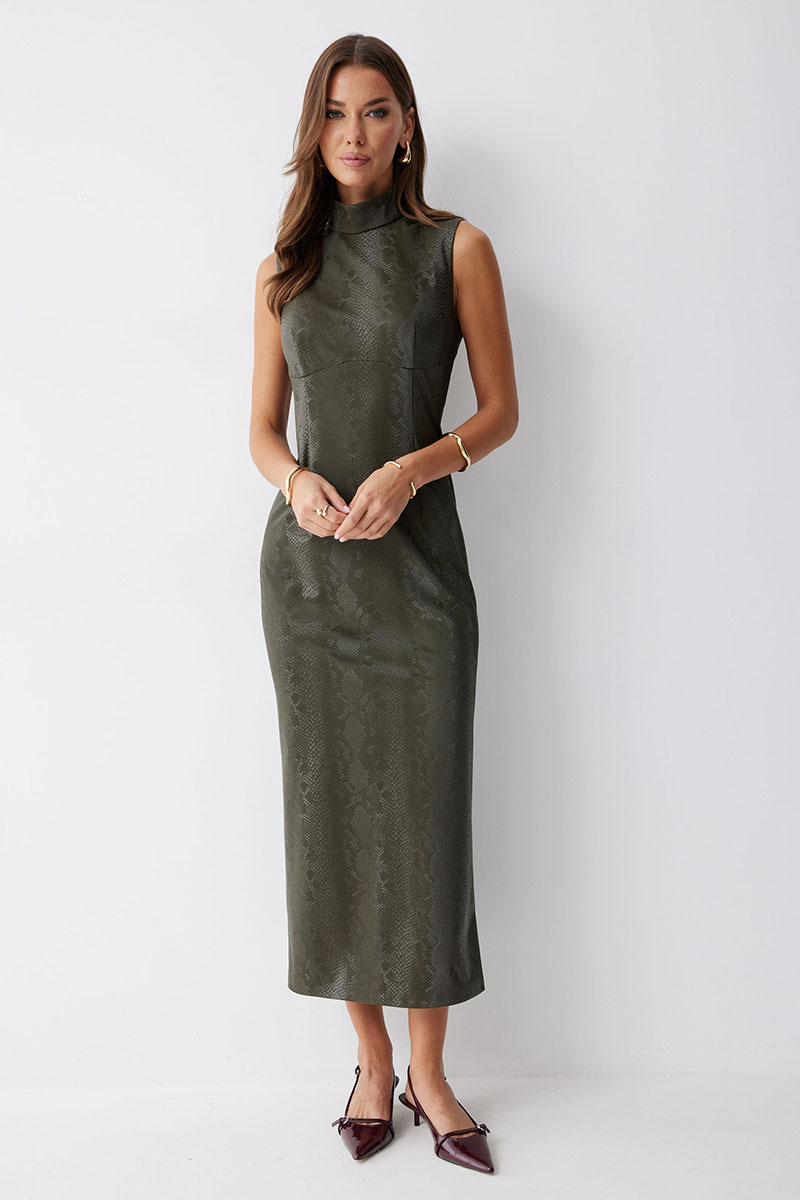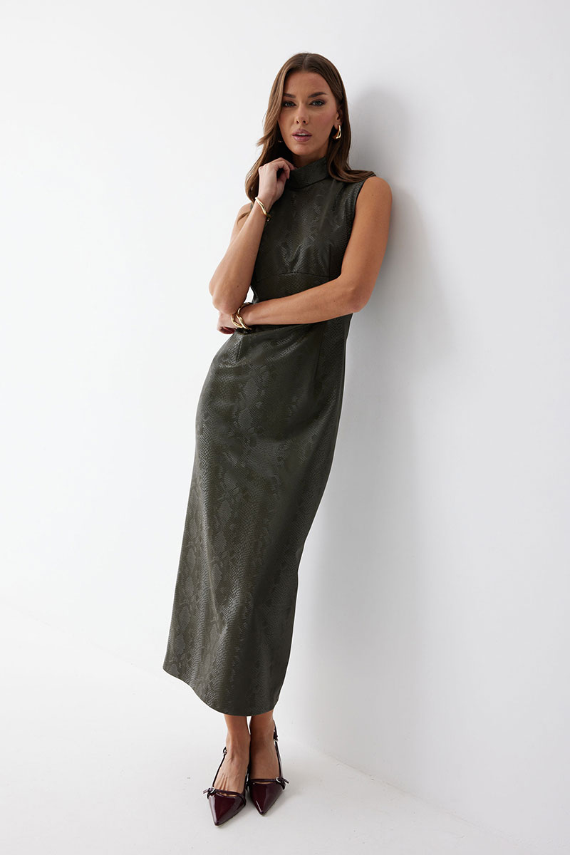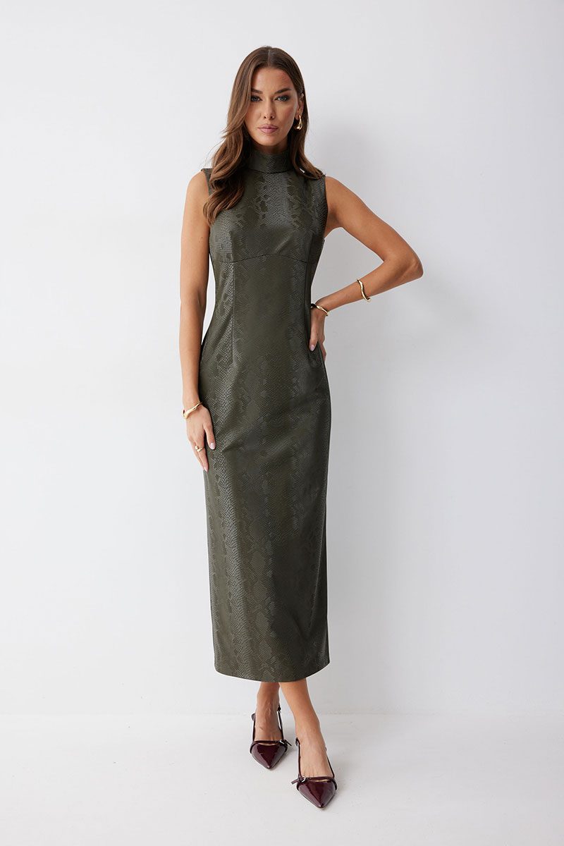 Платье прилегающего силуэта из экокожи  длиной миди. Горловина-стойка. Спереди под грудью подрез, нагрудные и талиевые вытачки. На спинке в центральном шве потайная молния, по низу шлица. На спинке платья талиевые вытачки.