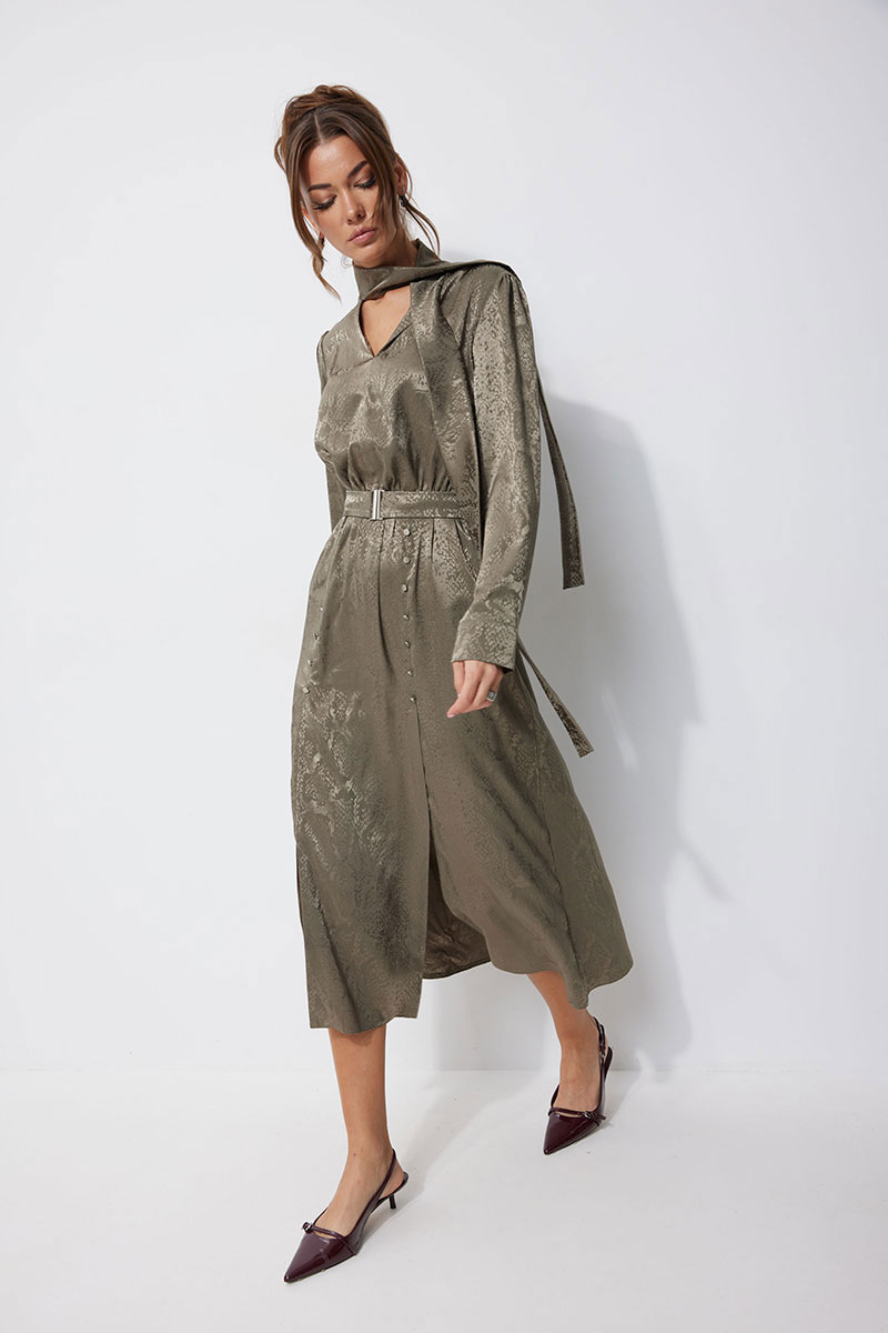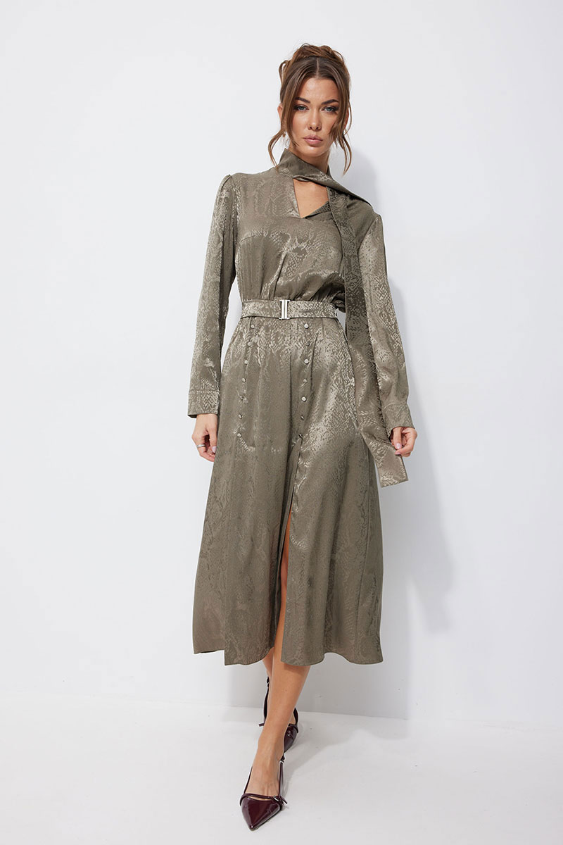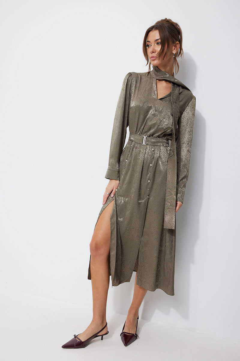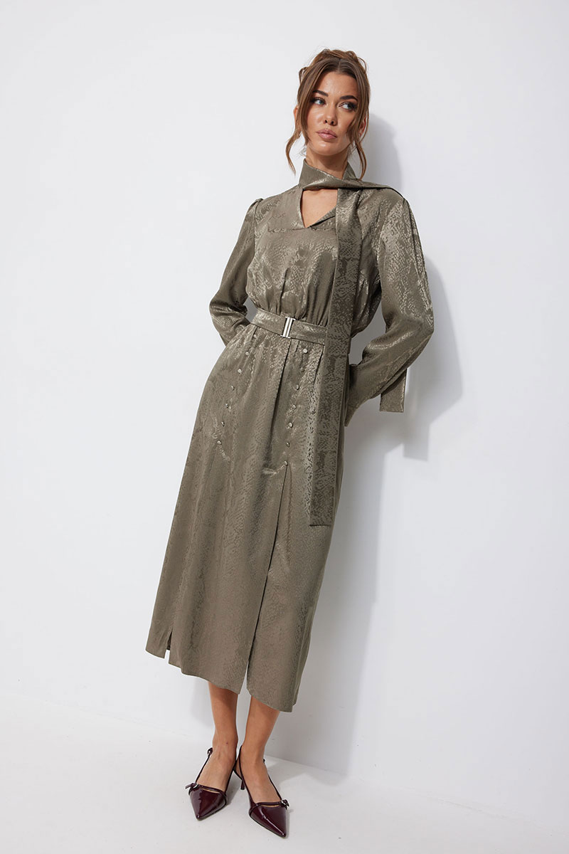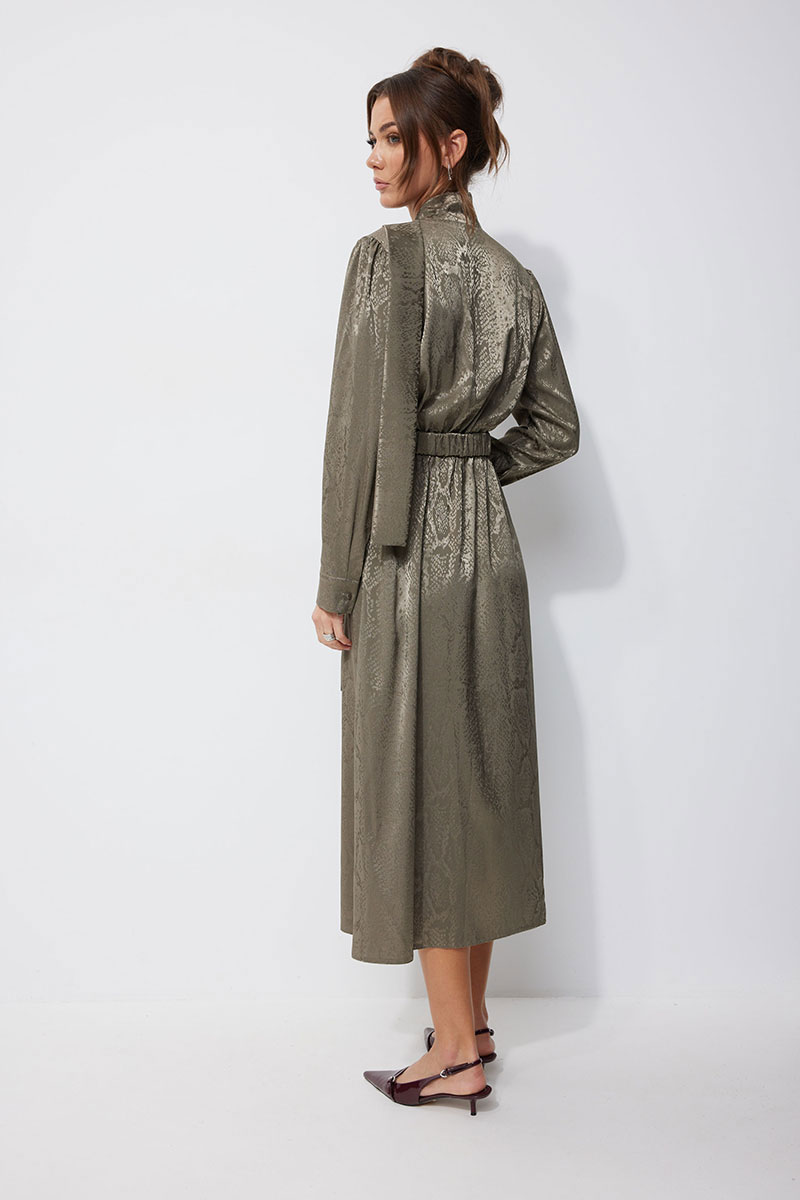 Нарядное платье из жаккардового атласа с анималистичным дизайном. Платье свободного кроя. Отрезное по талии, с резинкой. Рукав длинный, с манжетой с застежкой на петлю с пуговицей. Платье с  мягким воротником-стойкой, переходящим в бант-завязки по переду. По переду V-образный вырез по горловине. По переднему полотнищу юбки шлицы в рельефах, рельефы от талии до шлиц декорированы пуговицами. Платье дополняется съемным поясом из основной ткани, с пряжкой. В среднюю часть пояса вставлена резинка. Обращаем Ваше внимание, что фурнитура может незначительно отличаться от фото.