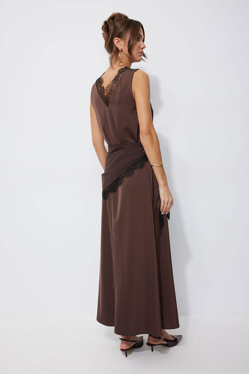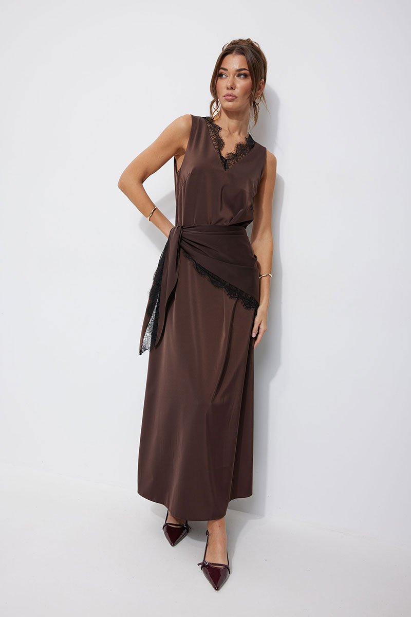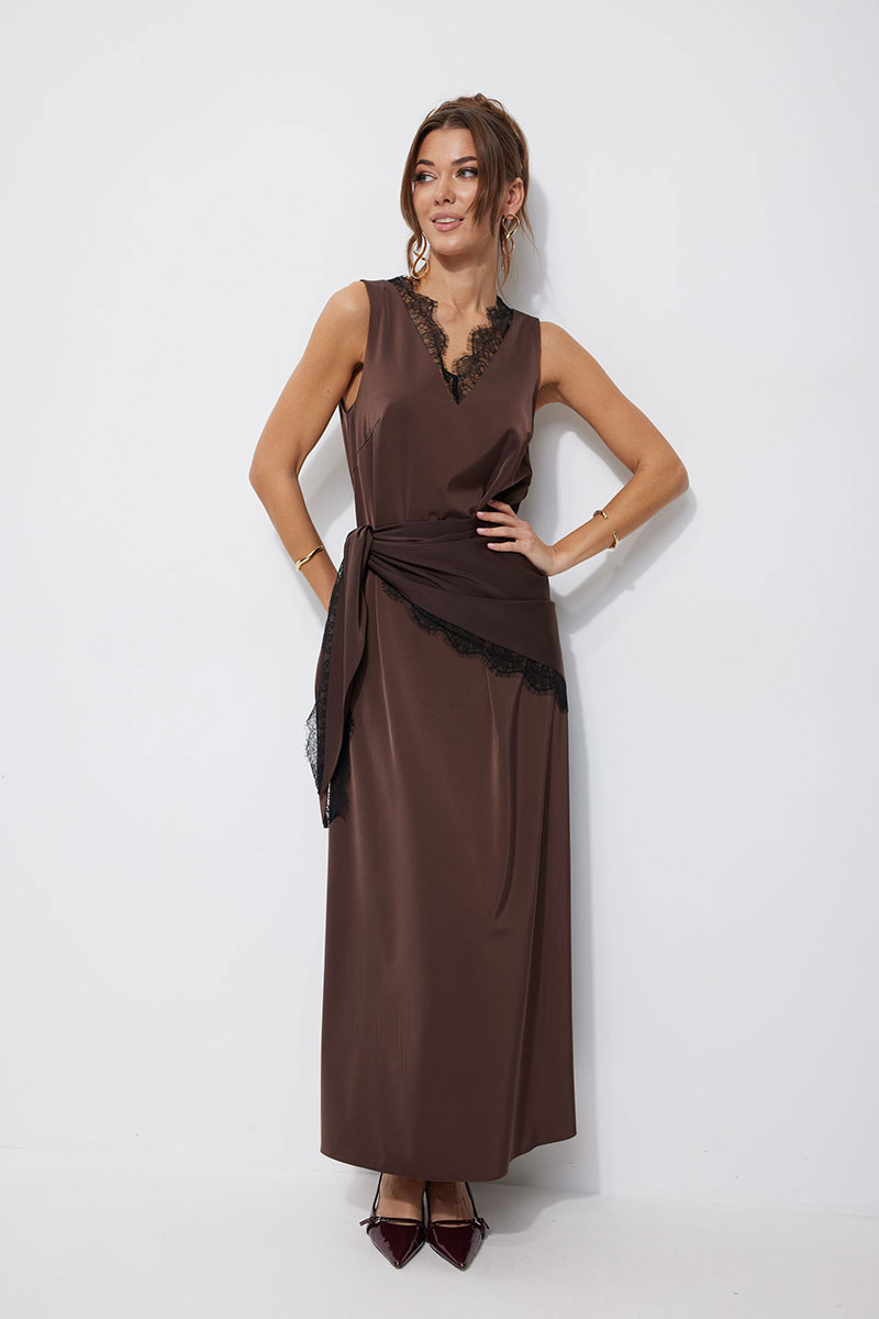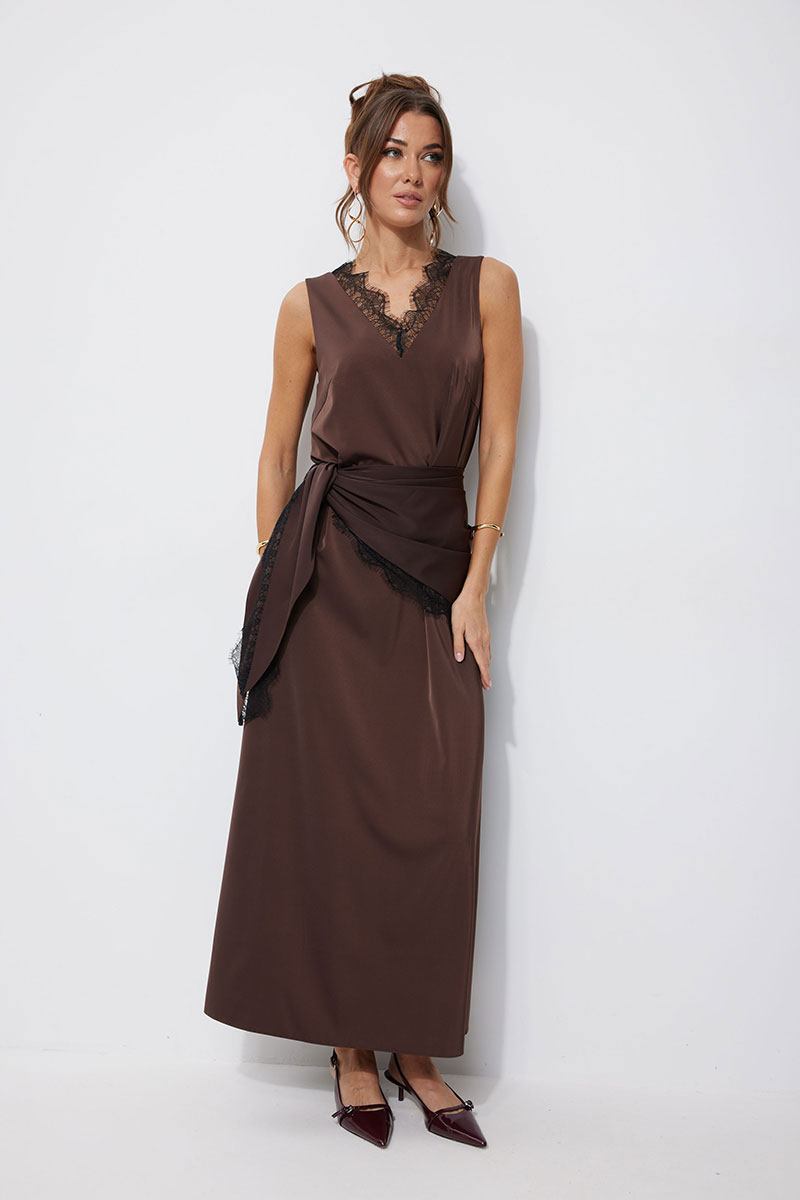 Нарядное платье из струящейся ткани, длина макси. Платье свободного кроя, прямое, расширенное к низу. С глубоким V-образным  вырезом горловины по  переду и спинке, декорированным французским кружевом. По переду нагрудные вытачки. Без рукава. Платье дополняется платком из основной ткани. Платок декорирован по двум срезам французским кружевом. Обращаем Ваше внимание, что кружево может незначительно отличаться от фото.