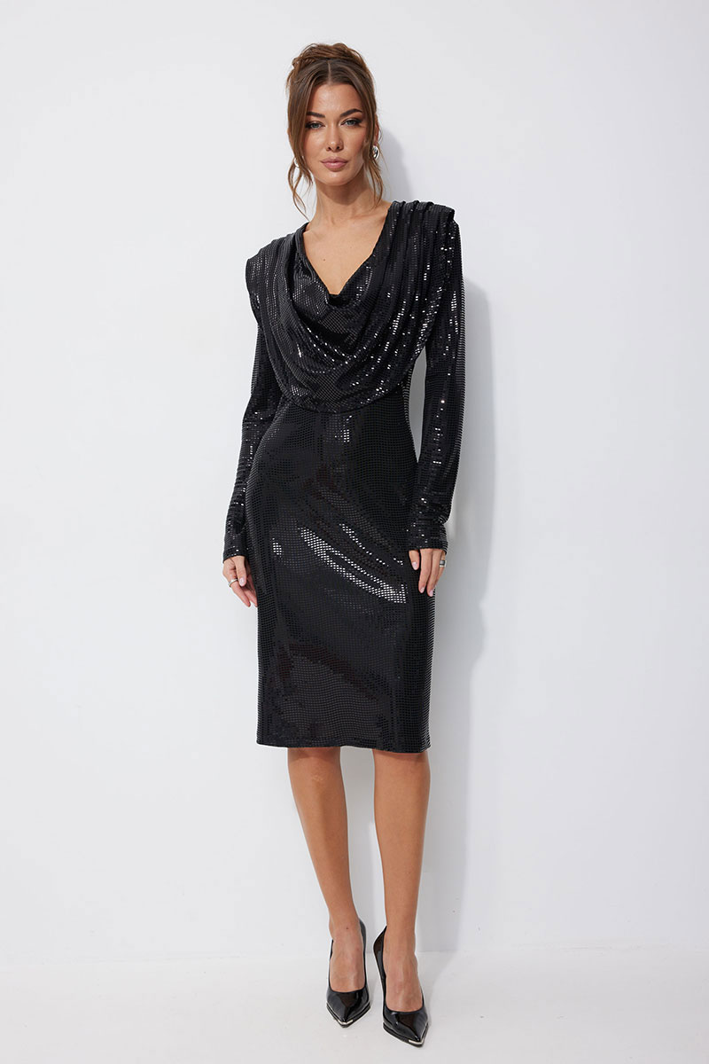 Платье полуприлегающего силуэта из трикотажного полотна. По переду глубокий вырез и декоративная деталь ’качель’. Рукав втачной удлиненный. На спинке талиевые вытачки.