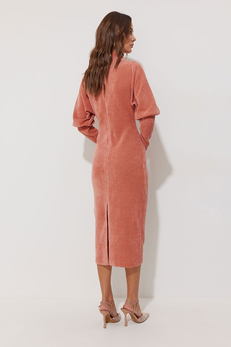 Платье полуприлегающего силуэта из трикотажного полотна. Горловина - цельнокроеная стойка. Рукав цельнокроеный, с подрезом выше уровня локтя и узкой длинной манжетой. Обращаем ваше внимание, что ремень в комплект не входит.