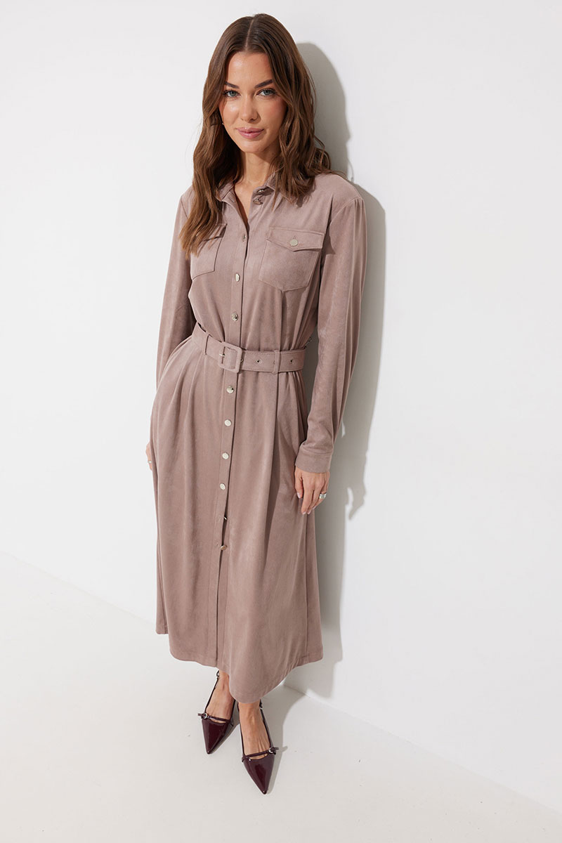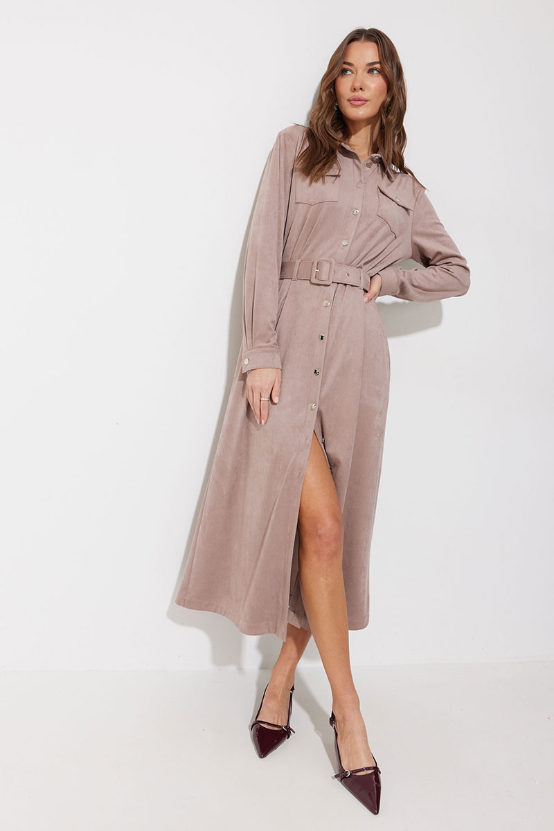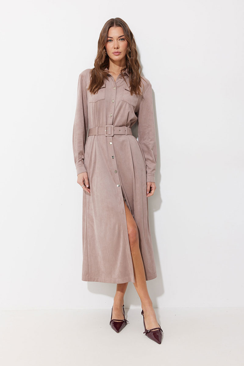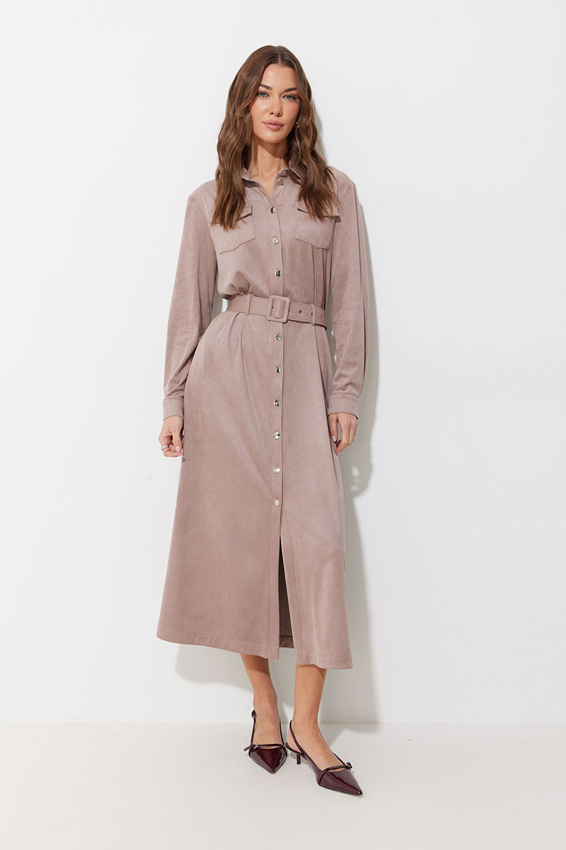 Платье-рубашка из трикотажного полотна «замша». Длина миди. Платье свободного кроя, с небольшим расширением к низу. С отложным воротником на отрезной стойке. Платье с центральной застежкой на петли и металлические пуговицы на ножке. По переду на уровне груди накладные карманы с клапанами, с застежкой на металлическую пуговицу на ножке. По спинке кокетка, бантовая складка, выходящая из-под кокетки. По переду и спинке на уровне линии талии настрочены шлевки. Рукав длинный, двухшовный, с двумя складками по нижнему срезу, с манжетой с застежкой на металлическую пуговицу на ножке. По воротнику, манжетам, кокетке, локтевому шву выполнены отделочные строчки. Платье дополняется съемным поясом с прямоугольной пряжкой. Пояс выполнен из основной ткани. Обращаем Ваше внимание, что фурнитура может незначительно отличаться от фото.
