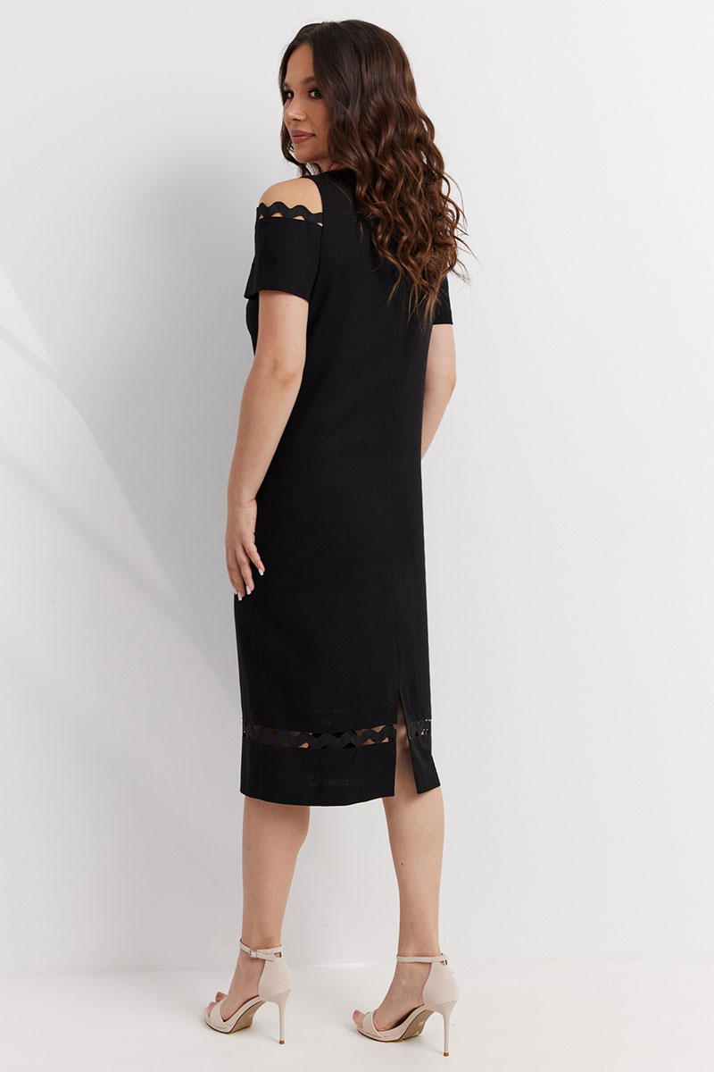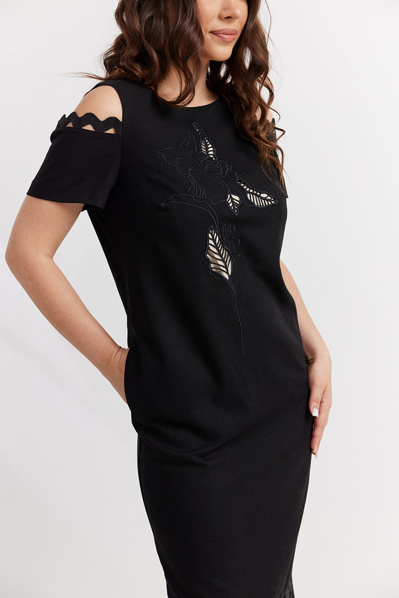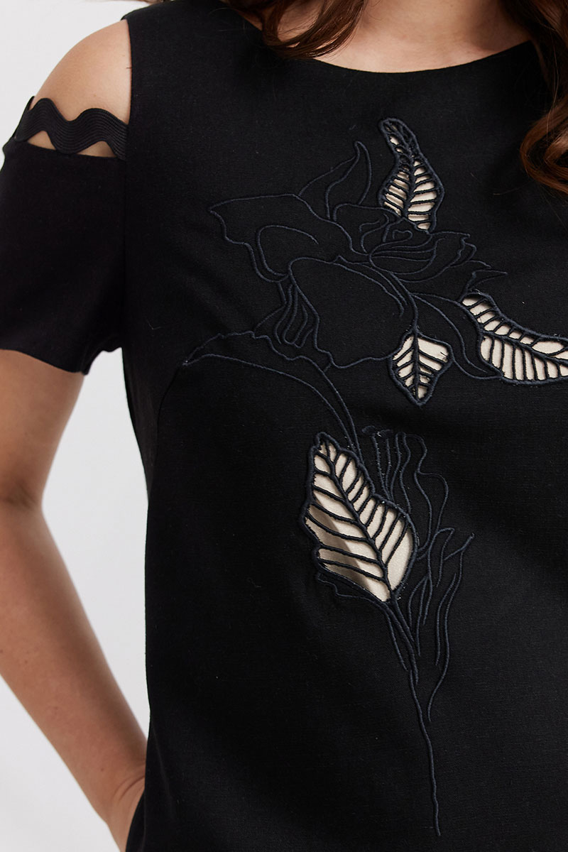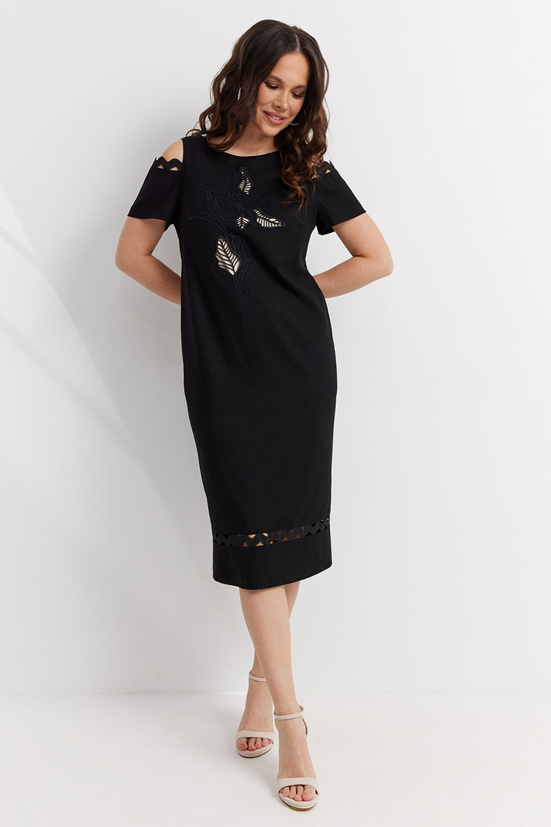 Элегантное платье прямого силуэта. Выполнено из смесовой натуральной ткани. Дополнено красивой вышивкой и декоративными тесьмами. По спинке застежка на потайную молнию.