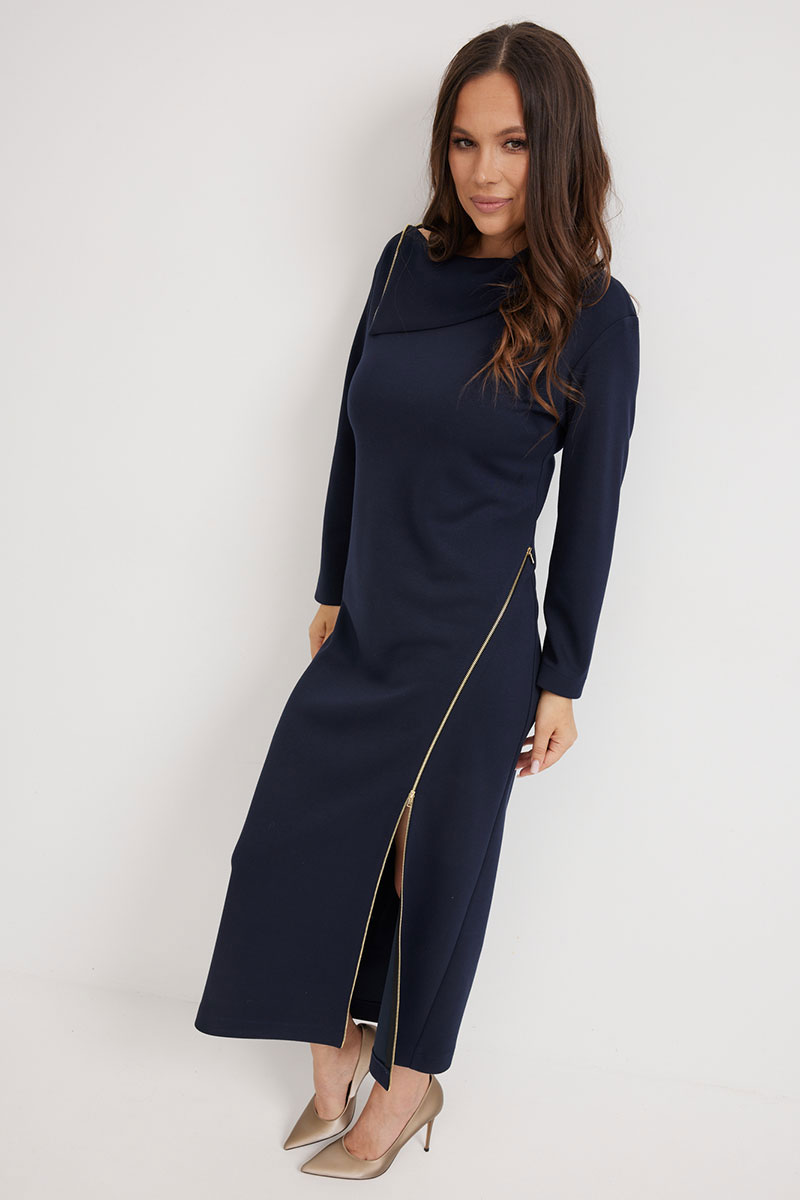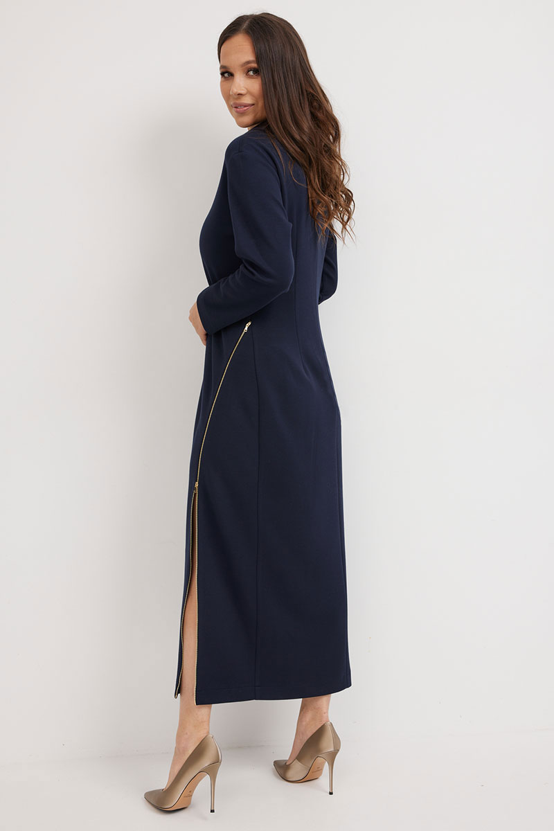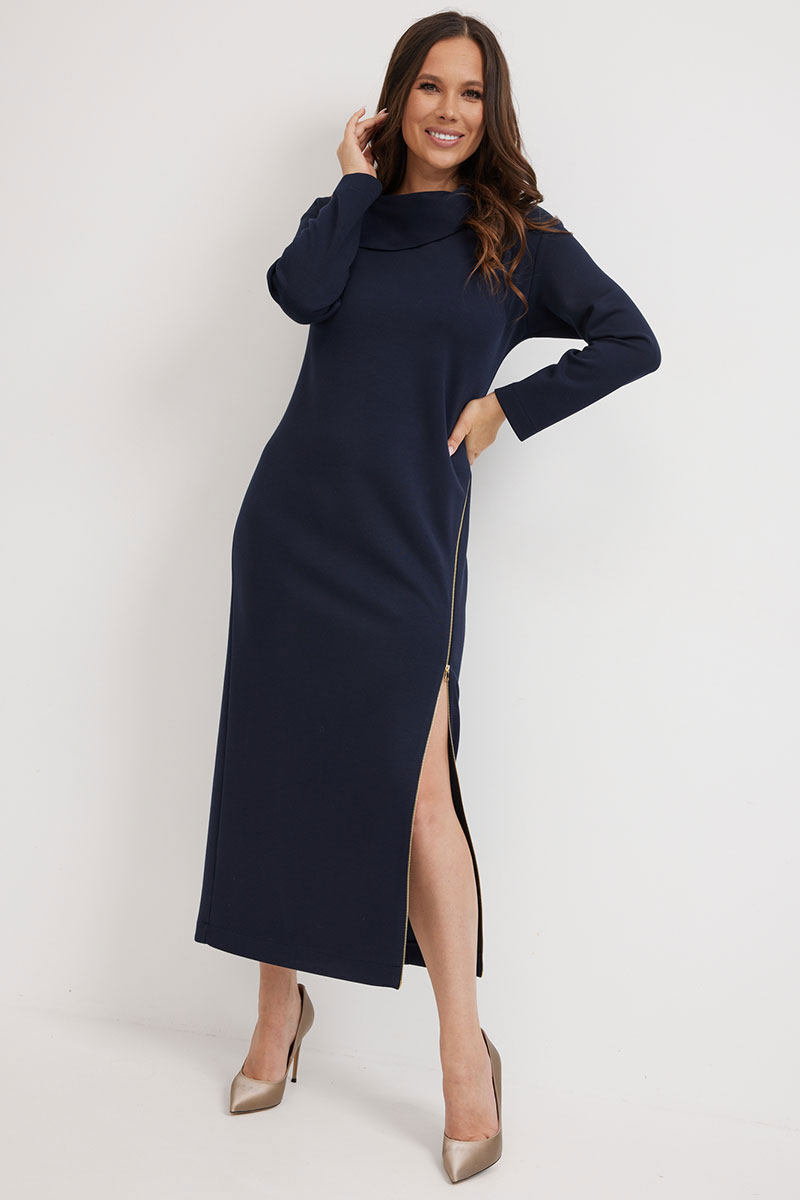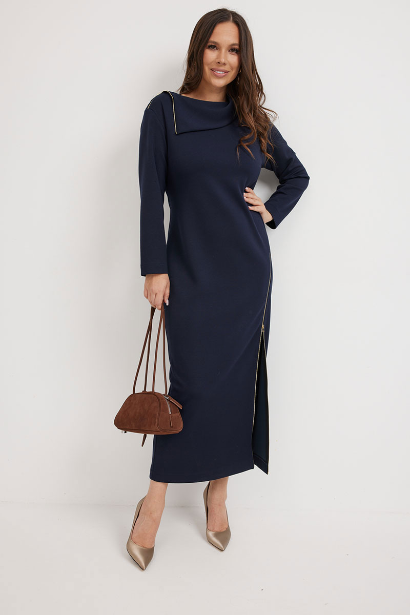 Элегантное и стильное платье миди полуприлегающего силуэта. Выполнено из приятного к телу комфортного гладкого трикотажного полотна. Рукав втачной, полной длины. Украшением платья являются функциональные тесьмы молнии. С их помощью можно стильно уложить воротник и отрегулировать вырез платья. Из лаконичного базового платье легко трансформируется в стильное и сексуальное.