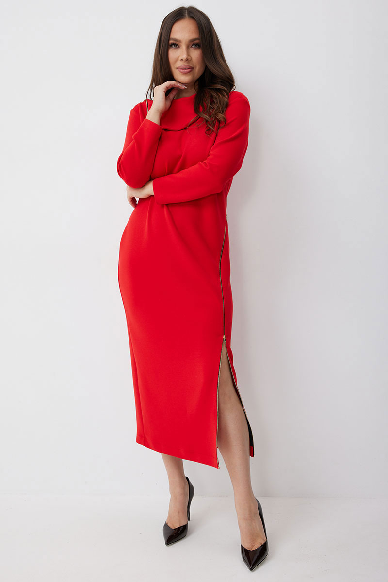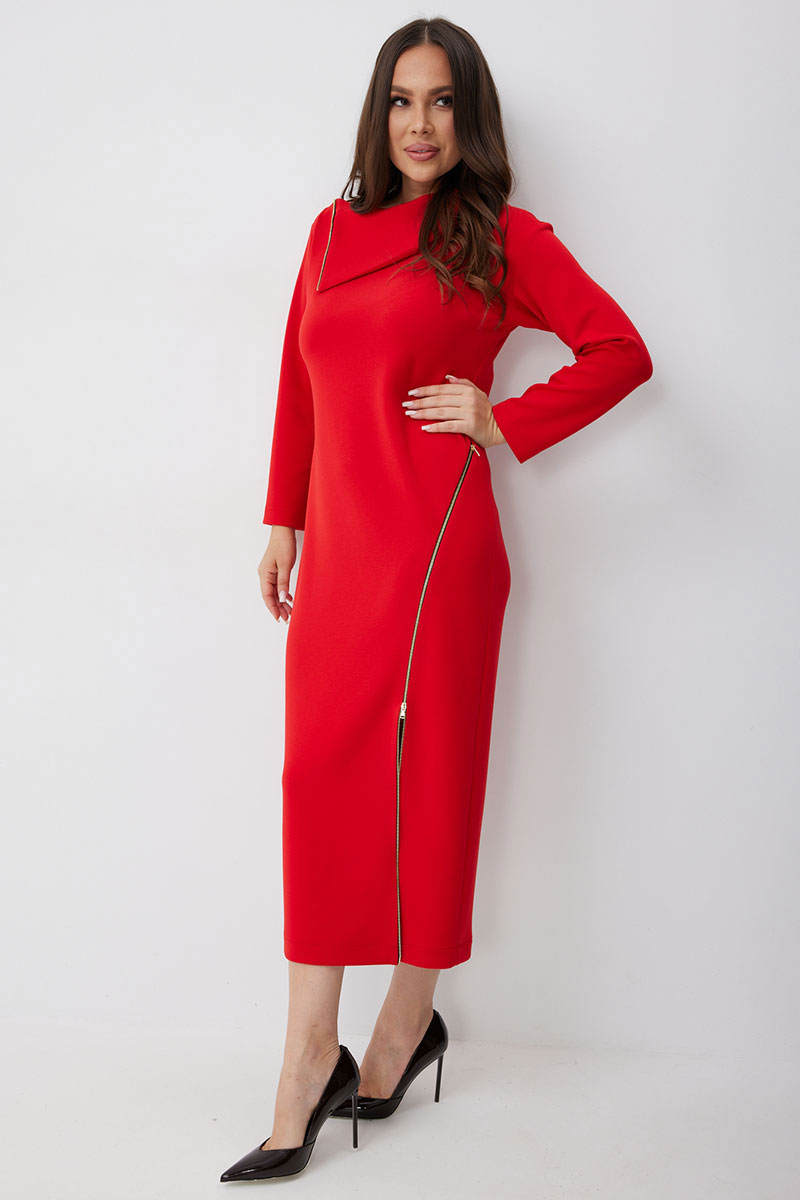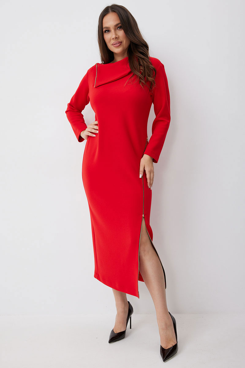 Элегантное и стильное платье миди полуприлегающего силуэта. Выполнено из приятного к телу комфортного гладкого трикотажного полотна. Рукав втачной, полной длины. Украшением платья являются функциональные тесьмы молнии. С их помощью можно стильно уложить воротник и отрегулировать вырез платья. Из лаконичного базового платье легко трансформируется в стильное и сексуальное.