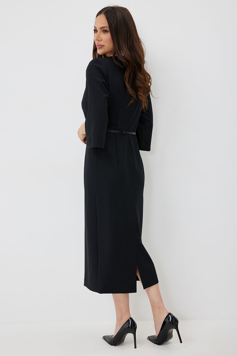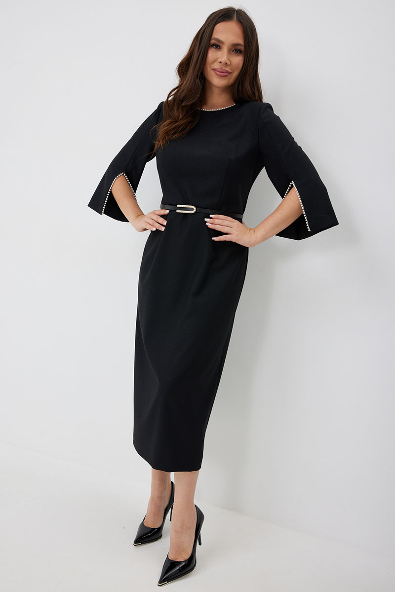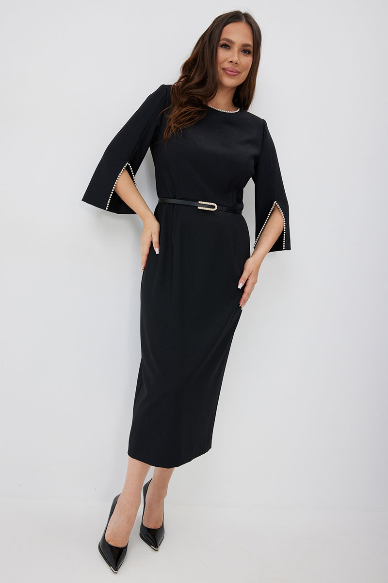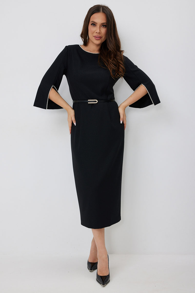 Стильное и утонченное платье прилегающего силуэта из красивой гладкой, слегка мерцающей ткани. Рукав втачной, с разрезами. Горловина округлой формы. По талии платье отрезное. По спинке застежка на потайную молнию, по низу шлица. Платье дополнено по горловине и рукавам декоративной тесьмой с жемчужной нитью. По талии дополнено красивым кожаным поясом с отделкой из жемчуга на пряжке.