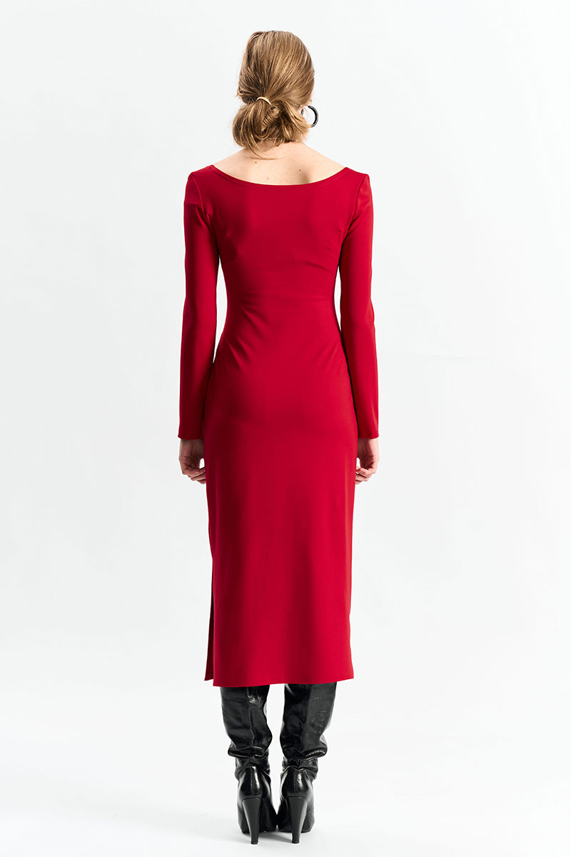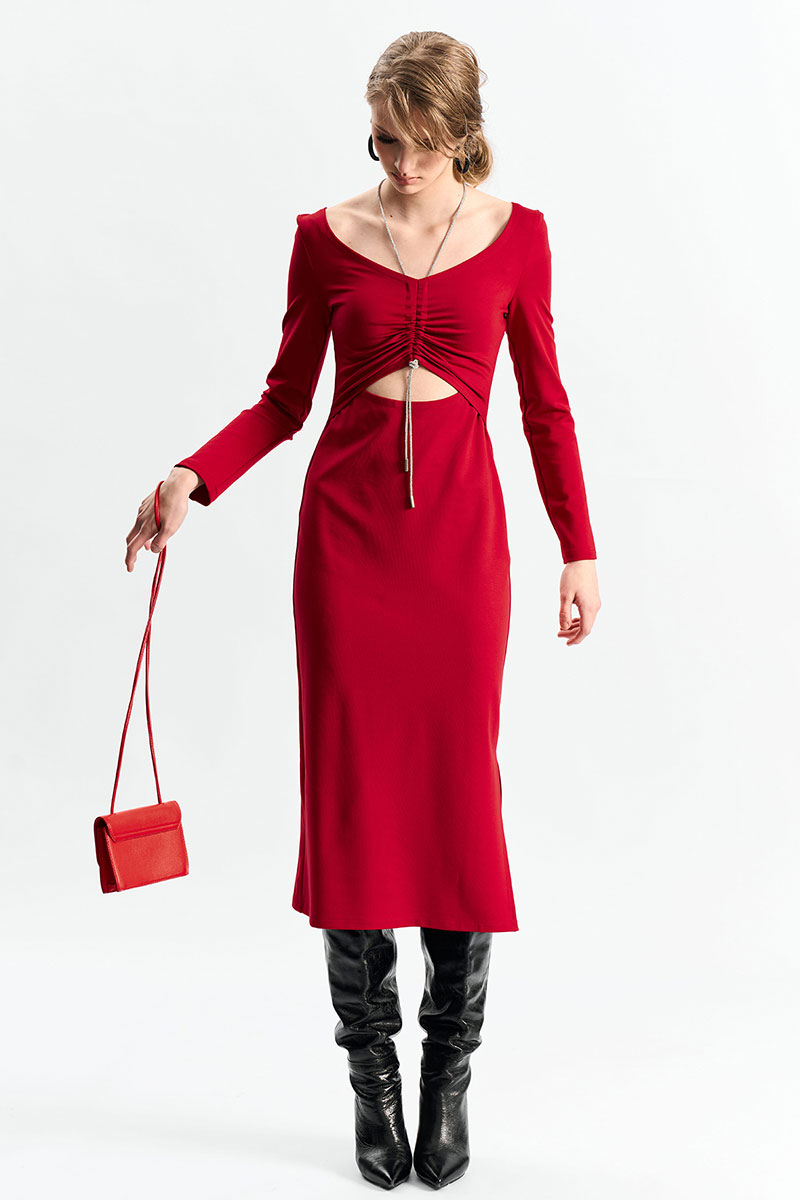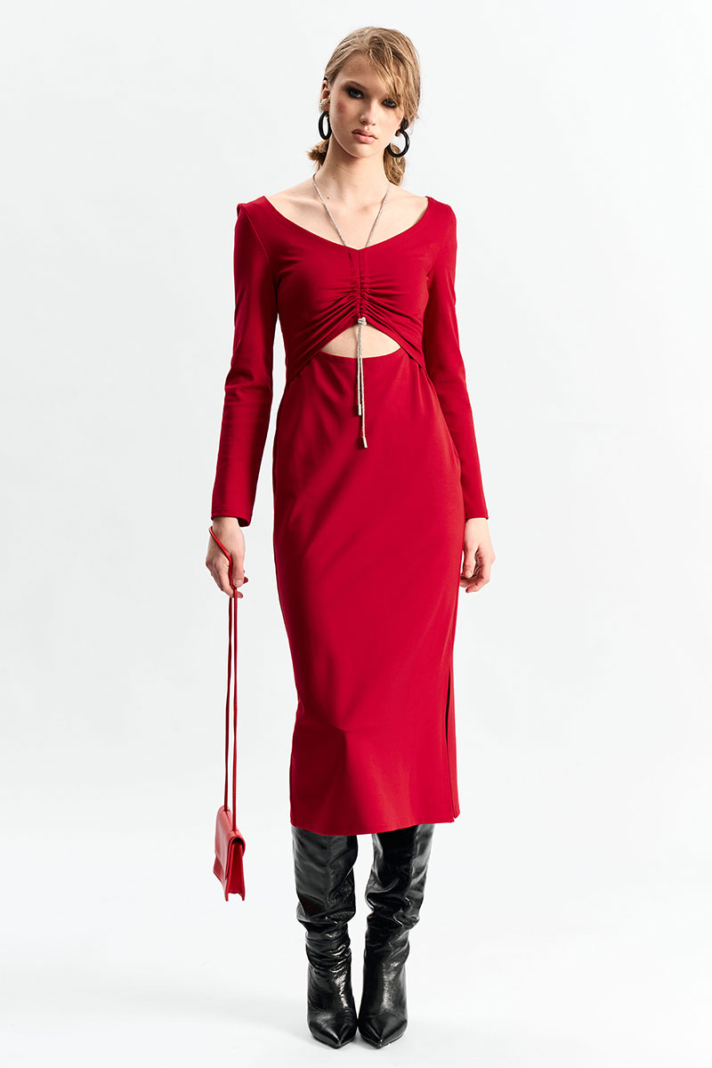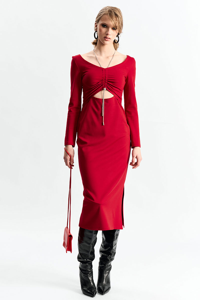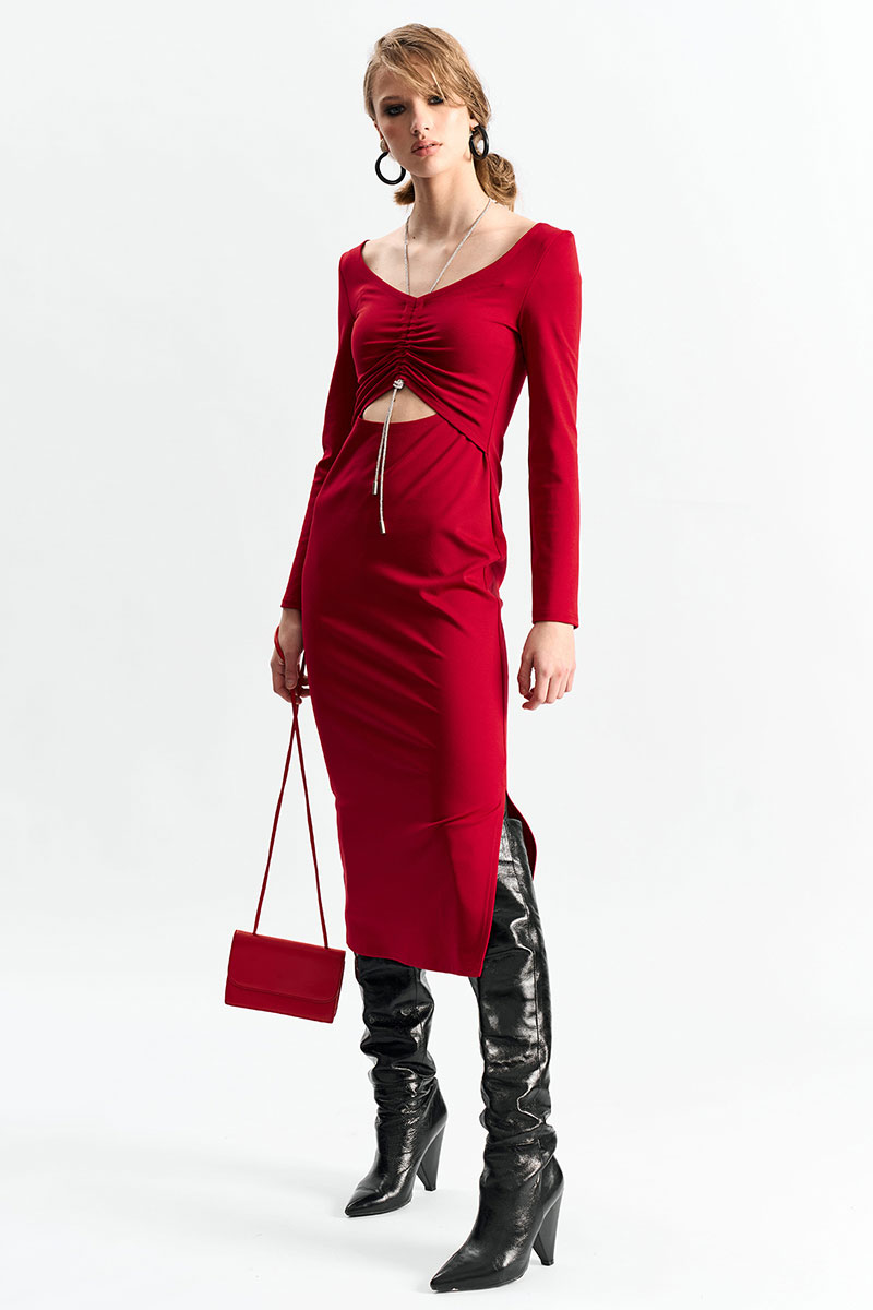 Платье прилегающего силуэта с подрезом в области талии и декоративным шнуром со стразами с затяжкой по груди.