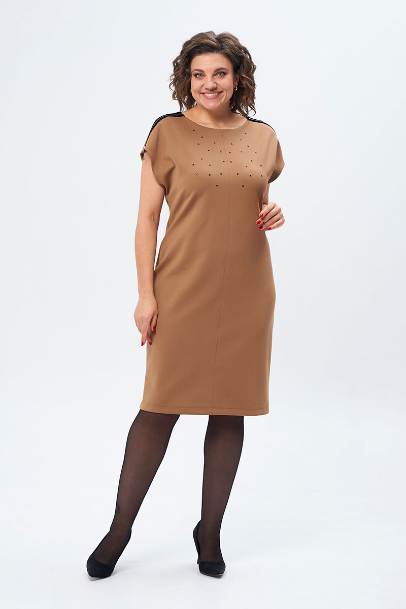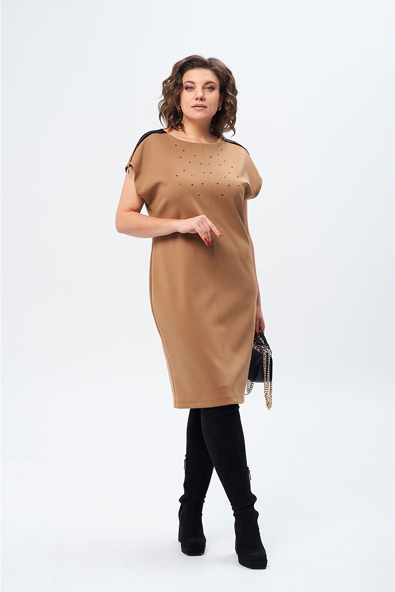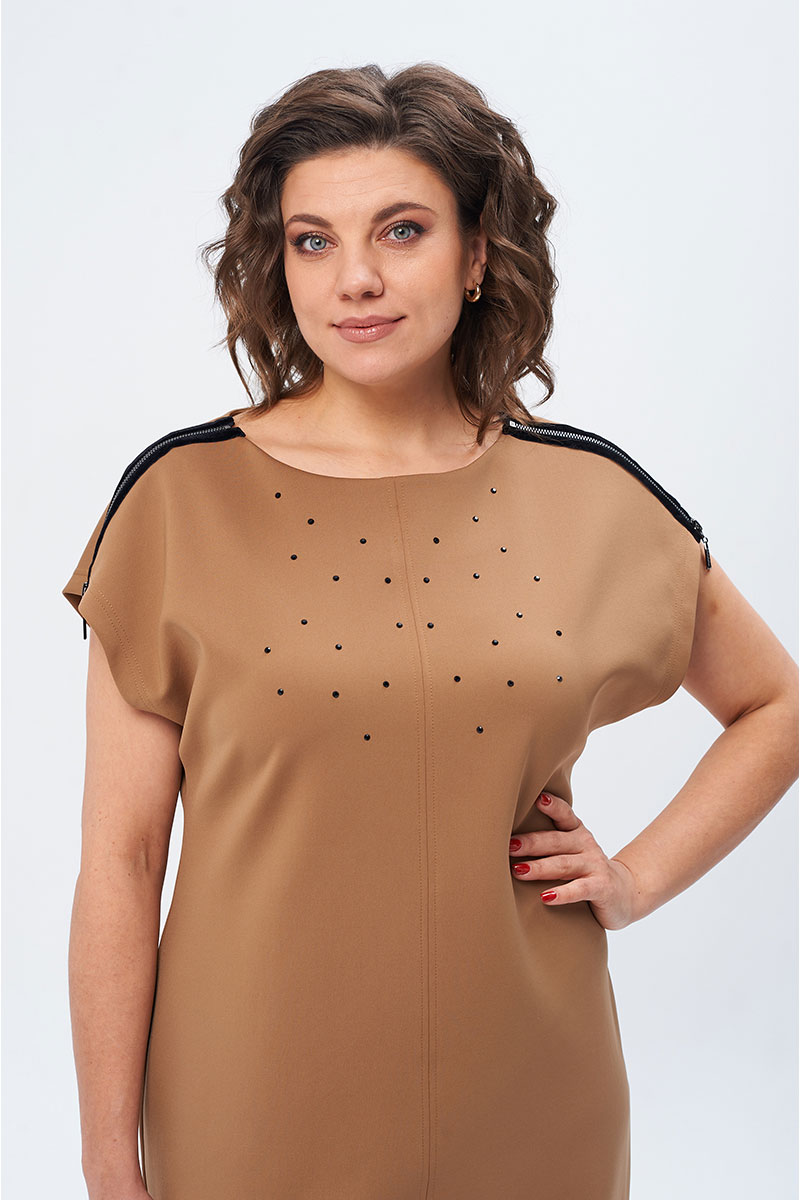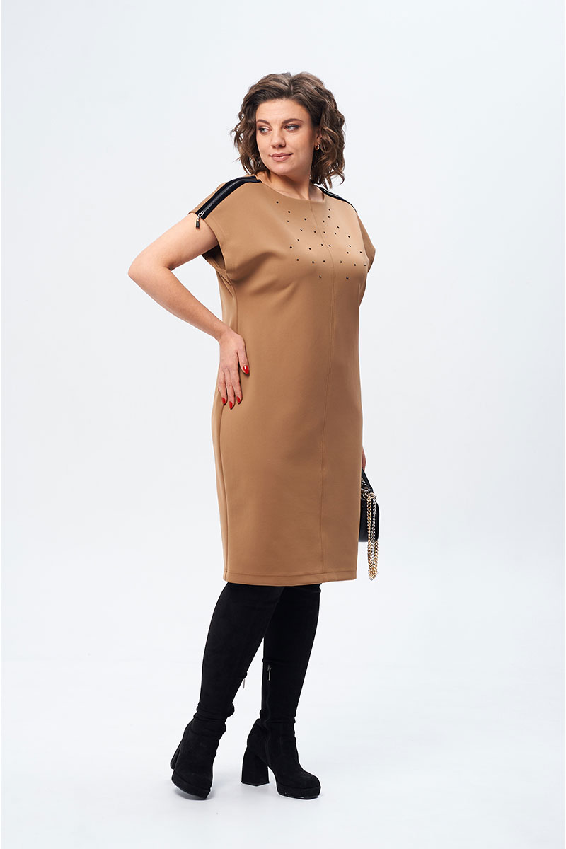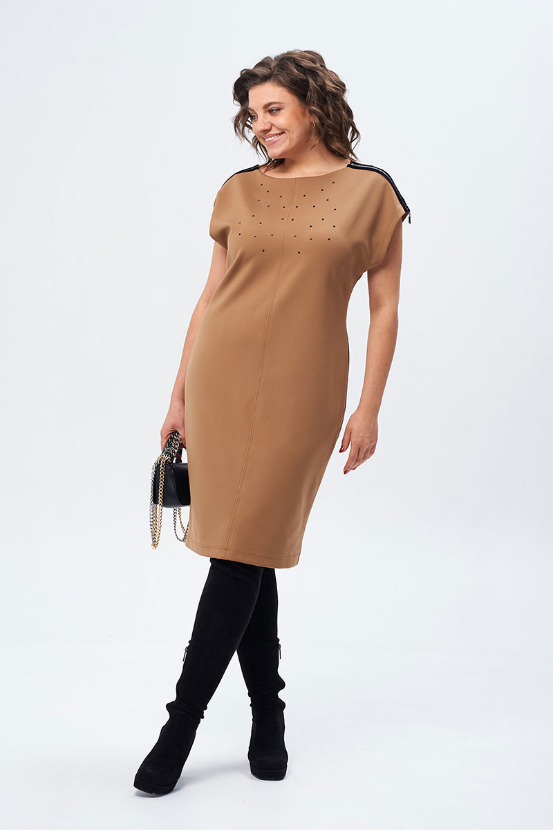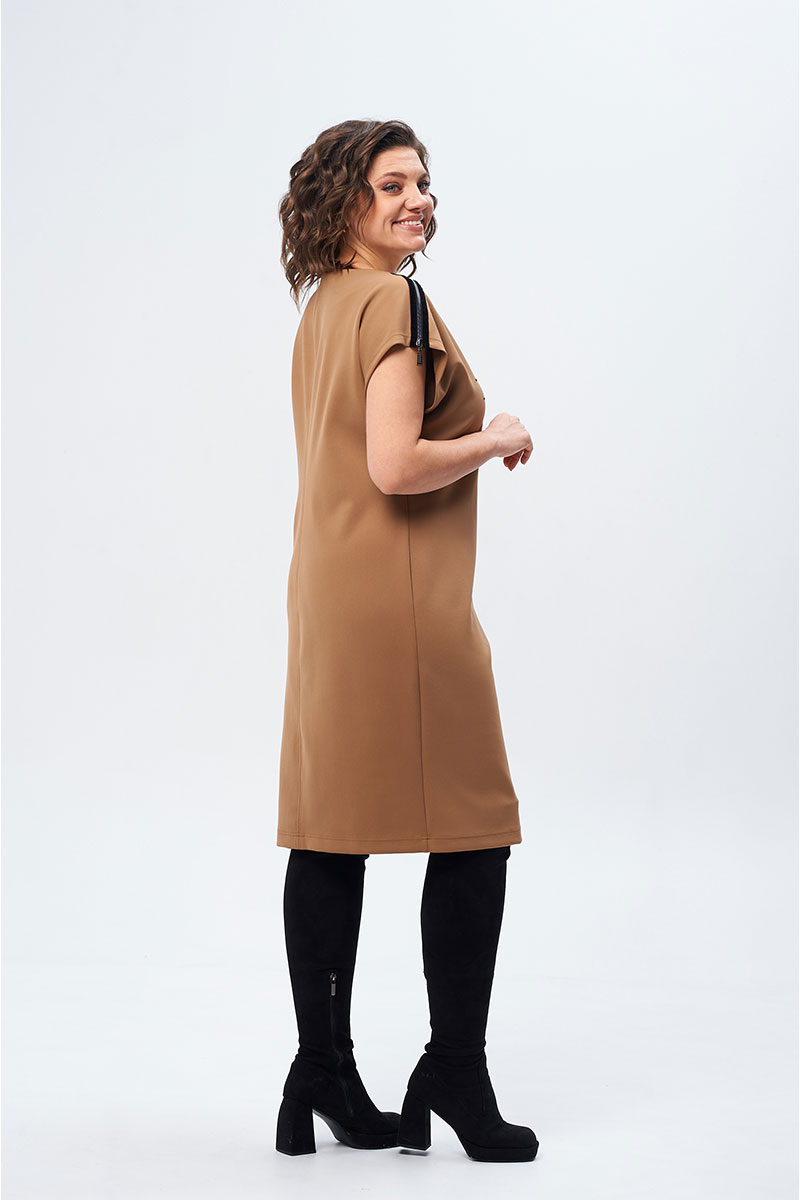 Платье, которое отлично вольется в ваш гардероб и станет незаменимой частью как на праздничном мероприятии, так и в офис на каждый день. Женское платье-футляр из эластичного плотного однотонного трикотажа. Платье полуприлегающего силуэта, длиной до колена, без рукавов, со спущенным плечом. Вырез горловины "лодочка". По средним швам переда и спинки отделочные строчки. Платье декорировано функциональными декоративными молниями, вставленными в плечевые швы и нагрудными стразами контрастного черного цвета. Платье хорошо сочетается различными аксессуарами и пиджаками.