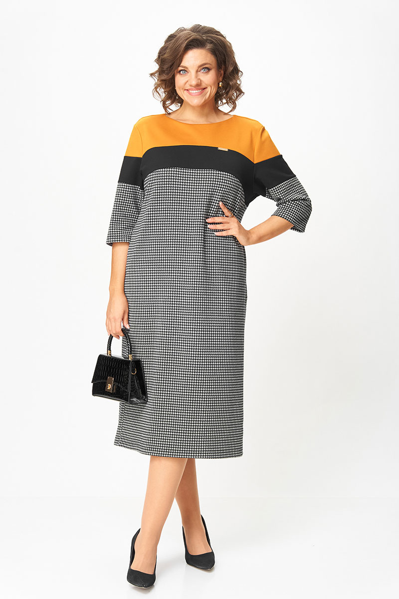 Это платье создано для женщин, которые выбирают комфорт и элегантность каждый день. Плотный трикотаж высокого качества мягко обнимает фигуру, не теряя форму, не вытягивается и не просвечивает. Контрастное сочетание горчичного, чёрного и классического принта “гусиная лапка” визуально стройнит и освежает образ. Рукав ¾ и длина миди делают модель практичной и универсальной — удобно и в офисе, и на прогулке, и на встрече.