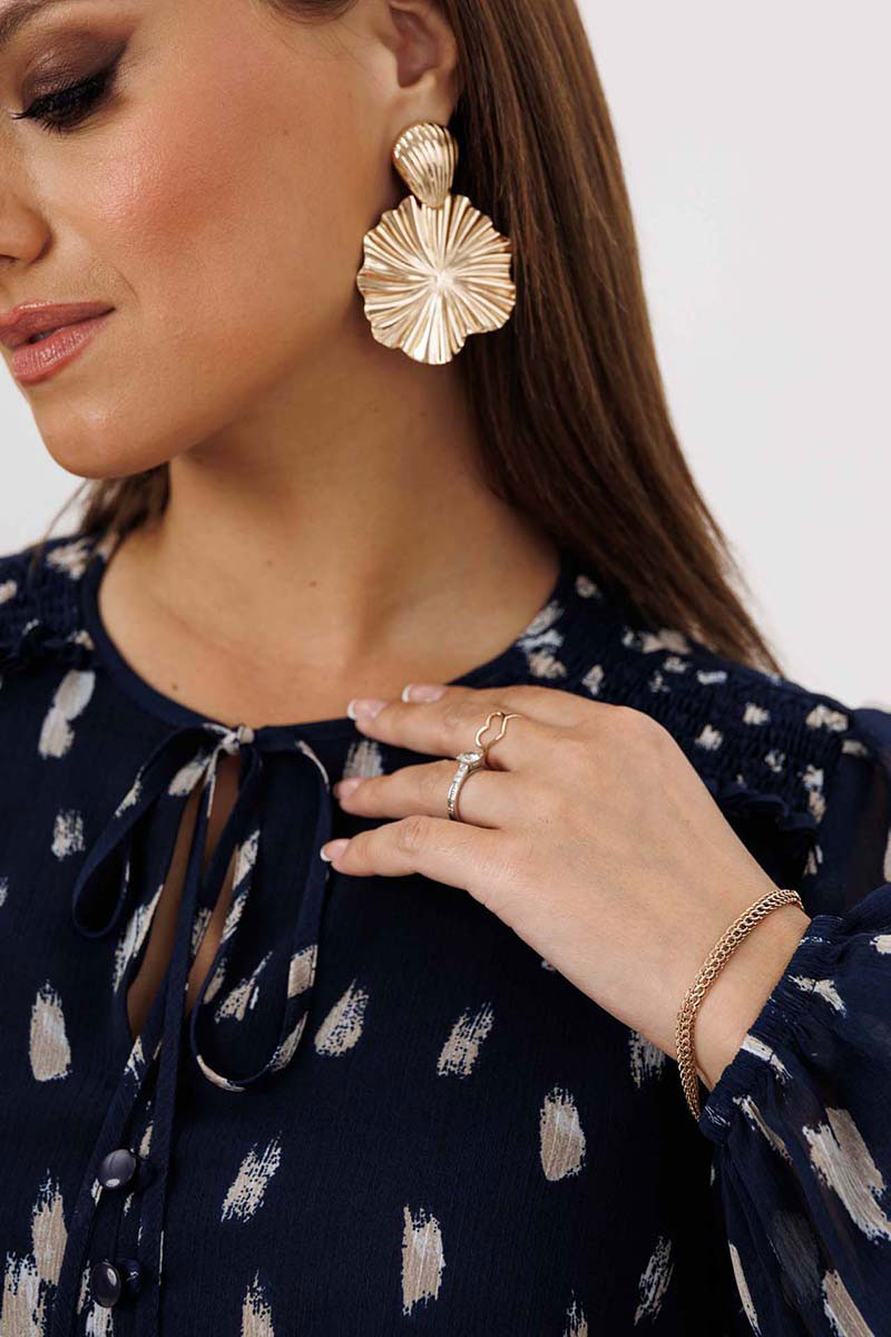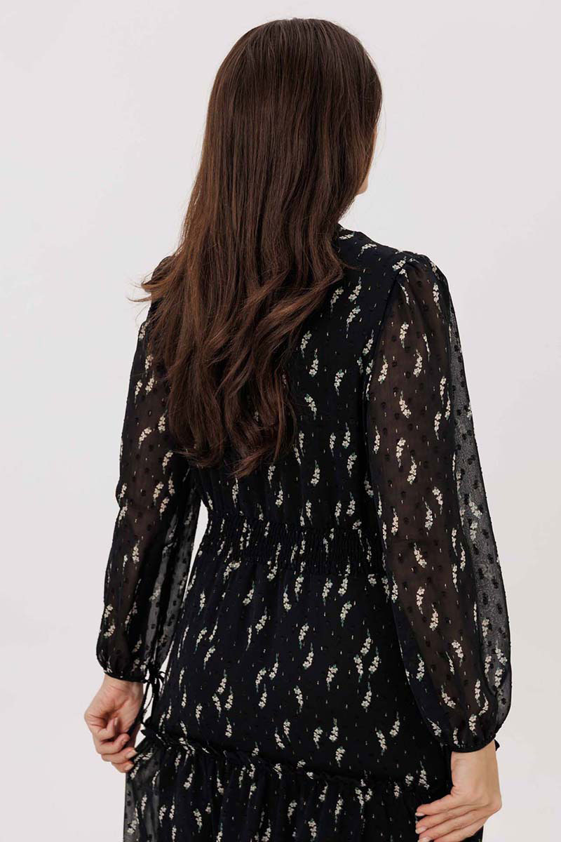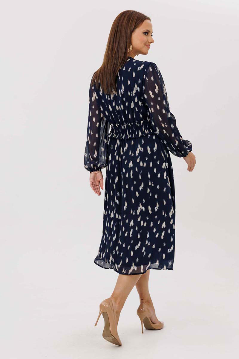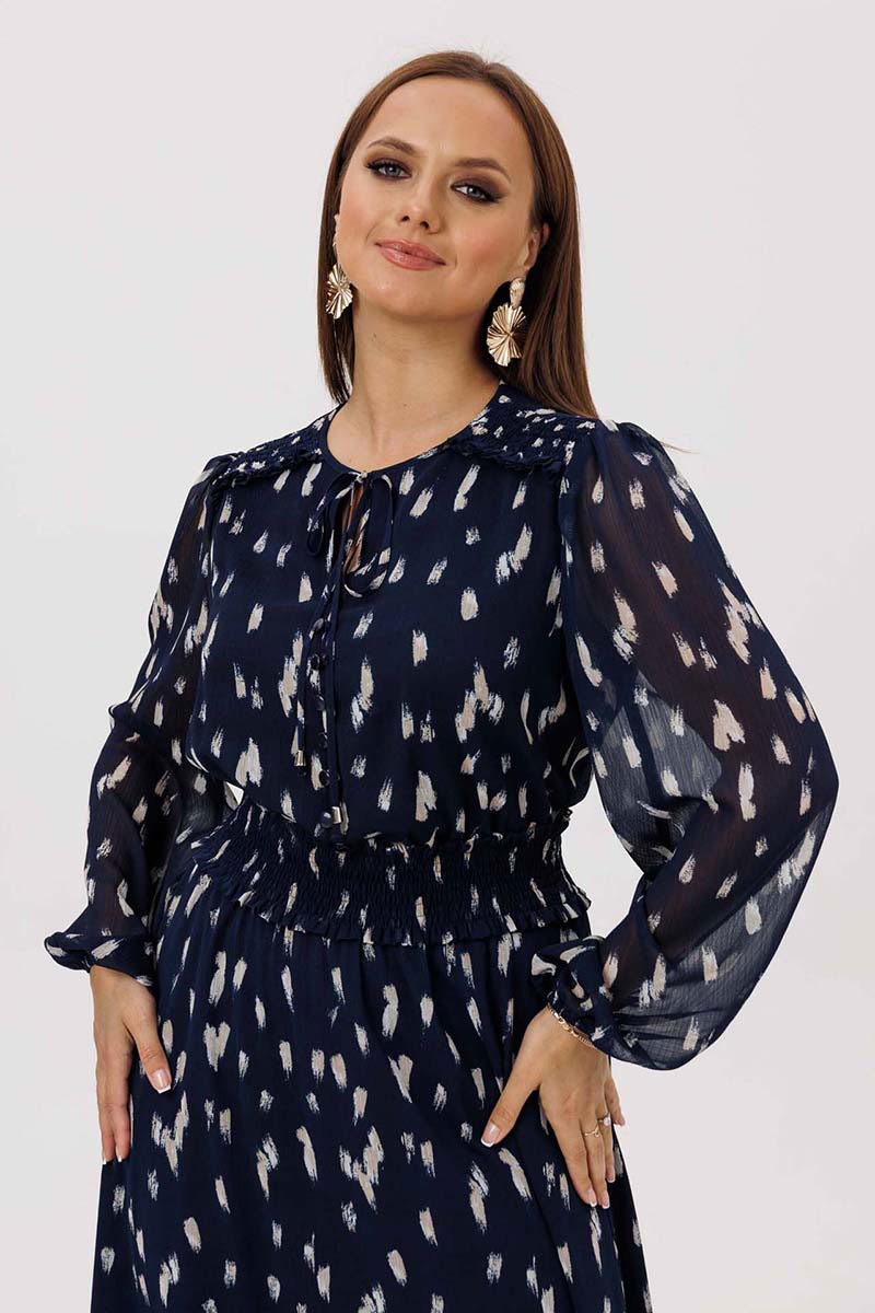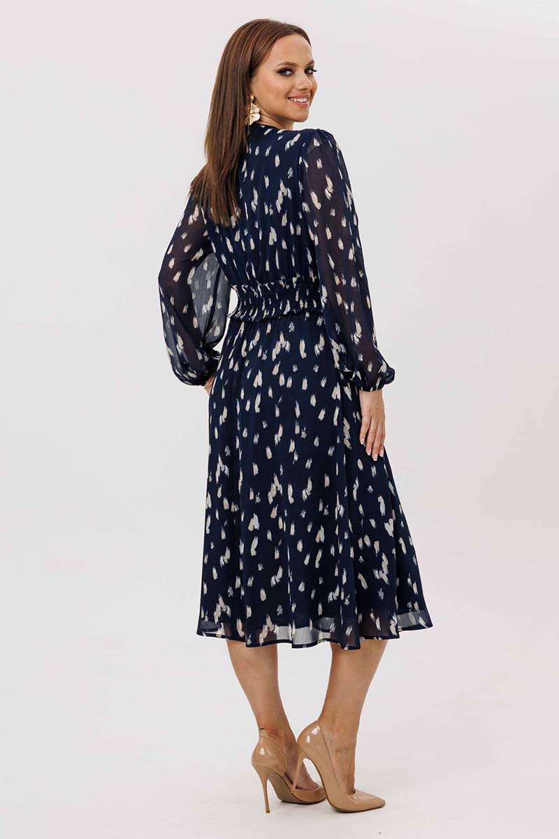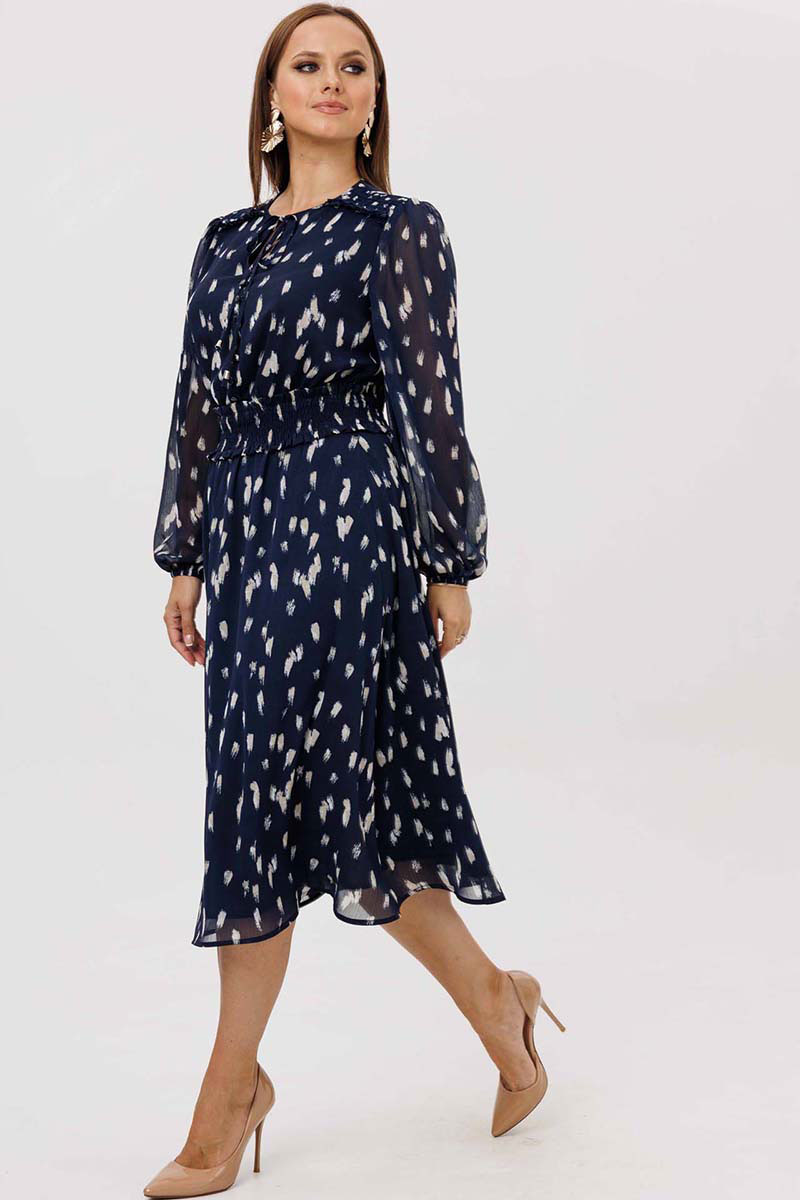 Платье женское свободного силуэта, отрезное по линии талии, расклешённое к низу, выполнено из ткани шифон. По линии талии сборка на резинку «венгерку». Горловина v-образная с небольшими рюшей по переду до линии талии на завязках. Передняя полочка дополнительно украшена рюшами. Рукава одно шовные втачные, по низу легкая сборка. Платье на тонкой трикотажной подкладке с декоративной пришивной тесьмой..