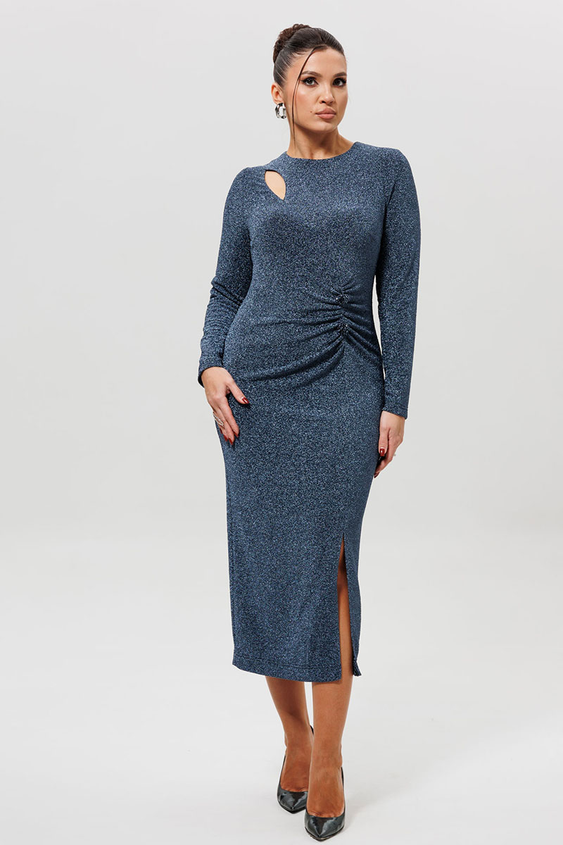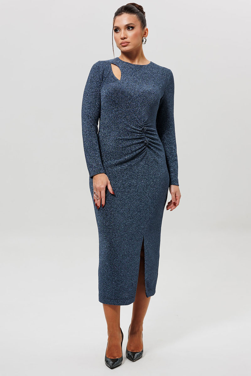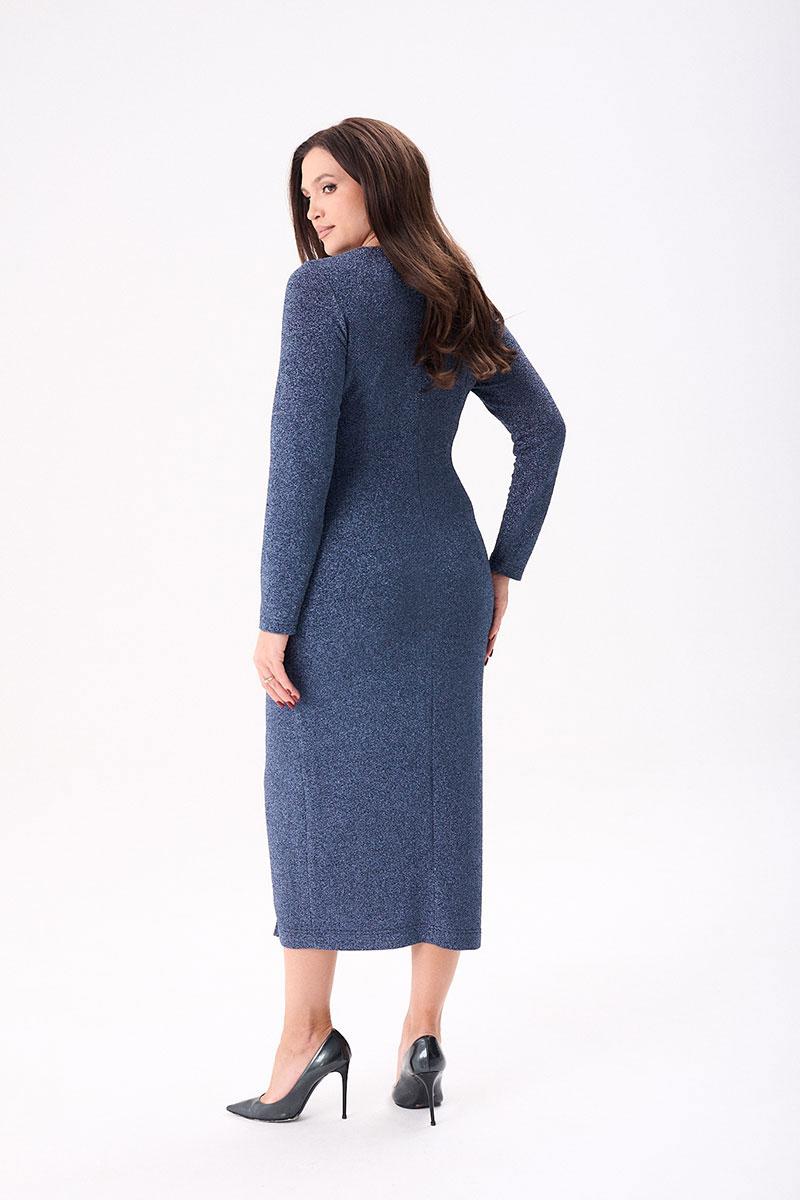 Платье полуприлегающего силуэта с ассиметричным фигурным подрезом, в верху которого расположен фиругрый вырез. Подрез заканчивается разрезом. В середине подреза сборка. По переду нагрудные вытачки. Спинка со средним швом, в который вставлена тесьма-молния. По спинке талиевые вытачки. Рукав одношовный, втачной. Горловина на обтачке. Дополняют модель пришитые декоративные броши.