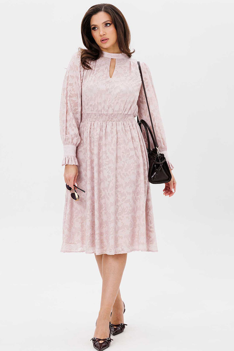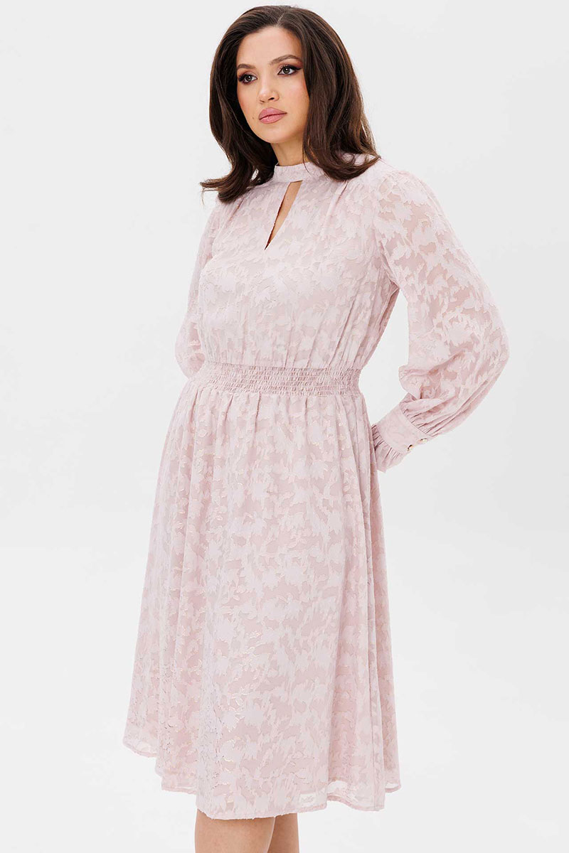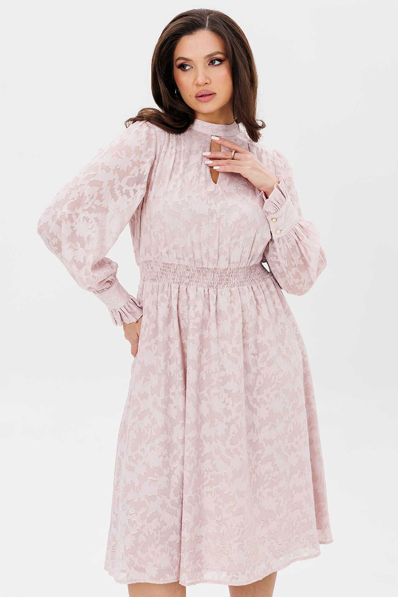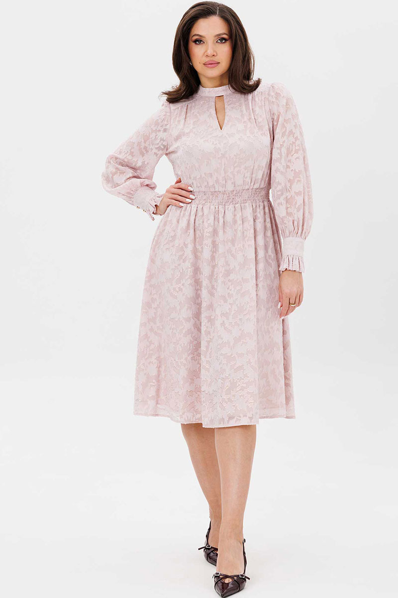 Платье женское свободного силуэта, отрезное по линии талии, расклешённое к низу, выполнено из ткани шифон. По линии талии сборка на резинку «венгерку». По переду кокетки с небольшой сборкой. Воротник стойка переходит в завязку по спинке. Рукава одно шовные втачные свободные, по низу манжет с втачной рюшей на застёжке на две прорезные петли и пуговицы. Платье на тонкой трикотажной подкладке.