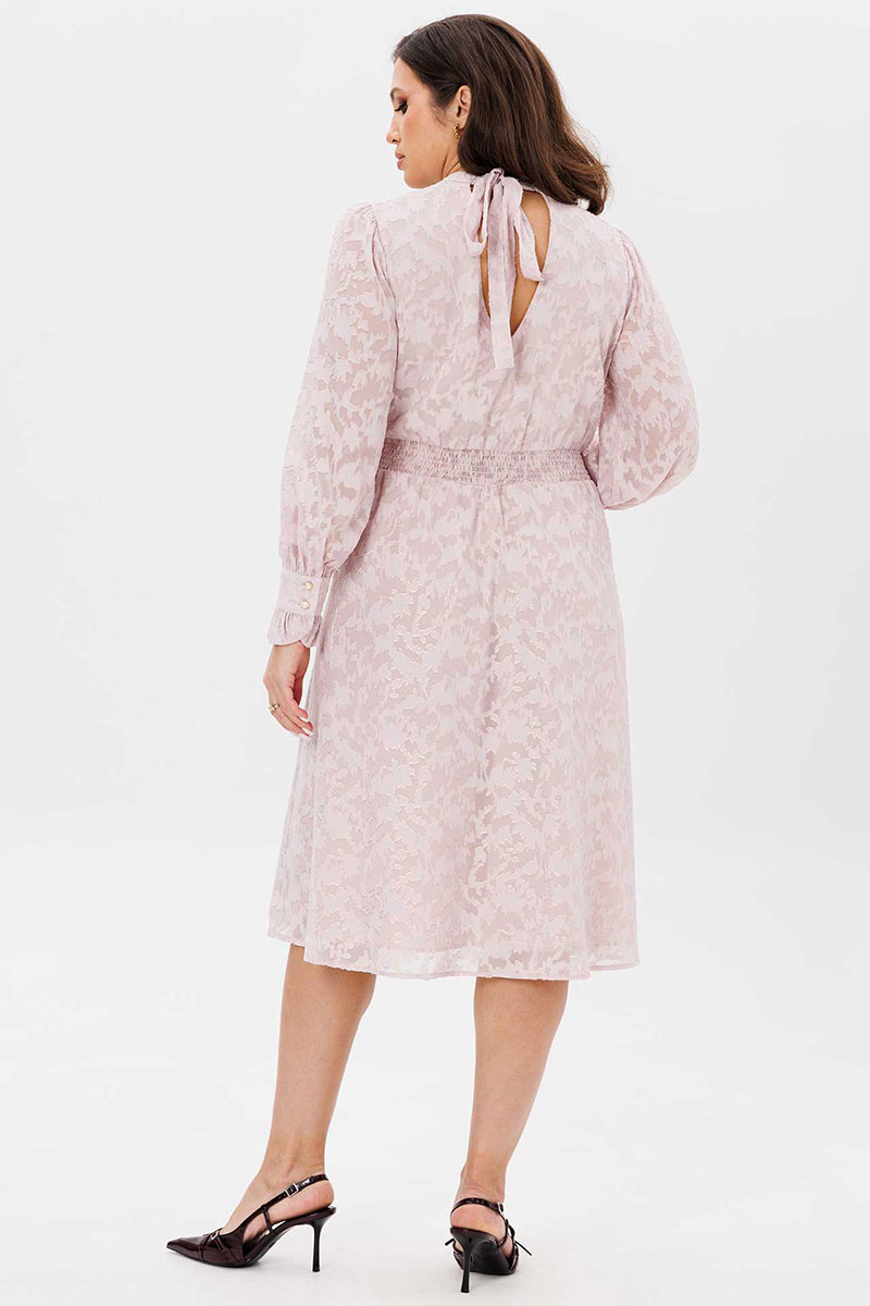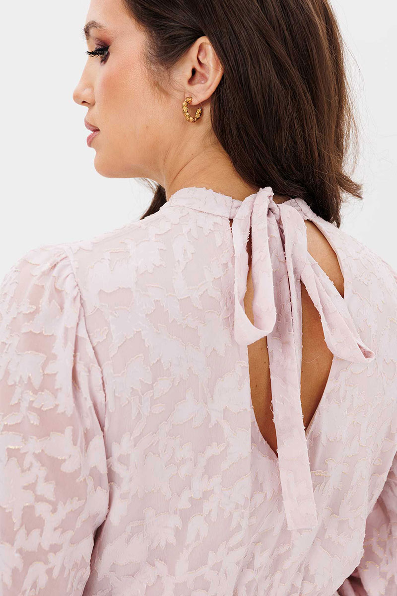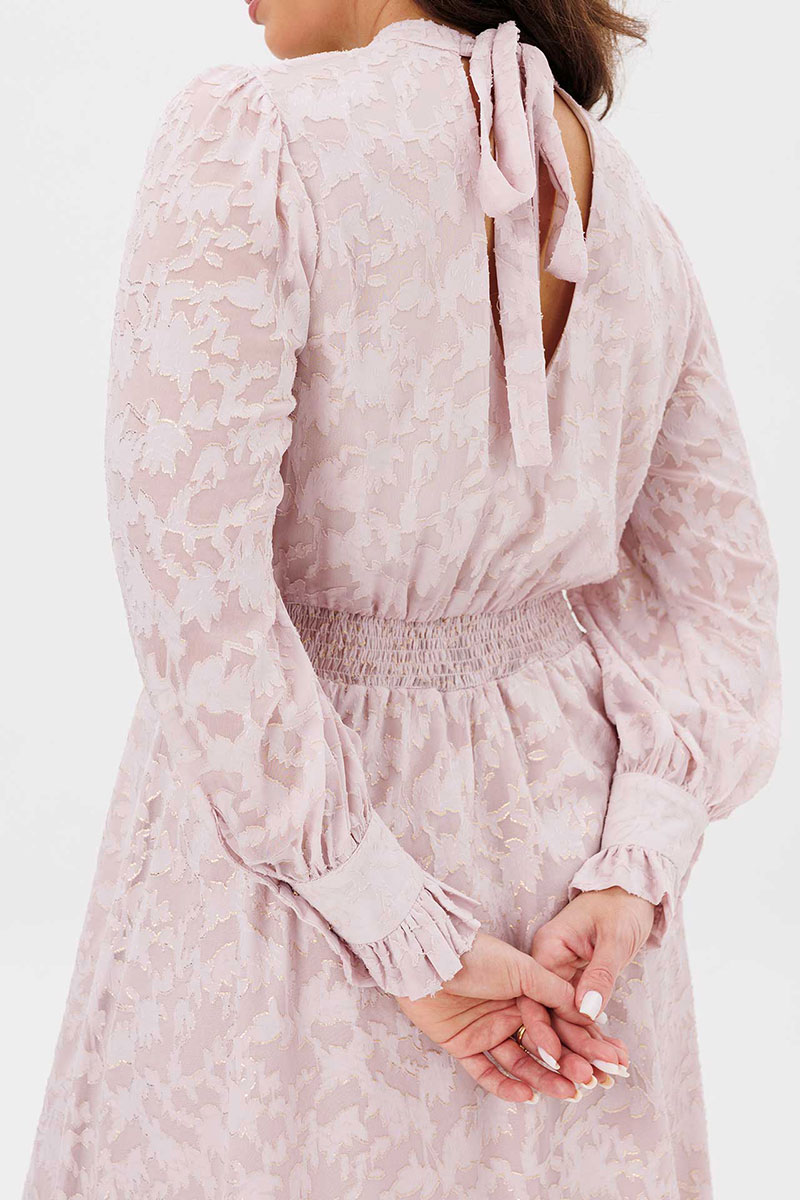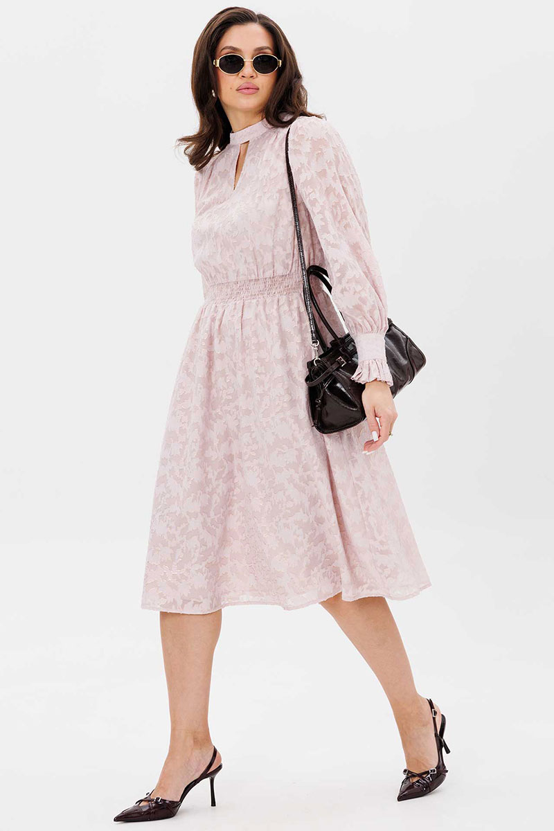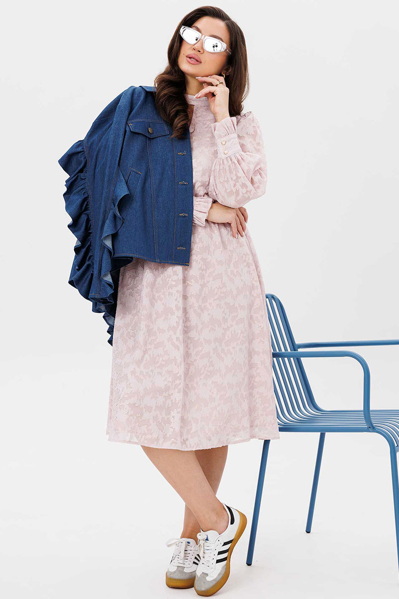 Платье женское свободного силуэта, отрезное по линии талии, расклешённое к низу, выполнено из ткани шифон. По линии талии сборка на резинку «венгерку». По переду кокетки с небольшой сборкой. Воротник стойка переходит в завязку по спинке. Рукава одно шовные втачные свободные, по низу манжет с втачной рюшей на застёжке на две прорезные петли и пуговицы. Платье на тонкой трикотажной подкладке.