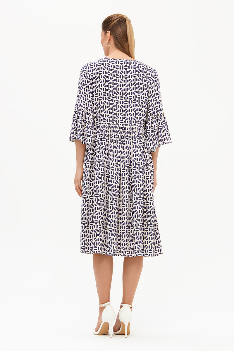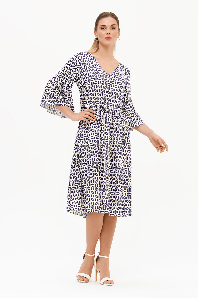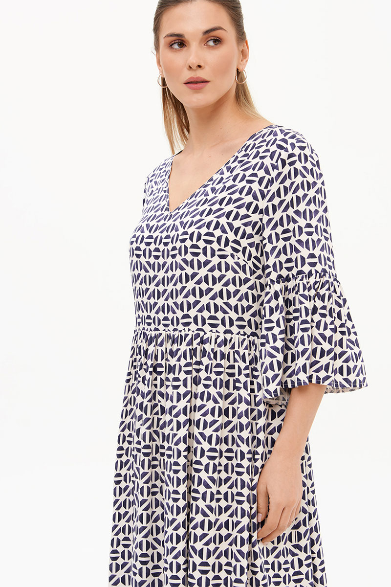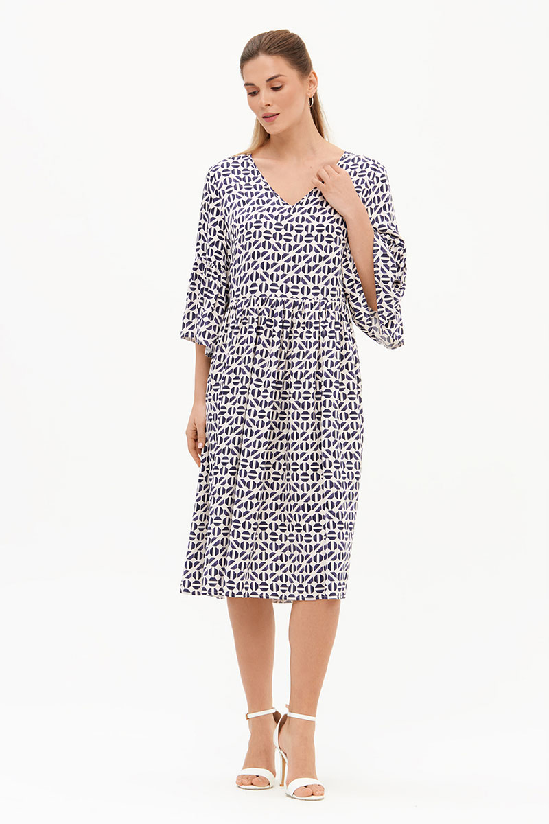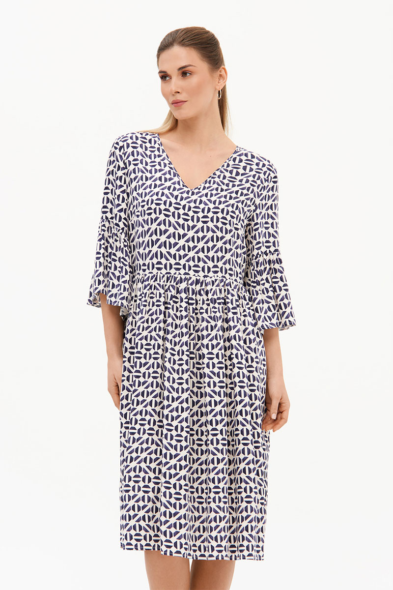 Платье женское от бренда FRIDAY by NELVA - это идеальный выбор для женщин, ценящих комфорт и стиль. Данная модель выполнена из принтованного полотна на основе вискозы, она приятна к телу и обладает отличной воздухопроницаемостью. Платье имеет свободный силуэт с отрезной линией талии, что позволяет не сковывать движения, обеспечивая максимальный комфорт и стильный вид в любое время. V-образной вырез горловиты окантован косой бейкой, придавая изделию завершенный вид. Низ рукава с воланом сосборен по шву притачивания, делая образ женственным и легким. Платье станет идеальным выбором как для отдыха, так и романтических встреч. Вы будете чувствовать себя комфортно в течение всего дня.