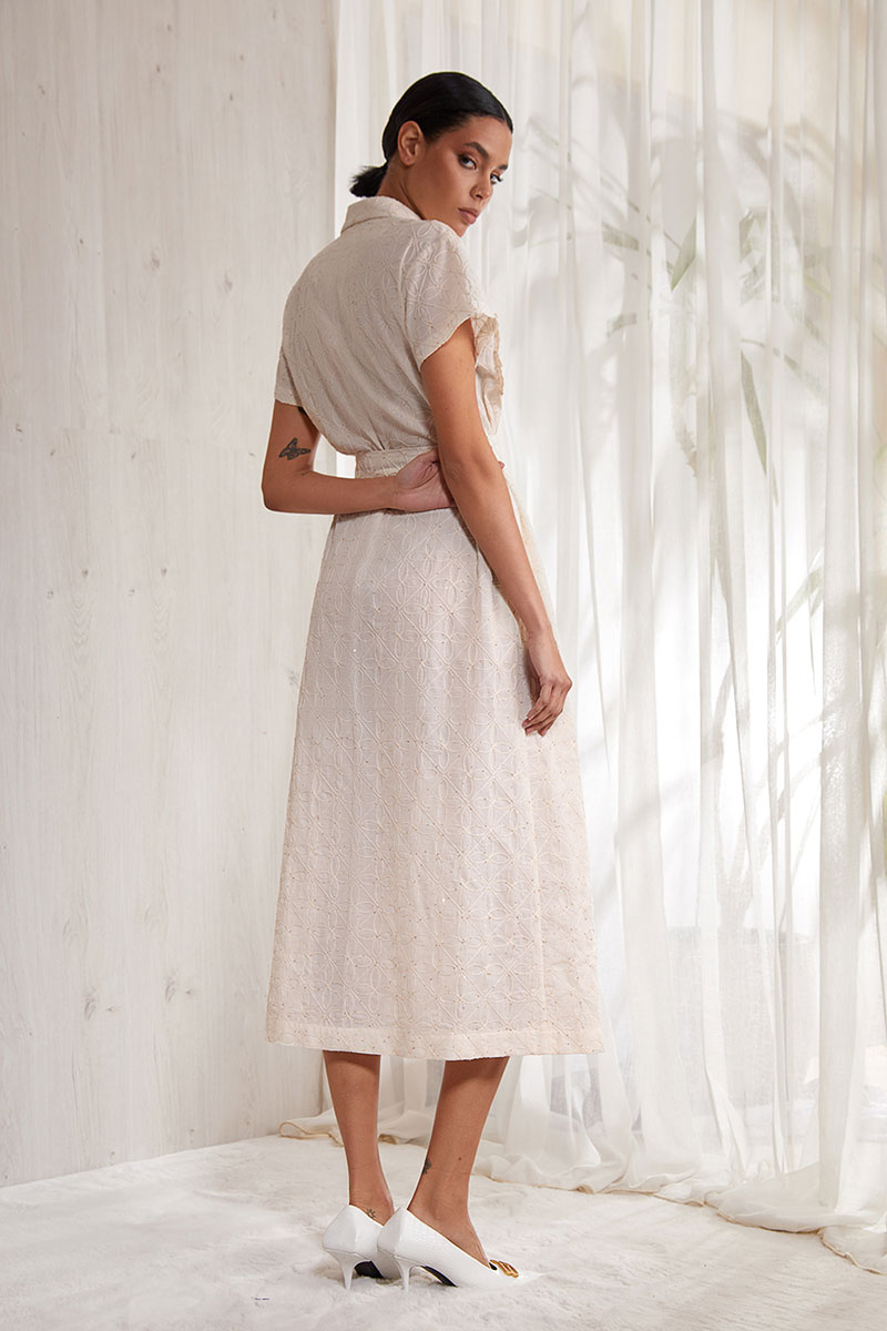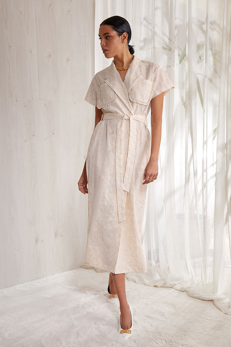 Платье А-образного силуэта, выполнено из тонкого кружевного фактурного хлопка ( шитье). Длина мidi. Двубортная застежка на петли и пуговицы. Воротник пиджачного типа. На полочке накладные карманы, декорированы хлопковым кружевом. Спинка прямая. В боковых швах карманы. Чуть спущенная линия плеча. Прямой короткий рукав.