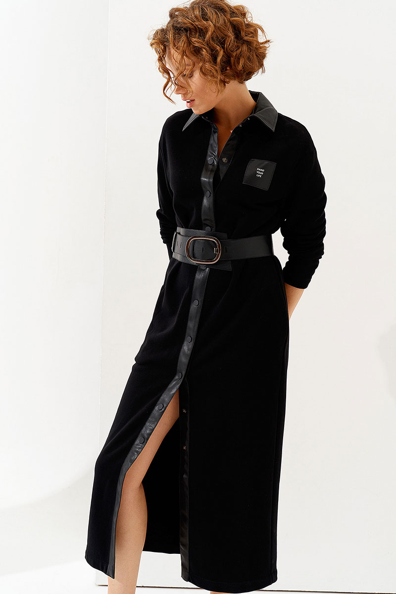 Стильное трикотажное платье прямого кроя с отделкой из экокожи, в боковых швах имеются карманы. Без ремня.