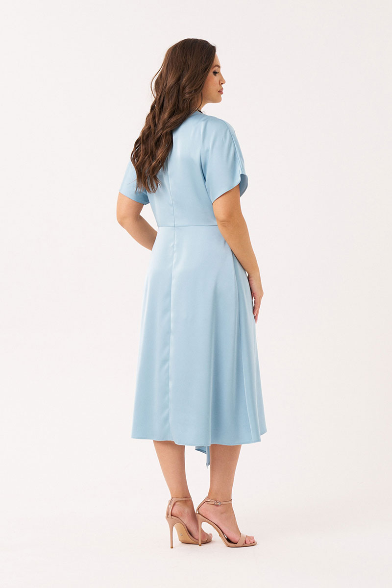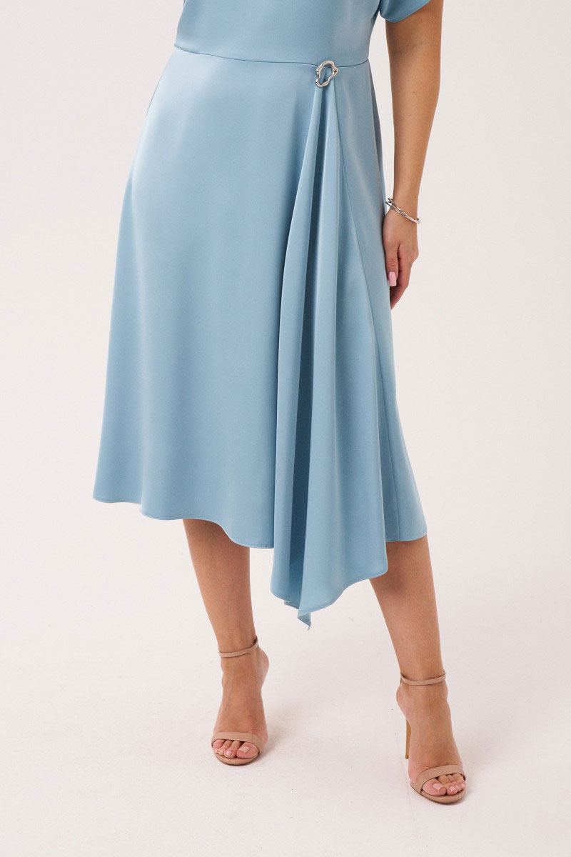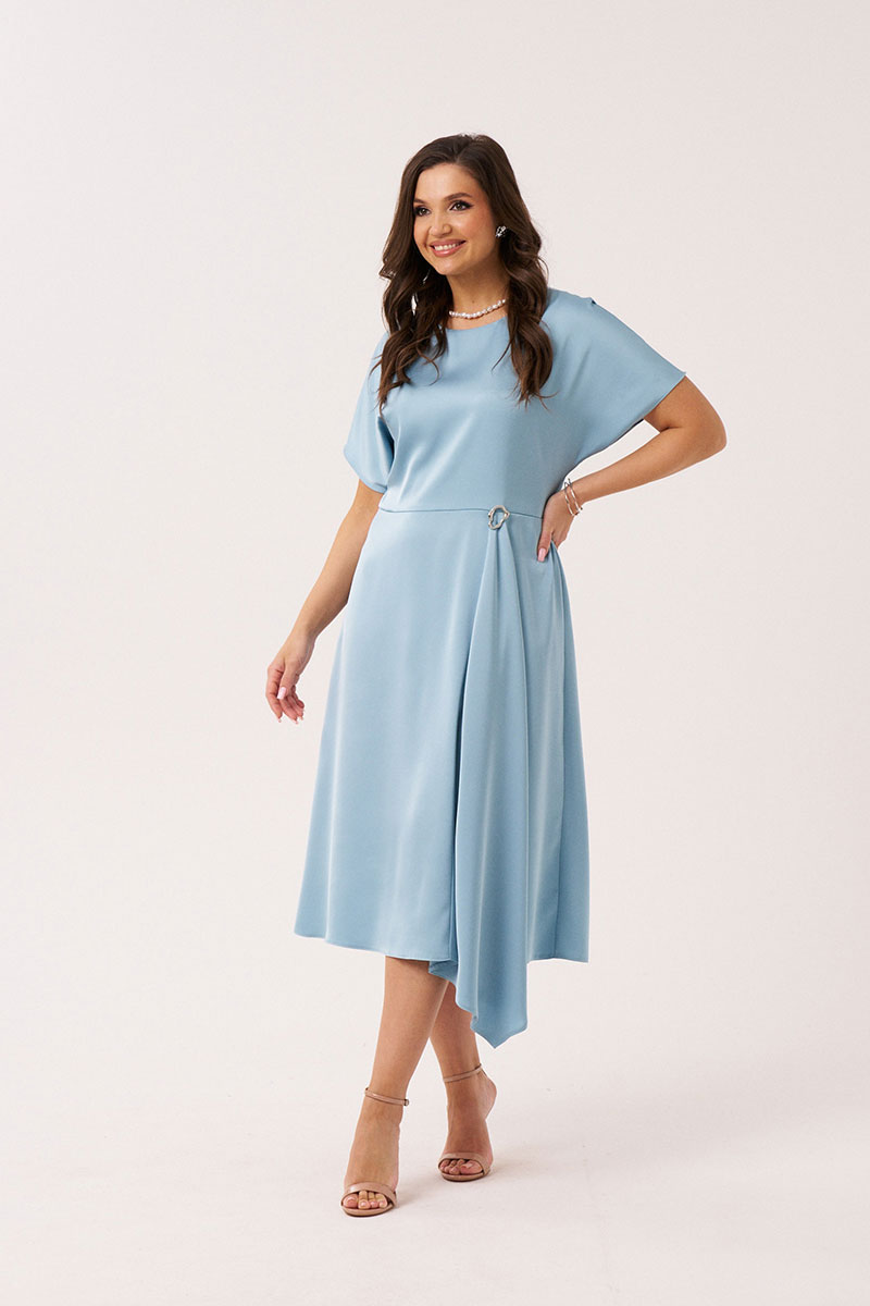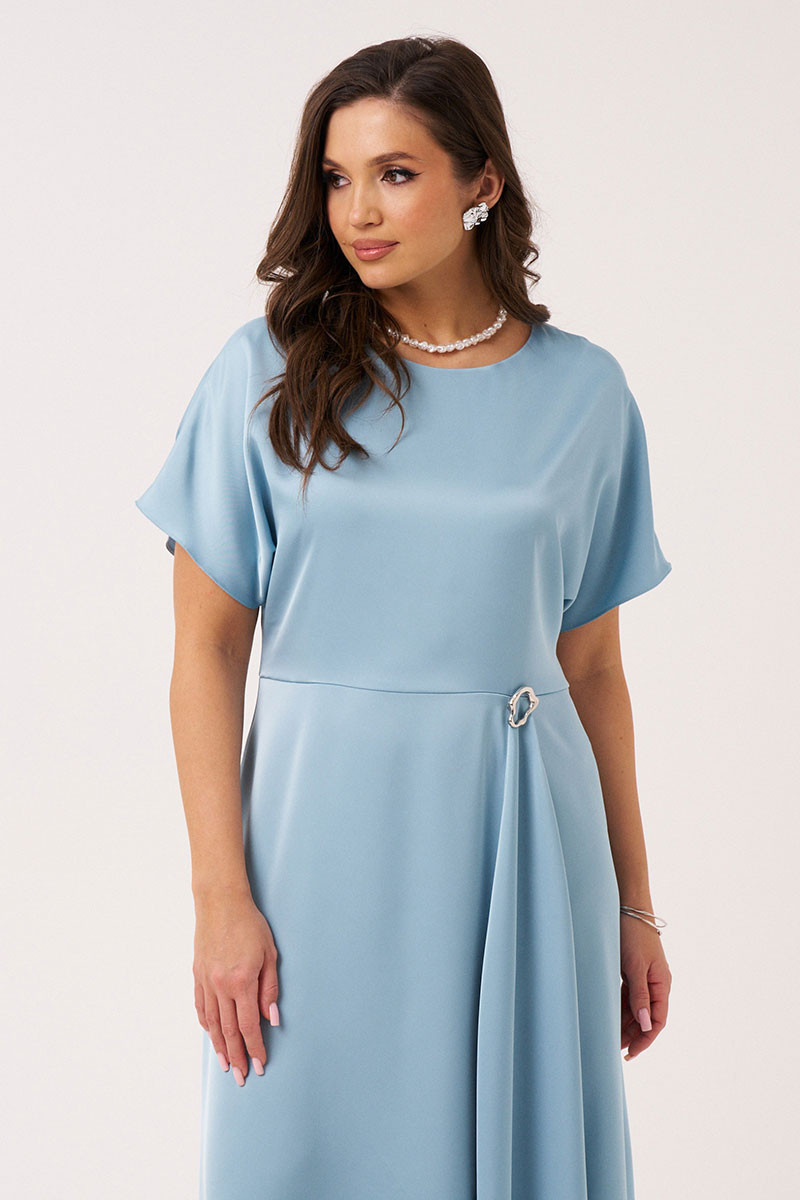 Платье женское из лёгкой струящейся ткани с блеском для торжественных случаев. Платье полуприлегающего силуэта. Платье отрезное по линии талии. Лиф спинки со средним швом и потайной застежкой-молнией в шве. Переднее полотнище юбки имеет два рельефа идущих от талии до низа изделия. Заднее полотнище юбки со средним швом. Платье по линии талии украшено декоративной брошью, что придает платью изысканный вид и делает его еще более утонченным. Рукав цельнокроеный, короткий. Линия плеча слегка спущена. Красивое и очень удобное платье, которое станет вашим фаворитом. В данном платье вы будете неотразимы.