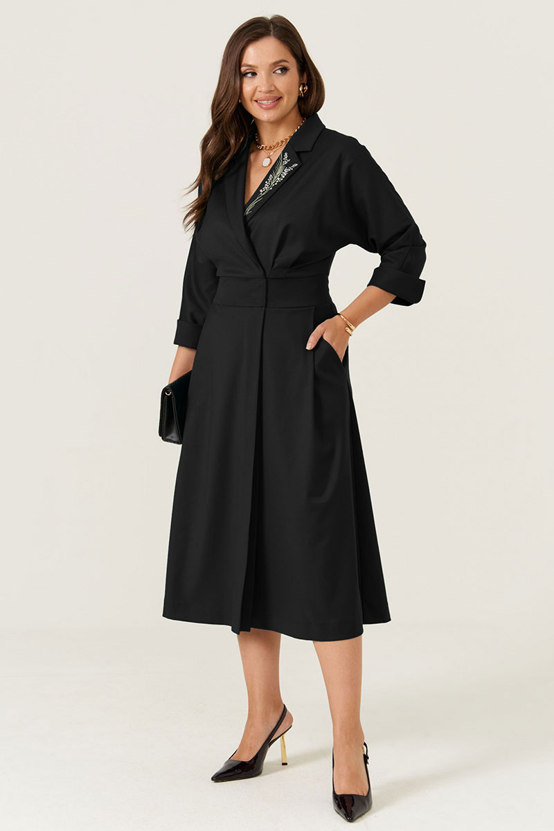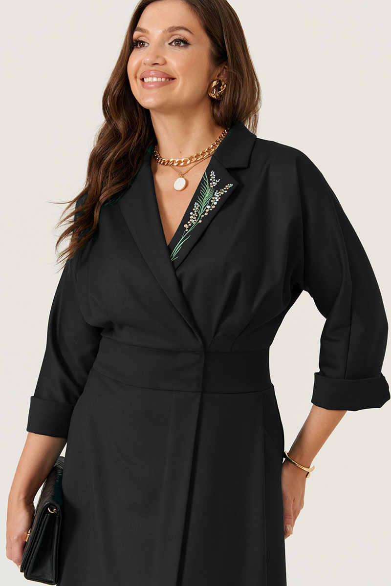 Женское платье из хлопчатобумажной ткани черного цвета для повседневной носки. Модель выполнена в свободном силуэте, расширяющемся к низу, длиной миди. Воротник обработан пиджачным стилем с лацканами, на одном из которых выполнена вышивка мимозы, придающая образу изящность.