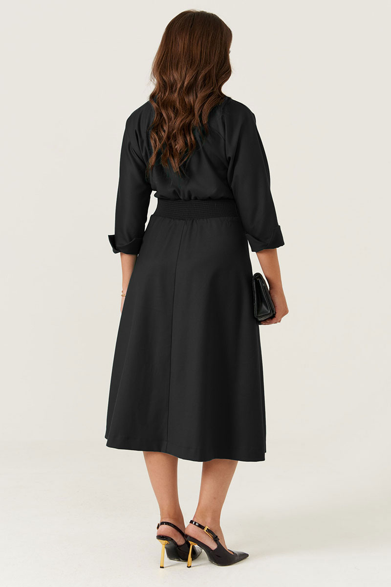 Платье оснащено притачным поясом с складками по его краю, что подчеркивает талию. Смещенная бортовая застежка на петли и пуговицы обеспечивает удобство и стильный внешний вид. Передняя часть юбки украшена двумя боковыми карманами для практичности. В задней части пояса вставлена резинка, которая обеспечивает хорошую посадку и комфорт при носке. Рукава цельнокроеные с обработкой отлётной манжетой создают аккуратный и завершенный вид.