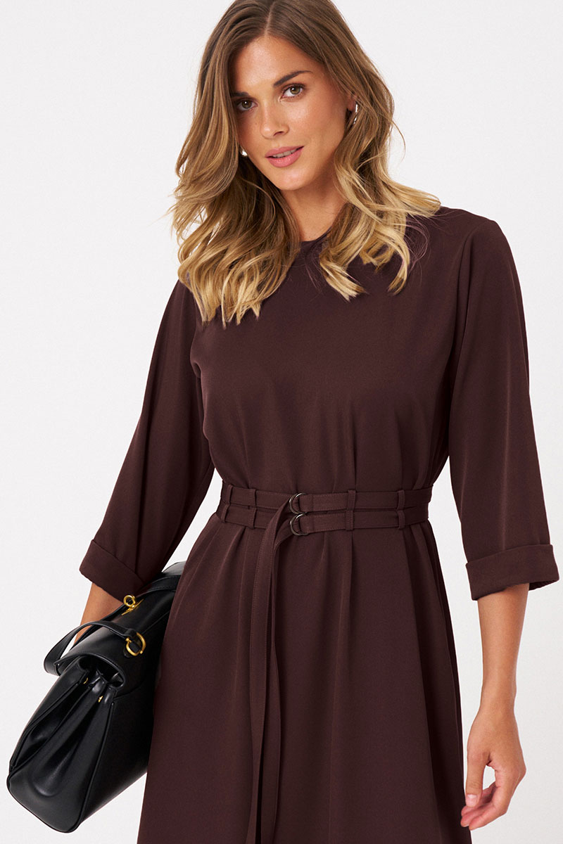 Это женское платье из поливискозной ткани идеально подходит для повседневной носки. Модель отличается комфортным кроем и стильным дизайном. Перед платья украшен защипами и шлевками, что позволяет просовывать два ряда поясов для создания разнообразных образов и акцентов. Спинка выполнена со средним швом и также украшена защипами и шлевками, а в среднем шве расположена застежка на тесьму-молнию для удобства надевания. Горловина чуть расширенная, придающая образу легкую элегантность. Рукава втачные, чуть ниже локтя, завершены отлетной манжетой, что добавляет изделию аккуратности и завершенности. А изящный бордовый оттенок платья позволяет его носить на различные случаи.