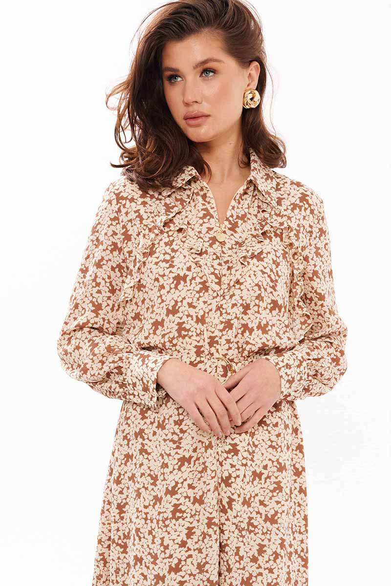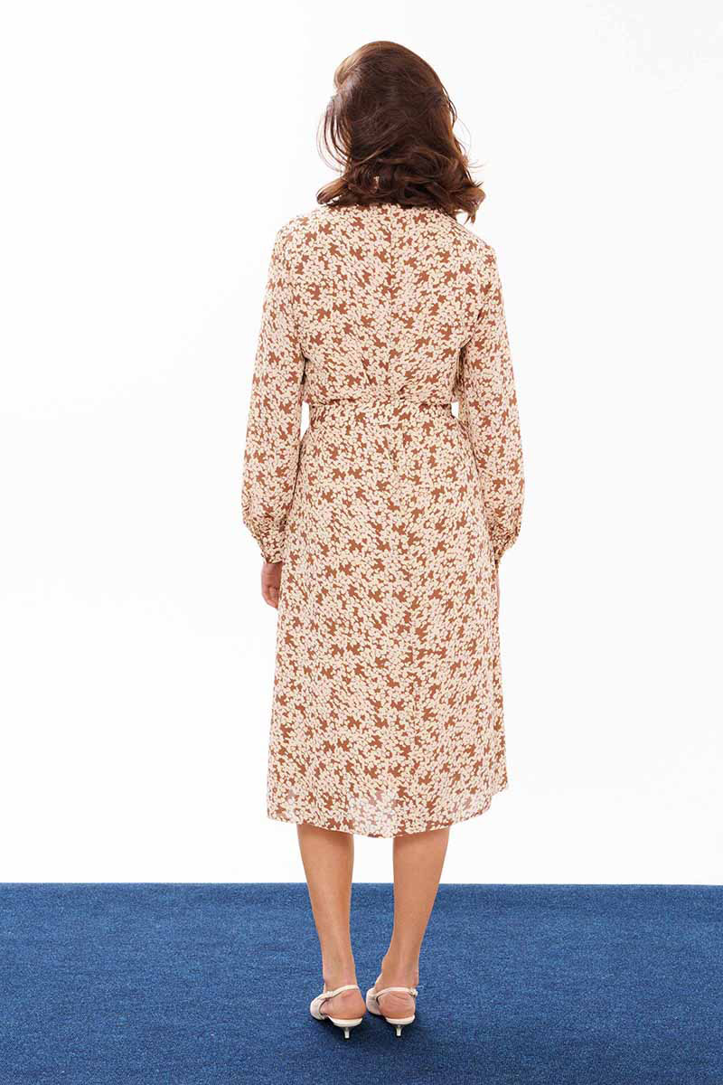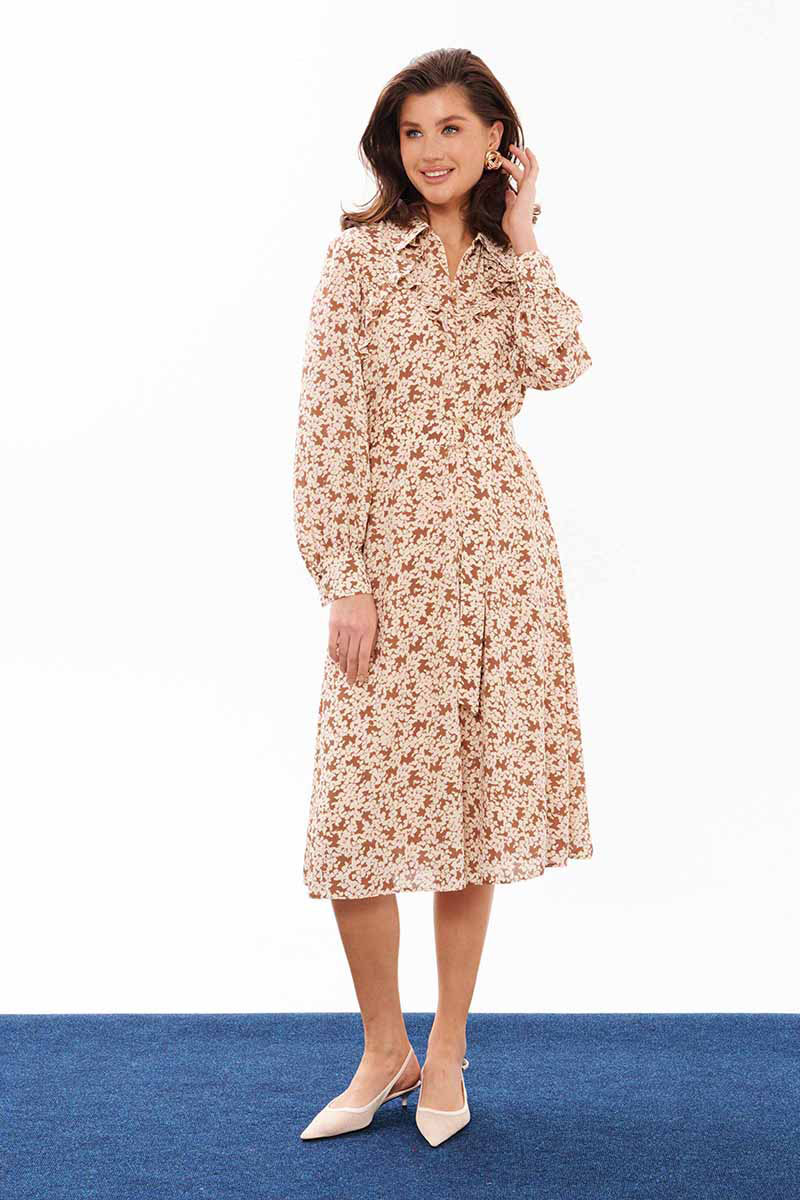 Платье женское из струящейся ткани для повседневной носки. Платье трапециевидного силуэта. Перед со средним швом и потайной застежкой-молнией в шве, также имеются отрезные детали с рюшами от горловины до проймы и до среднего шва. Спинка со средним швом. Горловина обработана рубашечным воротником с отрезной стойкой. Рукава втачные длинные, низ рукава имеет небольшую сборку, обработан притачной манжетой с застёжкой на обметанные петли и пуговицы. Длина платья миди. Платье на натуральной вискозной подкладке. Стильное и модное платье в котором вы обязательно будете красиво смотреться. За счет натуральной подкладки платье будет комфортное к телу, что будет создавать лёгкость и воздушность.