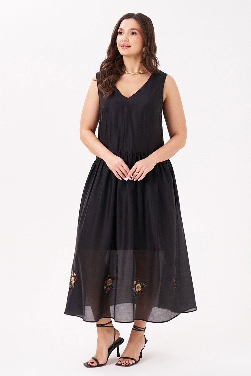 Платье женское из поливискозной ткани для повседневной носки. Платье, расширенное к низу. Платье отрезное по линии талии со сборкой по юбке. Лив переда имеет две нагрудные вытачки. Переднее полотнище юбки имеет дизайнерскую вышивку в виде замечательных цветов. Горловина переда и спинки V-образная. Платье на бретелях. Платье на поливискозной подкладке. Стильное и очень обворожительное платье, которое никого не оставит равнодушным. Данное платье будет отлично сидеть на любой фигуре, а также будет притягивать восхищенные взгляды прохожих.