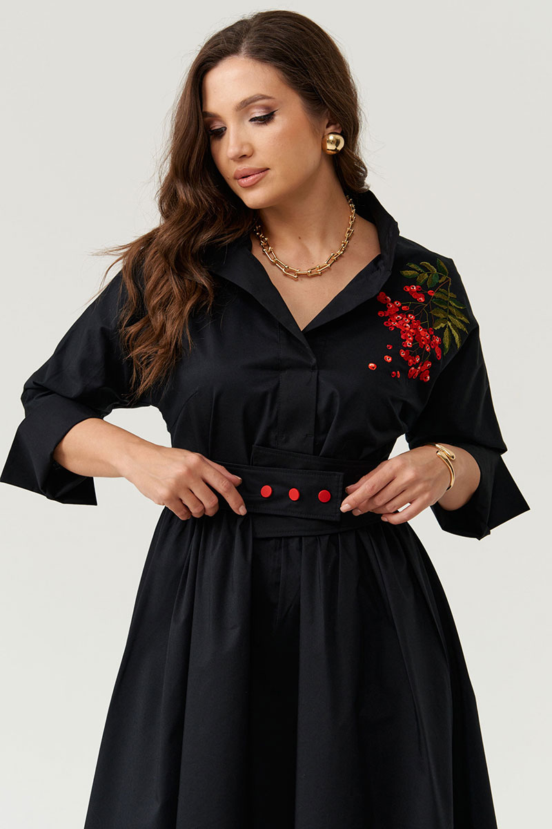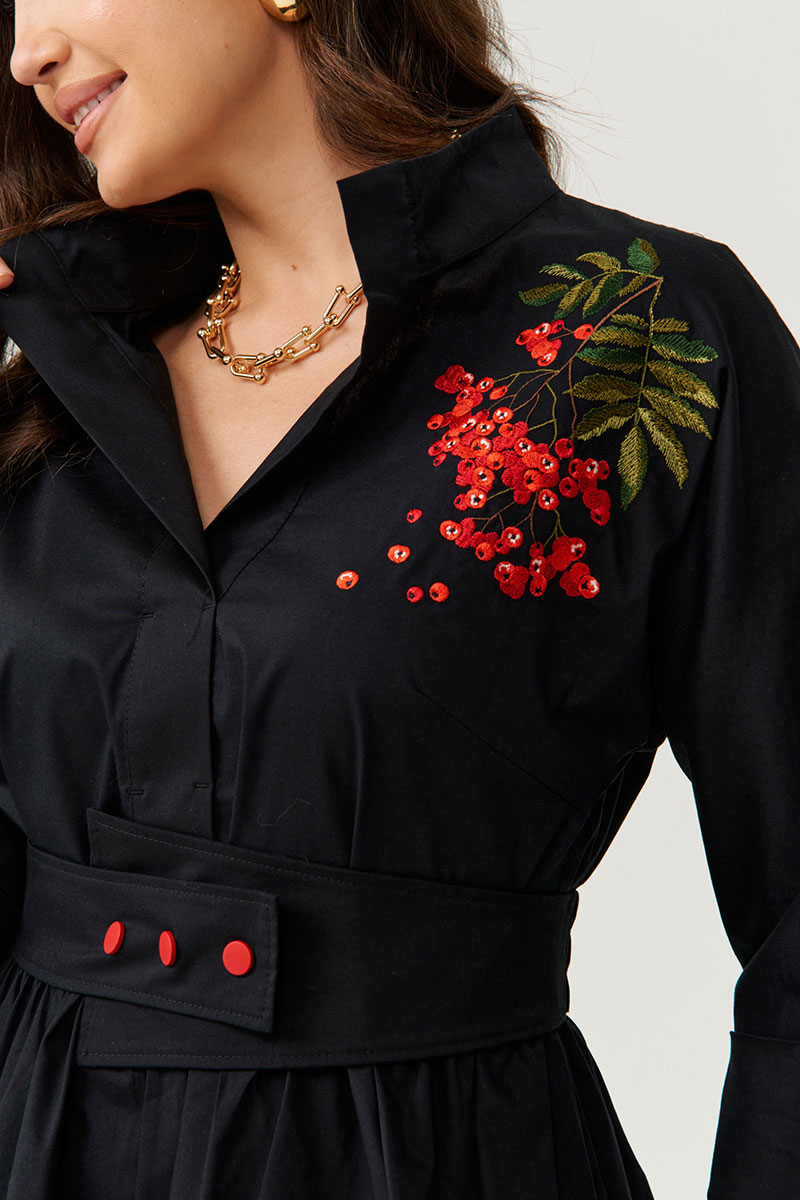 Платье женское из хлопковой ткани для повседневной носки. Без подкладки. Платье полуприлегающего силуэта. Платье отрезное по линии талии и имеет небольшую сборку. Перед имеет две нагрудные вытачки, а также дизайнерскую вышивку в виде веточки рябины. В боковых швах располагаются прорезные карманы. Горловина обработана втачной планкой с нахлестом в V-образной горловине, а также воротником-стойкой. Рукава втачные, длиной. ниже локтя. Низ рукава обработан отлетной манжетой. Юбка платья расширенная. Платье укомплектовано поясом из основной ткани изделия. Пояс со вставкой на резинке, застежка на кнопки. Длина изделия миди. Данное платье красного оттенка станет незаменимой вещью в вашем гардеробе, оно отлично будет сидеть и смотреться на любой фигуре.