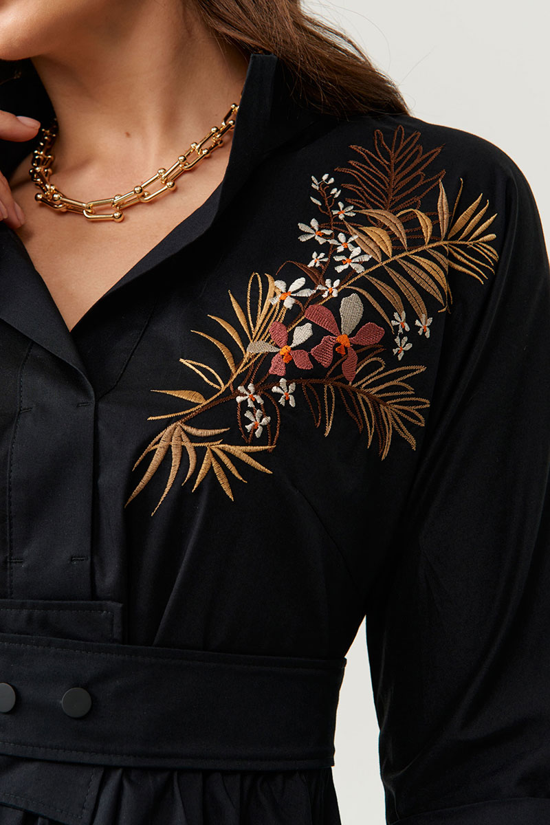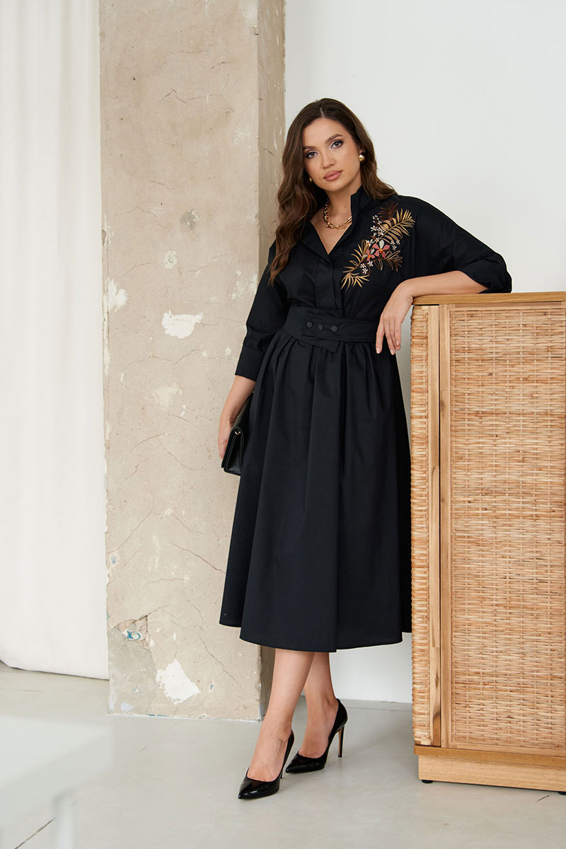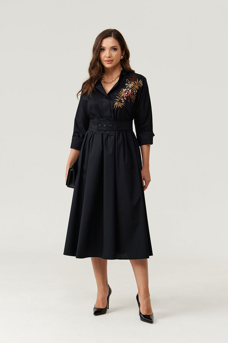 Платье женское из хлопковой ткани для повседневной носки. Без подкладки. Платье полуприлегающего силуэта. Платье отрезное по линии талии и имеет небольшую сборку. Перед имеет две нагрудные вытачки, а также дизайнерскую вышивку в виде веточек с цветочками. В боковых швах располагаются прорезные карманы. Горловина обработана втачной планкой с нахлестом в V-образной горловине, а также воротником-стойкой. Рукава втачные, длиной. ниже локтя. Низ рукава обработан отлетной манжетой. Юбка платья расширенная. Платье укомплектовано поясом из основной ткани изделия. Пояс со вставкой на резинке, застежка на кнопки. Длина изделия миди. Данное платье коричневого оттенка станет незаменимой вещью в вашем гардеробе, оно отлично будет сидеть и смотреться на любой фигуре.