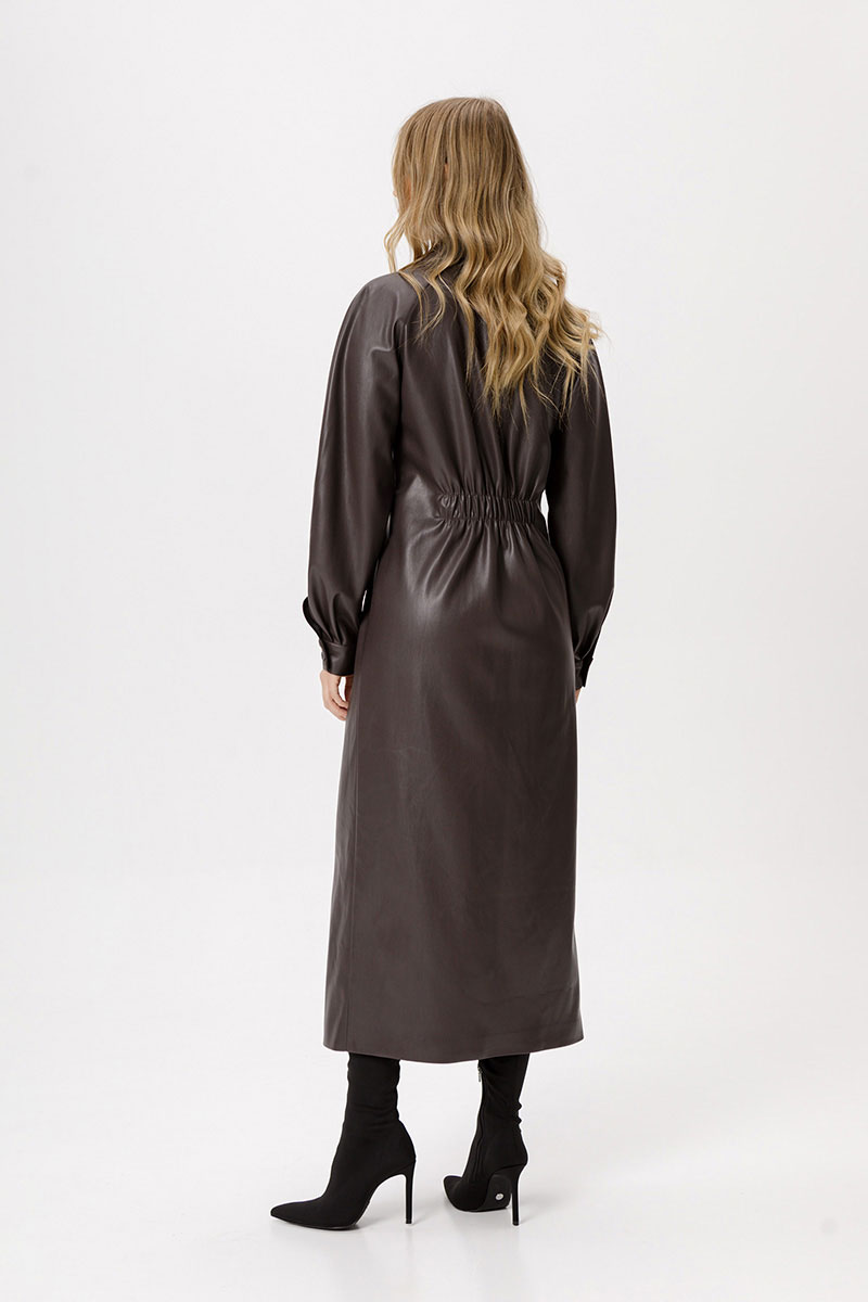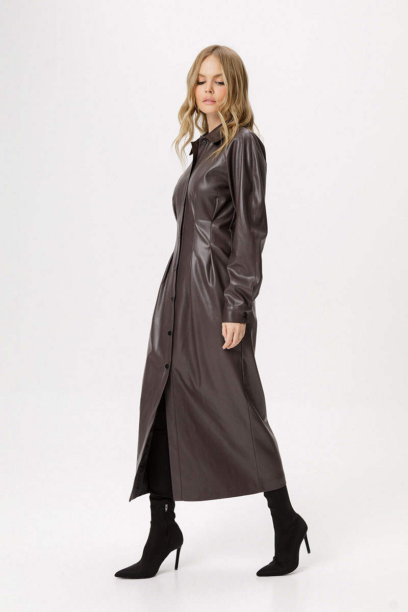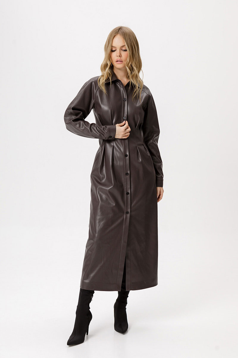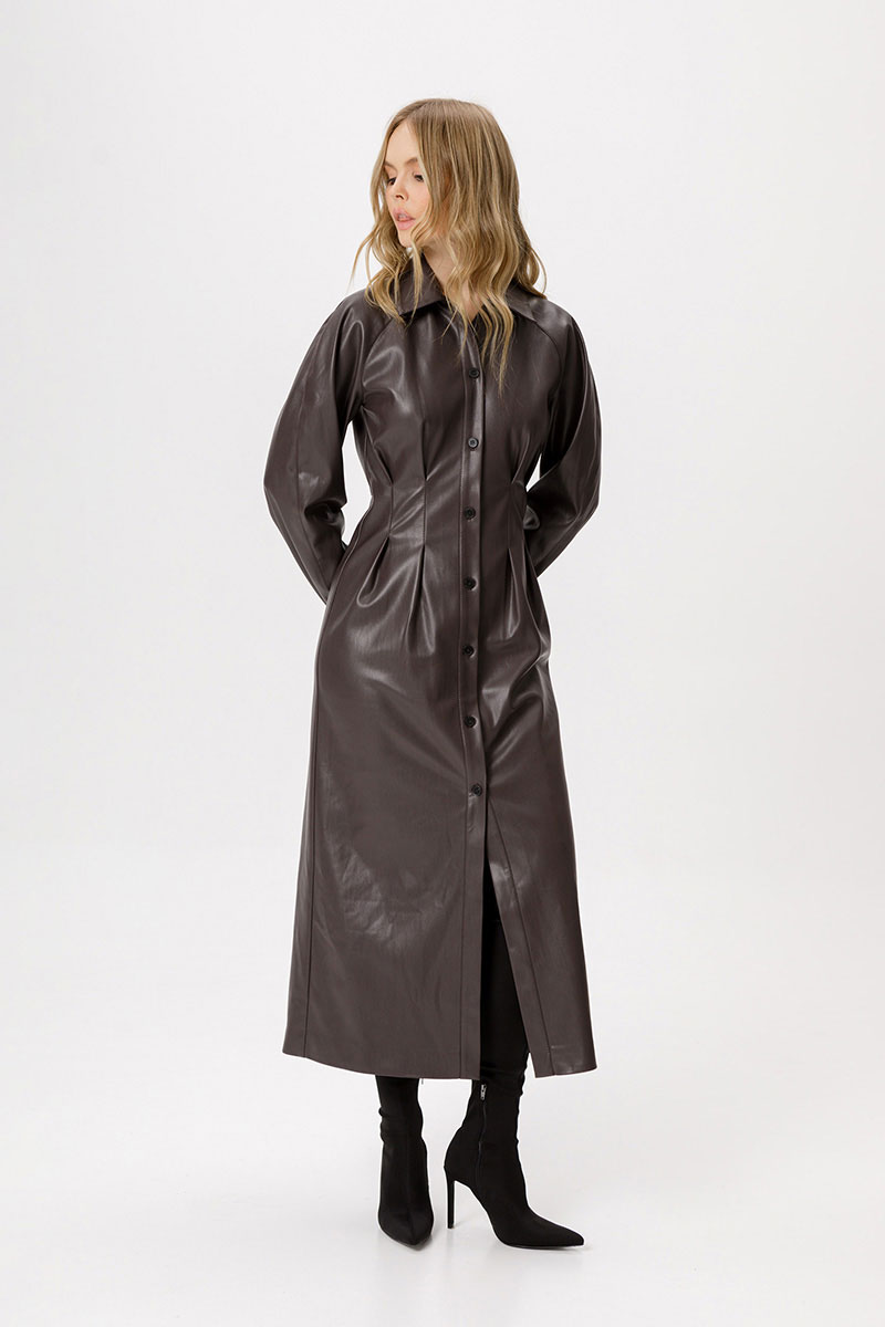 Платье из экокожи длины миди. Детали: полуприлегающий силуэт, застроченные складки по переду, спинка на резинке, рубашечный воротник, рукава покроя реглан, застёжка на петли и пуговицы, платье на подкладке.