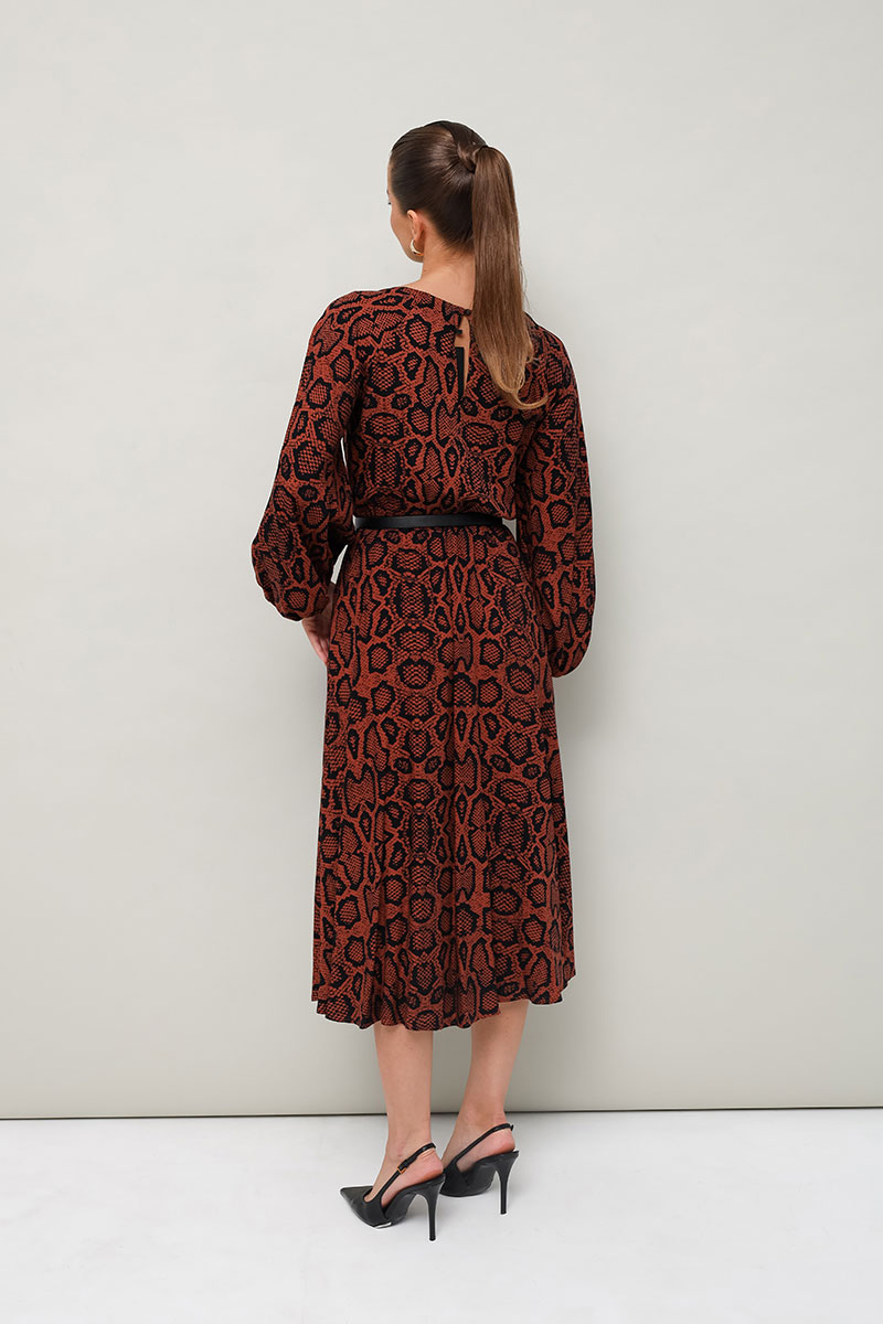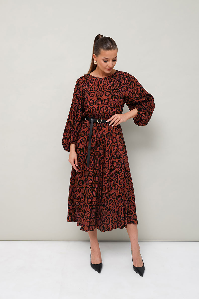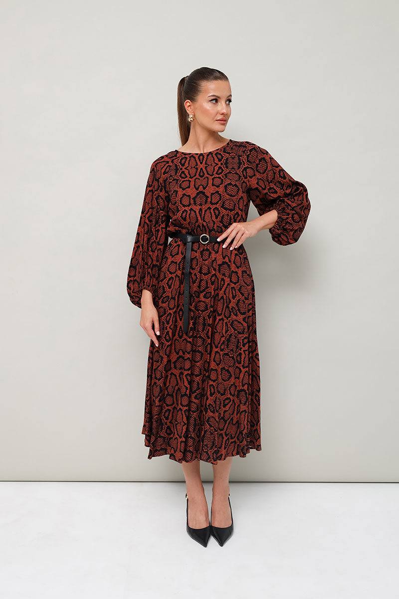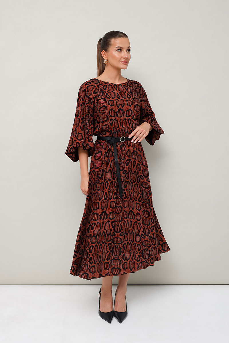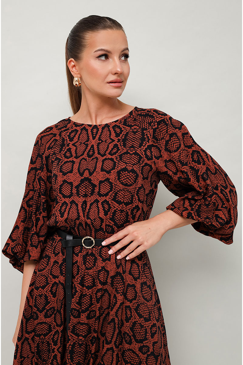 Платье отрезное по линии талии на резинке, выполнено из вискозы с принтом рептилии. Горловина с